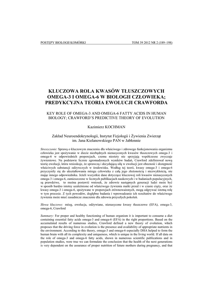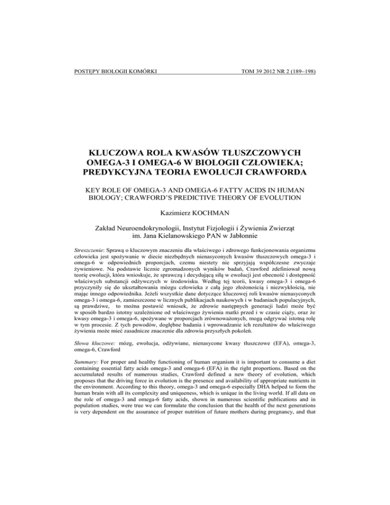 POSTĘPY BIOLOGII KOMÓRKI TOM 39 2012 NR 2 (189198) KLUCZOWA ROLA KWASÓW TŁUSZCZOWYCH OMEGA-3 I OMEGA-6 W BIOLOGII CZŁOWIEKA; PREDYKCYJNA TEORIA EWOLUCJI CRAWFORDA KEY ROLE OF OMEGA-3 AND OMEGA-6 FATTY ACIDS IN HUMAN BIOLOGY; CRAWFORD’S PREDICTIVE THEORY OF EVOLUTION Kazimierz KOCHMAN Zakład Neuroendokrynologii, Instytut Fizjologii i Żywienia Zwierząt im. Jana Kielanowskiego PAN w Jabłonnie Streszczenie: Sprawą o kluczowym znaczeniu dla właściwego i zdrowego funkcjonowania organizmu człowieka jest spożywanie w diecie niezbędnych nienasyconych kwasów tłuszczowych omega-3 i omega-6 w odpowiednich proporcjach, czemu niestety nie sprzyjają współczesne zwyczaje żywieniowe. Na podstawie licznie zgromadzonych wyników badań, Crawford zdefiniował nową teorię ewolucji, która wnioskuje, że sprawczą i decydującą siłą w ewolucji jest obecność i dostępność właściwych substancji odżywczych w środowisku. Według tej teorii, kwasy omega-3 i omega-6 przyczyniły się do ukształtowania mózgu człowieka z całą jego złożonością i niezwykłością, nie mając innego odpowiednika. Jeżeli wszystkie dane dotyczące kluczowej roli kwasów nienasyconych omega-3 i omega-6, zamieszczone w licznych publikacjach naukowych i w badaniach populacyjnych, są prawdziwe, to można postawić wniosek, że zdrowie następnych generacji ludzi może być w sposób bardzo istotny uzależnione od właściwego żywienia matki przed i w czasie ciąży, oraz że kwasy omega-3 i omega-6, spożywane w proporcjach zrównoważonych, mogą odgrywać istotną rolę w tym procesie. Z tych powodów, dogłębne badania i wprowadzanie ich rezultatów do właściwego żywienia może mieć zasadnicze znaczenie dla zdrowia przyszłych pokoleń. Słowa kluczowe: mózg, ewolucja, odżywiane, nienasycone kwasy tłuszczowe (EFA), omega-3, omega-6, Crawford Summary: For proper and healthy functioning of human organism it is important to consume a diet containing essential fatty acids omega-3 and omega-6 (EFA) in the right proportions. Based on the accumulated results of numerous studies, Crawford defined a new theory of evolution, which proposes that the driving force in evolution is the presence and availability of appropriate nutrients in the environment. According to this theory, omega-3 and omega-6 especially DHA helped to form the human brain with all its complexity and uniqueness, which is unique in the living world. If all data on the role of omega-3 and omega-6 fatty acids, shown in numerous scientific publications and in population studies, were true we can formulate the conclusion that the health of the next generations is very dependent on the assurance of proper nutrition of future mothers during pregnancy, and that 190 K. KOCHMAN omega-3 and omega-6 in balanced proportions, can play the key role in this process. Therefore, the profound investigations of this problem and also introduction of balanced nutrition of omega-3 and omega-6, will be essential to maintain the good health of future generations. Key words: brain, evolution, nutrition, essential fatty acids (EFA), omega-3, omega-6, Crawford BUDOWA NASYCONYCH I NIENASYCONYCH KWASÓW TŁUSZCZOWYCH ORAZ BIOSYNTEZA Ω-3 I Ω-6 W TKANKACH ZWIERZĄT I LUDZI Kwasy tłuszczowe są związkami (lipidami) posiadającymi w swej strukturze łańcuch zawierający atomy węgla, od dwóch (C2) do 30 (C30), ze związanymi z nimi atomami wodoru oraz grupą karboksylową. Gdy dwa albo kilka atomów wodoru zostanie usuniętych z cząsteczki, powstaje jedno albo więcej wiązań podwójnych (C=C). Kwas oznaczony C16:1 informuje, że jest to jedno-nienasycony kwas tłuszczowy, który zawiera 16 atomów węgla i jeden punkt nienasycenia w cząsteczce, a kwas oznaczony C18:3 informuje, że jest to wielo-nienasycony kwas tłuszczowy posiadający 18 atomów węgla i 3 punkty nienasycenia. Należy podkreślić, że zarówno ilość, konformacja jak i usytuowanie wiązań podwójnych stanowi o własnościach biologicznych tego określonego nienasyconego kwasu tłuszczowego, jak również o jego stabilności. Konformacja cis w podwójnym wiązaniu między atomami węgla jest wówczas, gdy atomy wodoru zostały usunięte z tej samej strony łańcucha węglowego. Nienasycone kwasy tłuszczowe występują w naturze w konformacji cis i w tej formie są biologicznie aktywne w sposób optymalny, natomiast w konformacji trans występują w naturze bardzo rzadko. Jednakże, w sytuacji gdy takie naturalne kwasy tłuszczowe są ogrzewane do wysokiej temperatury (150-200ºC i wyższej), jak to się dzieje przy przemysłowym wytłaczaniu oleju roślinnego z nasion, atomy wodoru mogą przeskakiwać z jednej strony łańcucha węglowego na drugą, dając w efekcie konfigurację trans, przy której kwas traci swoje korzystne dla organizmu własności po spożyciu [14]. Nienasycone kwasów tłuszczowych są klasyfikowane według pozycji pierwszego podwójnego wiązania od strony metylowej łańcucha węglowego (ω), natomiast desaturację (przez enzymy desaturazy) oznacza się licząc pozycję atomu węgla od strony karboksylowej łańcucha (Δ), przy którym atomy wodoru są usunięte aby utworzyć podwójne wiązanie między atomami węgla, tym i następnym. Lipidy są najbardziej istotną częścią strukturalną w mózgu oraz tkance nerwowej i drugą co do ważności we wszystkich innych tkankach miękkich. Kwasy tłuszczowe egzogenne (EFA) są obecne w roślinach jako kwas linolowy (ω-6; LA) i α-linolenowy (ω-3; LNA); są one przekształcane w organizmie zwierzęcym albo człowieka do 20 i 22-C łańcuchowych kwasów z 4 i 6 LIPIDY W EWOLUCJI I FUNKCJI MÓZGU 191 podwójnymi wiązaniami. Człowiek i zwierzęta nie posiadają desaturaz Δ-15 oraz Δ-12 (ryc. 1 i 2). Enzymy desaturaza Δ-6, której biosyntezę koduje gen FADS2, oraz desaturaza Δ-5, którą koduje gen FADS1, wprowadzają podwójne wiązania, odpowiednio, do węgla 6 albo 5, licząc od karboksylowego końc