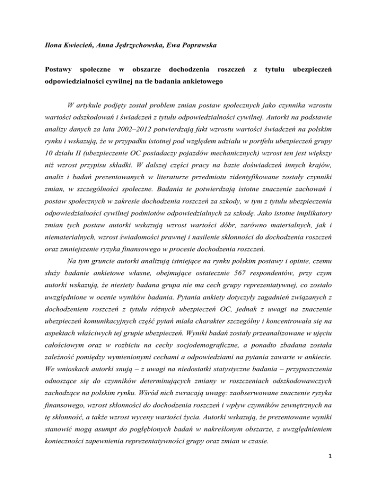 Ilona Kwiecień, Anna Jędrzychowska, Ewa Poprawska Postawy społeczne w obszarze dochodzenia roszczeń z tytułu ubezpieczeń odpowiedzialności cywilnej na tle badania ankietowego W artykule podjęty został problem zmian postaw społecznych jako czynnika wzrostu wartości odszkodowań i świadczeń z tytułu odpowiedzialności cywilnej. Autorki na podstawie analizy danych za lata 2002–2012 potwierdzają fakt wzrostu wartości świadczeń na polskim rynku i wskazują, że w przypadku istotnej pod względem udziału w portfelu ubezpieczeń grupy 10 działu II (ubezpieczenie OC posiadaczy pojazdów mechanicznych) wzrost ten jest większy niż wzrost przypisu składki. W dalszej części pracy na bazie doświadczeń innych krajów, analiz i badań prezentowanych w literaturze przedmiotu zidentyfikowane zostały czynniki zmian, w szczególności społeczne. Badania te potwierdzają istotne znaczenie zachowań i postaw społecznych w zakresie dochodzenia roszczeń za szkody, w tym z tytułu ubezpieczenia odpowiedzialności cywilnej podmiotów odpowiedzialnych za szkodę. Jako istotne implikatory zmian tych postaw autorki wskazują wzrost wartości dóbr, zarówno materialnych, jak i niematerialnych, wzrost świadomości prawnej i nasilenie skłonności do dochodzenia roszczeń oraz zmniejszenie ryzyka finansowego w procesie dochodzenia roszczeń. Na tym gruncie autorki analizują istniejące na rynku polskim postawy i opinie, czemu służy badanie ankietowe własne, obejmujące ostatecznie 567 respondentów, przy czym autorki wskazują, że niestety badana grupa nie ma cech grupy reprezentatywnej, co zostało uwzględnione w ocenie wyników badania. Pytania ankiety dotyczyły zagadnień związanych z dochodzeniem roszczeń z tytułu różnych ubezpieczeń OC, jednak z uwagi na znaczenie ubezpieczeń komunikacyjnych część pytań miała charakter szczególny i koncentrowała się na aspektach właściwych tej grupie ubezpieczeń. Wyniki badań zostały przeanalizowane w ujęciu całościowym oraz w rozbiciu na cechy socjodemograficzne, a ponadto zbadana została zależność pomiędzy wymienionymi cechami a odpowiedziami na pytania zawarte w ankiecie. We wnioskach autorki snują – z uwagi na niedostatki statystyczne badania – przypuszczenia odnoszące się do czynników determinujących zmiany w roszczeniach odszkodowawczych zachodzące na polskim rynku. Wśród nich zwracają uwagę: zaobserwowane znaczenie ryzyka finansowego, wzrost skłonności do dochodzenia roszczeń i wpływ czynników zewnętrznych na tę skłonność, a także wzrost wyceny wartości życia. Autorki wskazują, że prezentowane wyniki stanowić mogą asumpt do pogłębionych badań w nakreślonym obszarze, z uwzględnieniem konieczności zapewnienia reprezentatywności grupy oraz zmian w czasie. 1 Słowa kluczowe: ubezpieczenie odpowiedzialności cywilnej, dochodzenie roszczeń, rynek ubezpieczeń, kultura roszczeniowa. Wprowadzenie Problem wzrostu liczby i wartości roszczeń z tytułu ubezpieczeń odpowiedzialności cywilnej jest w ostatnich latach często analizowany z uwagi na istotne implikacje dla rynku ubezpieczeń. Poruszane są zwłaszcza konsekwencje zmian w regulacjach prawnych dotyczących roszczeń za szkody na osobie, w tym obejmujących wydłużenie okresów przedawnienia roszczeń oraz wprowadzenie szczególnego przepisu dopuszczającego wnoszenie roszczeń o zadośćuczynienie za ból i cierpienie przez bliskich osoby zmarłej, a także kwestie dotyczące odszkodowania z tytułu najmu pojazdu zastępczego. W badaniach wskazuje się wiele czynników wpływających na wzrost liczby roszczeń, w tym prawne, ekonomiczne i społeczne1. Zmiany postaw społecznych postrzegane są jako jedna z istotnych grup czynników, co potwierdzają liczne badania z rynku amerykańskiego i europejskiego2, a także raporty Assosiation of British Insurers (ABI)3. Ponieważ także na polskim rynku obserwujemy wzrost wartości wypłacanych świadczeń, większą skłonność do dochodzenia roszczeń i rozwój usług kancelarii odszkodowawczych, istotnymi zagadnieniami badawczymi są kształtowanie się postaw społecznych w obszarze dochodzenia roszczeń oraz dostrzegane na rynku polskim czynniki, wskazywane jako stymulanty wzrostu liczby roszczeń na innych rynkach. Kwestie te są niezmiernie istotne z punktu widzenia funkcjonowania i rozwoju rynku ubezpieczeń odpowiedzialności cywilnej. 1 Por. T. Holzheu, R. Lechner, Commercial liability: a challenge for businesses and their insurers, „Sigma” 2009, nr 5. 2 Por. F. Furedi, Courting Mistrust: The hidden growth of a culture of litigation in Britain; Centre for Policy Studies, London 1999; J. Lowe (ed.), The cost of damages culture. Working party report, http://www.actuaries.org.uk/sites/all/files/documents/pdf/lowe.pdf; S. Narita, Product liability claims in Europe, Swiss Reinsurance Company Ltd. 1997; U. Leimbacher et al., The globalisation of collective redress: Consequences for the insurance industry, Swiss Re 2009; R. Enz, T. Holzheu, The economics of liability losses – insuring the moving target, „Sigma” 2004, nr 6; J.T. Schmit, Factors Likely to Influence Tort Litigation in the European Union, „The Geneva Papers on Risk and Insurance – Issues and Practice” 2009, nr 31, s. 304–313; A. Carmignani, S. Giacomelli, Too many lawyers? Litigation in Italian civil courts, „Temi di Discussione” nr 745 (February 2010), http://www.astrid-online.it/--giustizi/GIUSTIZIA-/Studi--ric/determinanti-litigiosit--BdI.pdf. 3 Por. Bodily Injury Awards Studies z 1997, 1999 and 2003; IUA/ABI Fourth UK Bodily Injury Awards Study, 2007; Written evidence from the Association of British Insurers (ABI), http://www.publications.parliament.uk/pa/cm201011/cmselect/cmtran/591/591we05.htm. 2 Problemy te są przedmiotem analizy podjętej w niniejszym artykule. Autorki badają aktualne tendencje panujące w obszarze ubezpieczeń odpowiedzialności cywilnej na polskim rynku, i