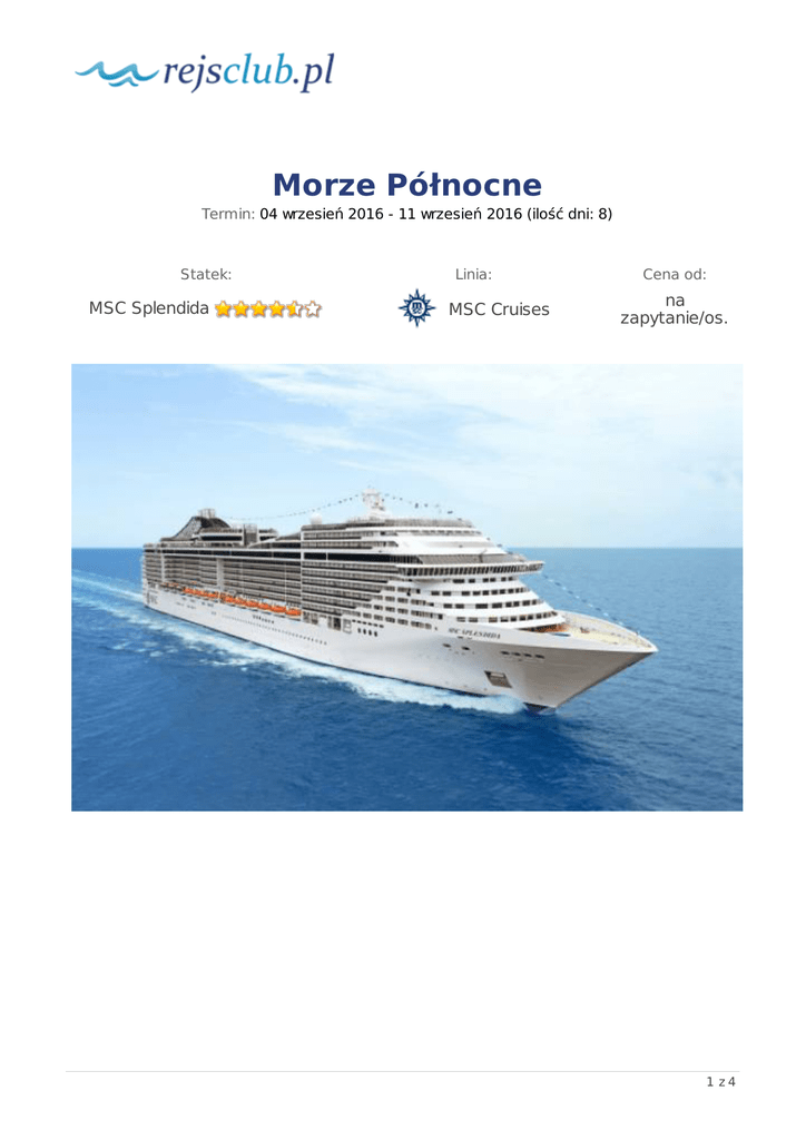 Morze Północne Termin: 04 wrzesień 2016 - 11 wrzesień 2016 (ilość dni: 8) Statek: MSC Splendida Linia: MSC Cruises Cena od: na zapytanie/os. 1 z4 TRASA REJSU Data Port Wpłynięcie Wypłynięcie Legenda dzień 1 niedziela 04.09.2016 Hamburg Niemcy --:-- 18:30 dzień 2 poniedziałek 05.09.2016 Dzień na morzu --:-- --:-- dzień 3 wtorek 06.09.2016 Hawr Francja 08:00 22:00 dzień 4 środa 07.09.2016 Southampton Wielka Brytania 08:00 18:00 dzień 5 czwartek 08.09.2016 Zeebrugge, Bruksela Belgia 09:00 19:00 dzień 6 piątek 09.09.2016 Amsterdam Holandia 09:00 --:-- dzień 7 sobota 10.09.2016 Amsterdam Holandia --:-- 09:00 dzień 8 niedziela 11.09.2016 Hamburg Niemcy 07:00 --:-- 2 z4 CENNIK Cena katalogowa Suite Aurea €1 579.00 Ocean View Bella €879.00 Inside Bella €629.00 Balcony Cabin Aurea €1 429.00 Balcony Cabin Fantastica €1 129.00 Balcony Cabin Bella €1 029.00 Ocean View Fantastica €979.00 Inside Fantastica €709.00 Deluxe Suite €1 879.00 Executive And Family Suite €2 229.00 Opłaty portowe Cena promocyjna €120.00 Uwaga! Ceny za osobę w kabinie dwuosobowej. Cena zawiera: zakwaterowanie w kabinie wybranej kategorii; wyżywienie - 3 główne posiłki, przekąski między posiłkami, bufet lub przekąski o północy; napoje serwowane do śniadania i w bufetach samoobsługowych; serwis bagażowy podczas wejścia i zejścia ze statku; serwis kabinowy; korzystanie ze wszystkich urządzeń sportowo - rekreacyjnych znajdujących się na pokładzie statku (basen, jacuzzi, sala fitness, itp.); udział we wszystkich imprezach organizowanych na statku (przedstawienia w teatrze, koncerty, programy animacyjne itp.). Cena nie zawiera: kosztów dojazdu do portu; opłat portowych; ewentualnych noclegów w hotelu przed/po rejsie i transferów; wycieczek fakultatywnych w trakcie rejsu; korzystania z barów, mini baru w kabinie oraz napojów zamawianych w restauracji; korzystania z punktów usługowych (fryzjer, pralnia, fotograf, salon piękności i odnowy biologicznej, internet) i wydatków osobistych; napiwków dla obsługi na statku (kwota uzależniona od długości rejsu); ubezpieczenia KL, NNW i bagaż, kosztów wiz (tam gdzie wymagane). Uwagi: na wszystkich rejsach MSC Cruises można zarezerwować pakiety all inclusive: Allegrissimo 24h: 3 z4 26€/os./dzień i 12€/dziecko/dzień; Allegrissimo Premium: 44€/os./dzień i 21€/dziecko/dzień (pakiet musi być wykupiony przez każdą osobę zakwaterowaną w kabinie - można zakupić w biurze przed rejsem). Na Państwa życzenie zarezerwujemy przelot, transfery do/z portu, parking, dodatkowe noclegi oraz zadbamy o odpowiednie ubezpieczenie podróżne. 4 z4