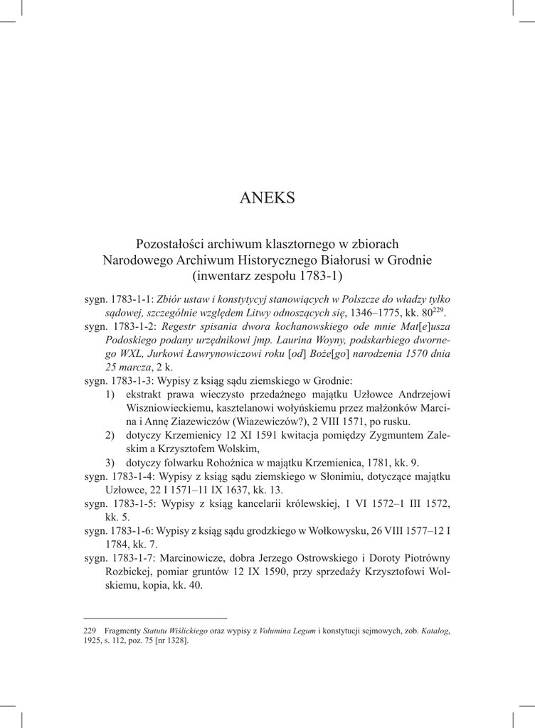 ANEKS Pozostałości archiwum klasztornego w zbiorach Narodowego Archiwum Historycznego Białorusi w Grodnie (inwentarz zespołu 1783-1) sygn. 1783-1-1: Zbiór ustaw i konstytycyj stanowiących w Polszcze do władzy tylko sądowej, szczególnie względem Litwy odnoszących się, 1346–1775, kk. 80229. sygn. 1783-1-2: Regestr spisania dwora kochanowskiego ode mnie Mat[e]usza Podoskiego podany urzędnikowi jmp. Laurina Woyny, podskarbiego dwornego WXL, Jurkowi Ławrynowiczowi roku [od] Boże[go] narodzenia 1570 dnia 25 marcza, 2 k. sygn. 1783-1-3: Wypisy z ksiąg sądu ziemskiego w Grodnie: 1) ekstrakt prawa wieczysto przedażnego majątku Uzłowce Andrzejowi Wiszniowieckiemu, kasztelanowi wołyńskiemu przez małżonków Marcina i Annę Ziazewiczów (Wiazewiczów?), 2 VIII 1571, po rusku. 2) dotyczy Krzemienicy 12 XI 1591 kwitacja pomiędzy Zygmuntem Zaleskim a Krzysztofem Wolskim, 3) dotyczy folwarku Rohoźnica w majątku Krzemienica, 1781, kk. 9. sygn. 1783-1-4: Wypisy z ksiąg sądu ziemskiego w Słonimiu, dotyczące majątku Uzłowce, 22 I 1571–11 IX 1637, kk. 13. sygn. 1783-1-5: Wypisy z ksiąg kancelarii królewskiej, 1 VI 1572–1 III 1572, kk. 5. sygn. 1783-1-6: Wypisy z ksiąg sądu grodzkiego w Wołkowysku, 26 VIII 1577–12 I 1784, kk. 7. sygn. 1783-1-7: Marcinowicze, dobra Jerzego Ostrowskiego i Doroty Piotrówny Rozbickej, pomiar gruntów 12 IX 1590, przy sprzedaży Krzysztofowi Wolskiemu, kopia, kk. 40. 229 Fragmenty Statutu Wiślickiego oraz wypisy z Volumina Legum i konstytucji sejmowych, zob. Katalog, 1925, s. 112, poz. 75 [nr 1328]. 160 Aneks. Pozostałości archiwum klasztornego sygn. 1783-1-8: Wypisy z ksiąg grodzkich i ziemskich w Wołkowysku, 14 VI 1596–9 I 1824, kk. 49. sygn. 1783-1-9: Wypisy z ksiąg grodzkich Wołkowyska, 21 IV 1602–23 VI 1604, kk. 13. sygn. 1783-1-10: Wypisy z ksiąg grodzkich i ziemskich Słonimia, dotyczące majątku Uzłowce, 4 VIII 1612–5 I 1793, kk. 30. sygn. 1783-1-11: Akty sprzedaży dotyczące majątku Uzłowce: k. 1 – sprzedaż chłopa, 10 X 1612; k. 2 – sprzedaż Aleksandrze i Krzysztofowi Wiesiołowskim przez Annę Magdalenę z Woynów Piasecką, 27 XI 1635. sygn. 1783-1-12: Sprzedaż domu i ogrodu w Grodnie przez mieszczan grodzieńskich Zofię i Walentego Cejkliczów, nabywca mieszczanin Marcin Klimcewicz, 10 VII 1620. sygn. 1783-1-13: Wypisy z akt sądu ziemskiego w Brześciu Litewskim, 8 VIII 1620–14 III 1744, kk. 5. sygn. 1783-1-14: Akt sprzedaży Krzysztofowi Wiesiołowskiemu domu mieszczan Justyny i Macieja Rutkowskich w Grodnie, 20 IX 1632, kk. 2. sygn. 1783-1-15: Wypisy z akt sądu grodzkiego w Nowogródku i Słonimiu, dotyczące Mołczadzi 14 II 1636–8 VII 1637, kk. 6. sygn. 1783-1-16: Regestr apparamentów kościelnych klasztoru panien S. Brigitti w Grodnie pisany roku Pańskiego 1636 dnia 4 decembra i potem inszych lat następujących, który ręką swą podpisuję [pierwotnie zapewne podpisany przez fundatorkę, Aleksandrę Wiesiołowską], kk. 19. sygn. 1783-1-17: Spór o prawo do Krzemienicy pomiedzy krzemienickimi kanonikami laterańskimi reprezentowanymi przez przeora Jana Milewskiego a spadkobiercami Wolskich, 4 XII 1637, kk. 17. sygn. 1783-1-18: Inwentarz spisania dworu Uzłowskiego, 8 VII 1637, kk. 7. sygn. 1783-1-19: Wypis z akt grodzkich w Nowogródku, 17 X 1637, kk. 2. sygn. 1783-1-20: Akt kupna Szydłowic przez Aleksandrę Wiesiołowską od Józefa Baranowicza za długi, 5 VIII 1639, kk. 2. sygn. 1783-1-21: Rozważania filozoficzne ks. Jana Morawskiego na tematy biblijne, 1650, kk. 81. sygn. 1783-1-22: Regula Sancti Salvatoris additiones Domini Petri Prioris e Regula S. Augustini Consuetudines antiqua Monast[eri] Walistenensis Litera sive decretum capituli generalis celebrati in monasterio Montis Gratiae &&. Liber unum fratrum monasterii Mariae Virginis et Birgittae sanctorum Walistensium scriptum anno 1670 in monasterio Mariae Fontis Gedani per fr. H R O P. Translata vero in hunc librum Anno Dni 1765 Gedano [.]ducto exemplari n. 6; kk. 166, na k. 1 rys. ołówkiem regencyjny owalny kartusz z tytułem; rękopis zawiera łaciński tekst reguły zakonu Św. Brygidy, bulle papieskie oraz tłumaczenie reguły na język polski. Aneks. Pozostałości archiwum klasztornego 161 sygn. 1783-1-23: Rejestr środków pieniężnych i ordynarii przeznaczonych dla księży (świeckiego kapelana oraz spowiednika i kaznodziei od bernardynów grodzieńskich), kościelnego, kantora i muzyków kościoła brygidek i szafarza klasztornego, 1 I 1689, kk. 18. sygn. 1783-1-24: Inwentarz majętności Szydłowickiej wielebnych Ichm. panien zakonnych konwentu grodzieńskiego reguły Brygidy świętej, 6 III 1701, kk. 12. sygn. 1783-1-25: Tłumaczenie na język polski fragmentów książki bernardyna Kazimierza Markiewicza, Medicina spiritualis, sanandis infirmis in extrema necessitate positis plurimum necessaria..., Lwów 1731230, kk. 34, w tym kopia karty tytułowej i aprobaty abpa lwowskiego Jana Skarbka. sygn. 1783-1-26: Regestr przychodu pieniędzy tak z arend karczemnych jako i z innych importancyj z dobr WW Ichm. Panien brygidek grodzieńskich... 1737– 1757 [sporządzony 1758], kk. 22. sygn. 1783-1-27: Inwentarz majętności Krzemienicy, 1749, kk. 17. sygn. 1783-1-28: Inwentarz majętności Szydłowic, 1749, kk. 14. sygn. 1783-1-29: Opis stanu majątku Kniazikowszczyzna i folwarku Marcinowicze przy objęciu przez ekonoma Alojzego Kazimierza Kuncewicza, 1 VIII 1756, k. 5. sygn. 1783-1-30: Pokwitowania ksieni Teresy Chreptowiczówny za produkty dostarczane z majątku Krzemienica za lata 1750–1751, kk. 31. sygn. 1783-1-31: Regestr podawczy wszelkich prowentów i intrat majętności Krzemienicy i folwarku Rohoźnicy od 9 VII po dzień takoż 9 juli 1751 roku, kk. 24. sygn. 1783-1-32: Instruktaż arend w dobrach wielebnych ichm. Panien Brygittek, 23 IV 1751, k. 1 [dotyczy czopowego]. sygn. 1783-1-33: Inwentarz majątku Krzemienica, 1752, kk. 9. sygn. 1783-1-34: Kancelaria wszelkich praw, obligów, asekuracji, kwitacji