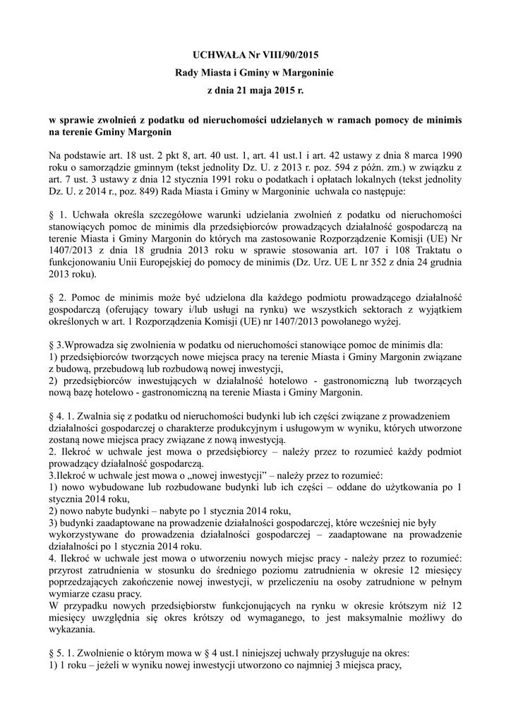 UCHWAŁA Nr VIII/90/2015 Rady Miasta i Gminy w Margoninie z dnia 21 maja 2015 r. w sprawie zwolnień z podatku od nieruchomości udzielanych w ramach pomocy de minimis na terenie Gminy Margonin Na podstawie art. 18 ust. 2 pkt 8, art. 40 ust. 1, art. 41 ust.1 i art. 42 ustawy z dnia 8 marca 1990 roku o samorządzie gminnym (tekst jednolity Dz. U. z 2013 r. poz. 594 z późn. zm.) w związku z art. 7 ust. 3 ustawy z dnia 12 stycznia 1991 roku o podatkach i opłatach lokalnych (tekst jednolity Dz. U. z 2014 r., poz. 849) Rada Miasta i Gminy w Margoninie uchwala co następuje: § 1. Uchwała określa szczegółowe warunki udzielania zwolnień z podatku od nieruchomości stanowiących pomoc de minimis dla przedsiębiorców prowadzących działalność gospodarczą na terenie Miasta i Gminy Margonin do których ma zastosowanie Rozporządzenie Komisji (UE) Nr 1407/2013 z dnia 18 grudnia 2013 roku w sprawie stosowania art. 107 i 108 Traktatu o funkcjonowaniu Unii Europejskiej do pomocy de minimis (Dz. Urz. UE L nr 352 z dnia 24 grudnia 2013 roku). § 2. Pomoc de minimis może być udzielona dla każdego podmiotu prowadzącego działalność gospodarczą (oferujący towary i/lub usługi na rynku) we wszystkich sektorach z wyjątkiem określonych w art. 1 Rozporządzenia Komisji (UE) nr 1407/2013 powołanego wyżej. § 3.Wprowadza się zwolnienia w podatku od nieruchomości stanowiące pomoc de minimis dla: 1) przedsiębiorców tworzących nowe miejsca pracy na terenie Miasta i Gminy Margonin związane z budową, przebudową lub rozbudową nowej inwestycji, 2) przedsiębiorców inwestujących w działalność hotelowo - gastronomiczną lub tworzących nową bazę hotelowo - gastronomiczną na terenie Miasta i Gminy Margonin. § 4. 1. Zwalnia się z podatku od nieruchomości budynki lub ich części związane z prowadzeniem działalności gospodarczej o charakterze produkcyjnym i usługowym w wyniku, których utworzone zostaną nowe miejsca pracy związane z nową inwestycją. 2. Ilekroć w uchwale jest mowa o przedsiębiorcy – należy przez to rozumieć każdy podmiot prowadzący działalność gospodarczą. 3.Ilekroć w uchwale jest mowa o „nowej inwestycji” – należy przez to rozumieć: 1) nowo wybudowane lub rozbudowane budynki lub ich części – oddane do użytkowania po 1 stycznia 2014 roku, 2) nowo nabyte budynki – nabyte po 1 stycznia 2014 roku, 3) budynki zaadaptowane na prowadzenie działalności gospodarczej, które wcześniej nie były wykorzystywane do prowadzenia działalności gospodarczej – zaadaptowane na prowadzenie działalności po 1 stycznia 2014 roku. 4. Ilekroć w uchwale jest mowa o utworzeniu nowych miejsc pracy - należy przez to rozumieć: przyrost zatrudnienia w stosunku do średniego poziomu zatrudnienia w okresie 12 miesięcy poprzedzających zakończenie nowej inwestycji, w przeliczeniu na osoby zatrudnione w pełnym wymiarze czasu pracy. W przypadku nowych przedsiębiorstw funkcjonujących na rynku w okresie krótszym niż 12 miesięcy uwzględnia się okres krótszy od wymaganego, to jest maksymalnie możliwy do wykazania. § 5. 1. Zwolnienie o którym mowa w § 4 ust.1 niniejszej uchwały przysługuje na okres: 1) 1 roku – jeżeli w wyniku nowej inwestycji utworzono co najmniej 3 miejsca pracy, 2) 2 lat - jeżeli w wyniku nowej inwestycji utworzono co najmniej 10 miejsc pracy, 3) 3 lat - jeżeli w wyniku nowej inwestycji utworzono co najmniej 30 miejsc pracy, 4) 4 lat - jeżeli w wyniku nowej inwestycji utworzono co najmniej 70 miejsc pracy, 5) 5 lat - jeżeli w wyniku nowej inwestycji utworzono co najmniej 90 miejsc pracy. 2. Zwolnienie z podatku przysługuje, jeżeli zwiększony poziom zatrudnienia zostanie utrzymany przez okres zwolnienia oraz kolejne 3 miesiące. 3. Warunek utworzenia nowych miejsc pracy związanych z nową inwestycją uważa się za spełniony w przypadku utworzenia nowych miejsc pracy w okresie: 1) 12 miesięcy poprzedzających datę rozpoczęcia realizacji nowej inwestycji, 2) trwania realizacji nowej inwestycji, 3) 3 miesięcy od dnia zakończenia realizacji nowej inwestycji. § 6. 1. Zwolnienie o którym mowa w § 4 ust.1 niniejszej uchwały przysługuje od momentu powstania obowiązku podatkowego w sytuacji spełnienia i potwierdzenia warunków uprawniających do zwolnienia, jednak nie wcześniej niż w roku uchwalenia niniejszej uchwały. 2. W przypadku zmiany stanu zatrudnienia w okresie trwania zwolnienia z podatku od nieruchomości, poprzez jego zwiększenie i przekroczenie kolejnego progu, okres zwolnienia wydłuża się do okresu wskazanego w danej kategorii zwolnienia. 3. W przypadku o którym mowa w ust. 2 warunek zwiększenia poziomu zatrudnienia uważa się za spełniony, jeżeli nowe miejsca pracy związane z nową inwestycją powstaną w okresie trwania zwolnienia. 4. W przypadku zmiany stanu zatrudnienia w okresie trwania zwolnienia z podatku od nieruchomości lub w okresie 3 miesięcy po jego zakończeniu poprzez jego zmniejszenie do poziomu wskazanego w danym progu przedsiębiorca korzysta z okresu zwolnienia określonego niższą kategorią. 5. W przypadku o którym mowa w ust. 4 przedsiębiorca jest zobowiązany do zapłaty podatku od nieruchomości za okres, w którym korzystał ze zwolnienia począwszy od zakończenia okresu zwolnienia określonego w § 4 niniejszej uchwały. 6. Przedsiębiorca, który nie dopełnił warunków określonych w § 5 ust. 1 pkt 1 oraz ust. 2 niniejszej uchwały traci prawo do zwolnienia począwszy od momentu powstania obowiązku podatkowego. § 7. Przedsiębiorca jest zobowiązany powiadomić pisemnie organ udzielający pomocy o utracie warunków zwolnienia, o zmianie mającej wpływ na okres zwolnienia oraz o zmianie mającej wpływ na wielkość udzielanej pomocy, najpóźniej w terminie 14 dni od daty powstania okoliczności powodujących tę utratę lub zmianę. § 8.1. Przedsiębiorca zobowiązany jest przedłożyć Burmistrzowi Miasta i Gminy Margonin następujące dok