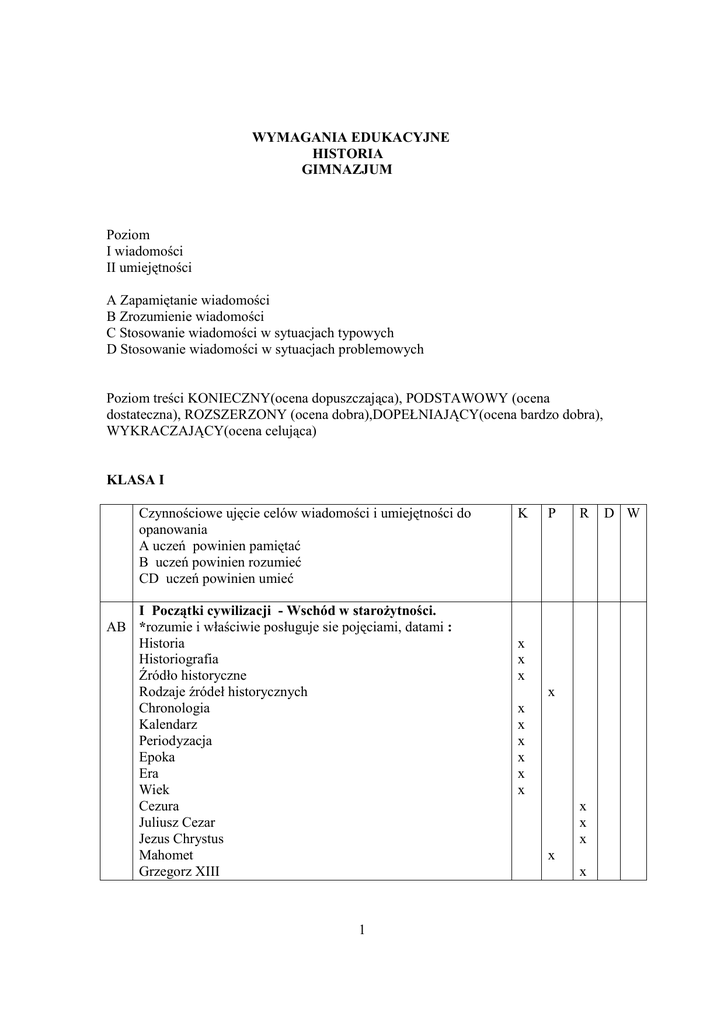 WYMAGANIA EDUKACYJNE HISTORIA GIMNAZJUM Poziom I wiadomości II umiejętności A Zapamiętanie wiadomości B Zrozumienie wiadomości C Stosowanie wiadomości w sytuacjach typowych D Stosowanie wiadomości w sytuacjach problemowych Poziom treści KONIECZNY(ocena dopuszczająca), PODSTAWOWY (ocena dostateczna), ROZSZERZONY (ocena dobra),DOPEŁNIAJĄCY(ocena bardzo dobra), WYKRACZAJĄCY(ocena celująca) KLASA I Czynnościowe ujęcie celów wiadomości i umiejętności do opanowania A uczeń powinien pamiętać B uczeń powinien rozumieć CD uczeń powinien umieć I Początki cywilizacji - Wschód w staroŜytności. AB *rozumie i właściwie posługuje sie pojęciami, datami : Historia Historiografia Źródło historyczne Rodzaje źródeł historycznych Chronologia Kalendarz Periodyzacja Epoka Era Wiek Cezura Juliusz Cezar Jezus Chrystus Mahomet Grzegorz XIII 1 K P R x x x x x x x x x x x x x x x D W I rok n.e. 622 r. Australopitek Homo habilis Homo erectus Homo sapiens Paleolit Neolit Rewolucja neolityczna Mezopotamia Sumerowie Miasto – państwo Rządy teokratyczne Kodeks Pismo klinowe Hammurabi XVIII w. Faraon Władza despotyczna Piramida Politeizm Sarkofag Mumifikacja (balsamowanie) Hieroglify Nil Mumia Kalendarz słoneczny Kanon Biblia Stary Testament Dekalog Tora Szabat Monoteizm Judaizm Prorok Mesjasz Naród wybrany Abraham MojŜesz Dawid Saul Salomon Alfabet Hinduizm Buddyzm x x x x x x x x x x x x x x x x x x x x x x x x x x x x x x x x x x x x x x x x x x 2 x x x x x Kasta Warna Księgi Wedy x x x II Cywilizacja grecka Hellada Hellenowie Polis Pismo linearne A Pismo linearne B Minos Kolonizacja Kolonia Metropolia Kolonizacja grecka Chiton Ceramika Galera Igrzyska Wyrocznia Falanga Hoplita Barbarzyńca Miltiades Leonidas Termopile Temistokles Dariusz Kserkses 490 r.p.n.e 480 r.p.n.e. Maraton Salamina Monarchia Tyrania Arystokracja Oligarchia Demokracja Ostracyzm Zgromadzenie ludowe Rada Pięciuset Strateg Klejstenes Solon Drakon x x x x x x x x x x x x x x x x x x x x x x x x x x x x x x x x x x x x x x x x 3 Drakońskie prawa Pizystrat Perykles Sparta Spartiaci Heloci Wychowanie spartańskie Lakoniczna wypowiedź Geruzja Efor Likurg Antropomorfizm Heros Bogowie olimpijscy Mit Igrzyska olimpijskie Olimpiada Gimnazjon Iliada, Odyseja Epos Tragedia Komedia Amfiteatr Hezjod Homer 776 r. p.n.e. Filozofia Filozof Sokrates Platon Arystoteles Archimedes Hipokrates Herodot Tukidydes Sztuka helleńska Sztuka hellenistyczna Styl(porządek) architektoniczny Akropol Partenon Erechtejon Propyleje Kanon (rzeźby) Style czarno - i czerwono figurowy Fidiasz Poliklet x x x x x x x x x x x x x x x x x x x x x x x x x x x x x x x x x x x x x x x x x x x x x x 4 AB AB AB C AB AB C AB C D D D C AB AB C AB AB AB AB AB AB C C AB AB AB AB Myron Imperium Kultura hellenistyczna Państwa hellenistyczne Węzeł gordyjski Filip II Aleksander Wielki Dariusz III *dostrzega róŜnice między historią i historiografią, *rozumie znaczenie rozpoczęcia przez człowieka uprawy i hodowli, *przedstawia ewolucję człowieka do momentu pojawienia sie homo sapiens, *lokalizuje na mapie miasta, państwa, *rozumie znaczenie Nilu w Ŝyciu gospodarczym Egipcjan, *rozumie związek między wyobraŜeniami religijnymi Egipcjan, a ich osiągnięciami w róŜnych dyscyplinach naukowych, *odtwarza strukturę społeczną Egiptu, *rozumie rolę religii w Ŝyciu Egipcjan, *charakteryzuje na przykładach osiągnięcia Egipcjan z dziedziny budownictwa, nauki, sztuki, *samodzielnie interpretuje źródła historyczne, *twórczo wykorzystuje posiadane źródła informacji, *samodzielnie poszukuje informacji, *zaznacza na taśmie chronologicznej wybrane wydarzenia, *zna gł.załoŜenia judaizmu, *zna osiągnięcia cywilizacyjne Fenicji, Indii, Chin, *wyjaśnia jaką rolę odgrywała znajomość pisma w ówczesnych cywilizacjach, *rozumie zaleŜność między warunkami geograficznymi, a Ŝyciem ludzi, *rozumie wpływ warunków bytowych na Ŝycie społeczeństwa, *dostrzega związek między rozwojem Ŝeglugi, a warunkami naturalnymi Grecji i potrzebami handlu, *wymienia towary importowane i eksportowane przez Greków, *opisuje gł. formy kultu religijnego Greków, *rozumie przyczyny i skutki wojen grecko - perskich *przedstawia przebieg waŜnych bitew, *przedstawia argumenty potwierdzające wyŜszość demokracji nad innymi sysemami politycznymi, *przedstawia etapy rozwoju ustroju politycznego Aten, *rozumie znaczenie wychowania spartańskiego z punktu widzenia potrzeb państwa oraz grup społecznych, *charakteryzuje system sprawowania władzy w Sparcie (oligarchia), *zna osiągnięcia Greków z zakresu kultury, 5 x x x x x x x x x x x x x x x x x x x x x x x x x x x x x x x x x x x x AB *rozumie związki zachodzące między wierzeniami religijnymi Greków, a innymi dziedzinami kultury, AB *rozumie wkład Greków do naszej cywilizacji AB *rozumie przyczyny ekspansji Aleksandra Wielkiego,pp AB *rozumie skutki jego poczynań w dziedzinie politycznej i kulturalnej, k AB *rozumie rolę wybitnych jednostek w historii,pp AB *dostrzega związek między ekspansją terytorialną, a zmianami społecznymi Rzymu, pp CD *tworzy ciąg przyczynowo – skutkowy zmian społecznych w Rzymie do I w. p.n.e.pp AB *dostrzega znaczenie kultu religijnego dla rodziny rzymskiej i całego społeczeństwa, k AB *dostrzega znaczenie widowisk w Ŝyciu społecznym, pp AB *rozumie przyczyny, które doprowadziły Rzym do podbojów, k *formułuje argumenty dotyczące uzbrojenia i taktyki, pp C AB *rozumie znaczenie daty 44 r. p.n.e., pp AB *rozumie przyczyny załamania sie republiki w Rzymie, pp AB *rozumie znaczenie wprowadzenia w Rzymie kolegialności i kadencyjności, pp AB *rozumie związek między przemianami gospodarczymi i społecznymi, a kryzysem republiki, pp AB *identyfikuje i opisuje instytucje republikańskie, k AB *charakteryzuje ustrój republiki. pp CD *wyjaśnia przemiany ustrojowe od republiki do cesarstwa, pp AB *rozumie znaczenie prawa rzymskiego dla cywil