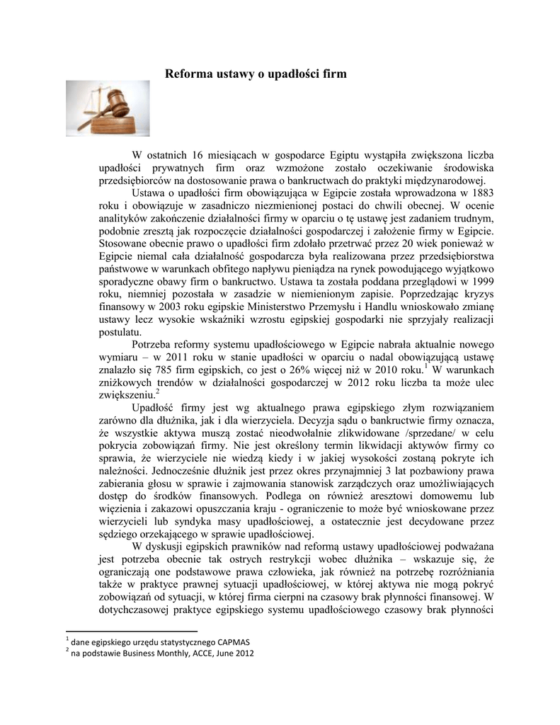 Reforma ustawy o upadłości firm W ostatnich 16 miesiącach w gospodarce Egiptu wystąpiła zwiększona liczba upadłości prywatnych firm oraz wzmożone zostało oczekiwanie środowiska przedsiębiorców na dostosowanie prawa o bankructwach do praktyki międzynarodowej. Ustawa o upadłości firm obowiązująca w Egipcie została wprowadzona w 1883 roku i obowiązuje w zasadniczo niezmienionej postaci do chwili obecnej. W ocenie analityków zakończenie działalności firmy w oparciu o tę ustawę jest zadaniem trudnym, podobnie zresztą jak rozpoczęcie działalności gospodarczej i założenie firmy w Egipcie. Stosowane obecnie prawo o upadłości firm zdołało przetrwać przez 20 wiek ponieważ w Egipcie niemal cała działalność gospodarcza była realizowana przez przedsiębiorstwa państwowe w warunkach obfitego napływu pieniądza na rynek powodującego wyjątkowo sporadyczne obawy firm o bankructwo. Ustawa ta została poddana przeglądowi w 1999 roku, niemniej pozostała w zasadzie w niemienionym zapisie. Poprzedzając kryzys finansowy w 2003 roku egipskie Ministerstwo Przemysłu i Handlu wnioskowało zmianę ustawy lecz wysokie wskaźniki wzrostu egipskiej gospodarki nie sprzyjały realizacji postulatu. Potrzeba reformy systemu upadłościowego w Egipcie nabrała aktualnie nowego wymiaru – w 2011 roku w stanie upadłości w oparciu o nadal obowiązującą ustawę znalazło się 785 firm egipskich, co jest o 26% więcej niż w 2010 roku. 1 W warunkach zniżkowych trendów w działalności gospodarczej w 2012 roku liczba ta może ulec zwiększeniu.2 Upadłość firmy jest wg aktualnego prawa egipskiego złym rozwiązaniem zarówno dla dłużnika, jak i dla wierzyciela. Decyzja sądu o bankructwie firmy oznacza, że wszystkie aktywa muszą zostać nieodwołalnie zlikwidowane /sprzedane/ w celu pokrycia zobowiązań firmy. Nie jest określony termin likwidacji aktywów firmy co sprawia, że wierzyciele nie wiedzą kiedy i w jakiej wysokości zostaną pokryte ich należności. Jednocześnie dłużnik jest przez okres przynajmniej 3 lat pozbawiony prawa zabierania głosu w sprawie i zajmowania stanowisk zarządczych oraz umożliwiających dostęp do środków finansowych. Podlega on również aresztowi domowemu lub więzienia i zakazowi opuszczania kraju - ograniczenie to może być wnioskowane przez wierzycieli lub syndyka masy upadłościowej, a ostatecznie jest decydowane przez sędziego orzekającego w sprawie upadłościowej. W dyskusji egipskich prawników nad reformą ustawy upadłościowej podważana jest potrzeba obecnie tak ostrych restrykcji wobec dłużnika – wskazuje się, że ograniczają one podstawowe prawa człowieka, jak również na potrzebę rozróżniania także w praktyce prawnej sytuacji upadłościowej, w której aktywa nie mogą pokryć zobowiązań od sytuacji, w której firma cierpni na czasowy brak płynności finansowej. W dotychczasowej praktyce egipskiego systemu upadłościowego czasowy brak płynności 1 2 dane egipskiego urzędu statystycznego CAPMAS na podstawie Business Monthly, ACCE, June 2012 firmy powoduje natychmiastową wymagalność płatności wszystkich zobowiązań spłacanych w normalnej sytuacji przez długi okres czasu, co w większości przypadków oznacza niewystarczającą wartość aktywów dla pokrycia wszystkich zobowiązań firmy i w konsekwencji doprowadza do upadłości firmy de facto cierpiącej na czasowy brak płynności finansowej. Wierzyciele bankowi ponoszą przy obecnych prawnych regulacjach upadłościowych ogromne straty – tracą spłatę oprocentowania udzielonych kredytów oraz mogą nie odzyskać kredytu udzielonego firmie. Z tego względu banki domagają się zwiększonego zabezpieczenia kredytu dostępem do aktywów firmy. Sytuacja ta ma niekorzystny wpływ na finansowanie na warunkach kredytowych działalności gospodarczej firm. Strukturalnym problemem systemu upadłościowego w Egipcie jest także brak komunikacji sądów egipskich z sądami zagranicznymi, co oznacza wnioskowanie upadłościowe wyłącznie w odniesieniu do aktywów krajowych firmy. Sytuacja taka może być wykorzystana przez upadłą firmę do nadużyć. Kolejnym problemem systemu jest słabość egzekucji regulacji upadłościowych, zwiększających kłopoty wierzyciela i dłużnika. Sądy gospodarcze w Egipcie rozpoczęły działalność w 2007 roku, lecz orzekający w sprawach gospodarczych sędziowie zostali przeniesieni z sądów cywilnych lub kryminalnych. Poziom znajomości przez nich problematyki i praktyki gospodarczej zależny jest od nich samych. Towarzyszy temu ustanawianie syndyków masy upadłościowej bez rozeznania ich umiejętności, co powoduje niewłaściwą i zaniżoną wycenę aktywów firmy oraz pogarsza sytuację finansową dłużnika i wierzyciela. Obecny system upadłościowy w Egipcie nie jest zachęcający także dla zagranicznych firm – inwestorzy chcą przed wejściem na rynek poznać obowiązujące reguły zakończenia działalność gospodarczej. Ocenia się, że reforma systemu upadłościowego winna sprzyjać napływowi FDI do Egiptu. Jedną z najbardziej skutecznych zmian w nowej ustawie o upadłości firm winien być zapis dopuszczający możliwość wyboru przez dłużnika opcji reorganizacji i spłaty zobowiązań firmy w porozumieniu z wierzycielami, wskazując przy tym na rozwiązania przyjęte w amerykańskim prawie o bankructwie gospodarczym. Proponowaną zmianą jest także obowiązek ujawniania przez dłużnika wszystkich aktywów firmy – także zagranicznych. Reforma systemu upadłościowego w Egipcie wymaga jedności działania dłużników, wierzycieli i systemu prawnego. Jako podstawę reformy uznaje się ustawowy zapis możliwości prawnego porozumienia się dłużnika i wierzycieli bez ingerencji sądu. Podkreśla się, że w warunkach międzynarodowej współpracy firm egipskich konieczne jest skorelowanie zapisów nowej ustawy upadłościowej w Egipcie ze standardami międzynarodowy