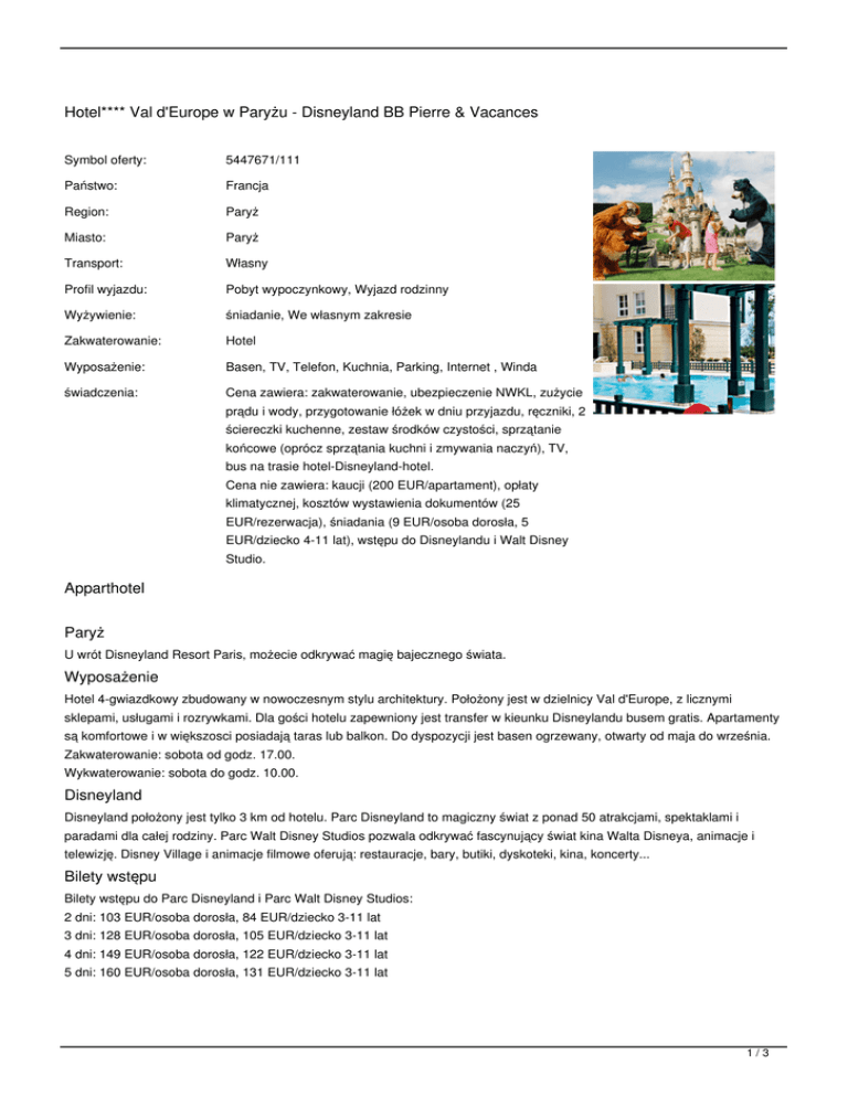 Apparthotel Paryż Wyposażenie Disneyland Bilety