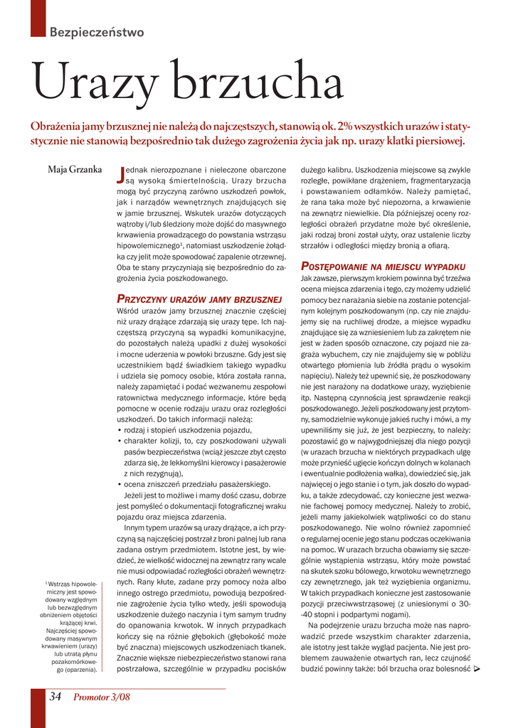 Bezpieczeństwo Urazy brzucha Obrażenia jamy brzusznej nie należą do najczęstszych, stanowią ok. 2% wszystkich urazów i statystycznie nie stanowią bezpośrednio tak dużego zagrożenia życia jak np. urazy klatki piersiowej. Maja Grzanka J ednak nierozpoznane i nieleczone obarczone są wysoką śmiertelnością. Urazy brzucha mogą być przyczyną zarówno uszkodzeń powłok, jak i narządów wewnętrznych znajdujących się w jamie brzusznej. Wskutek urazów dotyczących wątroby i/lub śledziony może dojść do masywnego krwawienia prowadzącego do powstania wstrząsu hipowolemicznego1, natomiast uszkodzenie żołądka czy jelit może spowodować zapalenie otrzewnej. Oba te stany przyczyniają się bezpośrednio do zagrożenia życia poszkodowanego. PRZYCZYNY URAZÓW JAMY BRZUSZNEJ 1 Wstrząs hipowolemiczny jest spowodowany względnym lub bezwzględnym obniżeniem objętości krążącej krwi. Najczęściej spowodowany masywnym krwawieniem (urazy) lub utratą płynu pozakomórkowego (oparzenia). Wśród urazów jamy brzusznej znacznie częściej niż urazy drążące zdarzają się urazy tępe. Ich najczęstszą przyczyną są wypadki komunikacyjne, do pozostałych należą upadki z dużej wysokości i mocne uderzenia w powłoki brzuszne. Gdy jest się uczestnikiem bądź świadkiem takiego wypadku i udziela się pomocy osobie, która została ranna, należy zapamiętać i podać wezwanemu zespołowi ratownictwa medycznego informacje, które będą pomocne w ocenie rodzaju urazu oraz rozległości uszkodzeń. Do takich informacji należą: • rodzaj i stopień uszkodzenia pojazdu, • charakter kolizji, to, czy poszkodowani używali pasów bezpieczeństwa (wciąż jeszcze zbyt często zdarza się, że lekkomyślni kierowcy i pasażerowie z nich rezygnują), • ocena zniszczeń przedziału pasażerskiego. Jeżeli jest to możliwe i mamy dość czasu, dobrze jest pomyśleć o dokumentacji fotograficznej wraku pojazdu oraz miejsca zdarzenia. Innym typem urazów są urazy drążące, a ich przyczyną są najczęściej postrzał z broni palnej lub rana zadana ostrym przedmiotem. Istotne jest, by wiedzieć, że wielkość widocznej na zewnątrz rany wcale nie musi odpowiadać rozległości obrażeń wewnętrznych. Rany kłute, zadane przy pomocy noża albo innego ostrego przedmiotu, powodują bezpośrednie zagrożenie życia tylko wtedy, jeśli spowodują uszkodzenie dużego naczynia i tym samym trudny do opanowania krwotok. W innych przypadkach kończy się na różnie głębokich (głębokość może być znaczna) miejscowych uszkodzeniach tkanek. Znacznie większe niebezpieczeństwo stanowi rana postrzałowa, szczególnie w przypadku pocisków 34 Promotor 3/08 dużego kalibru. Uszkodzenia miejscowe są zwykle rozległe, powikłane drążeniem, fragmentaryzacją i powstawaniem odłamków. Należy pamiętać, że rana taka może być niepozorna, a krwawienie na zewnątrz niewielkie. Dla późniejszej oceny rozległości obrażeń przydatne może być określenie, jaki rodzaj broni został użyty, oraz ustalenie liczby strzałów i odległości między bronią a ofiarą. POSTĘPOWANIE NA MIEJSCU WYPADKU Jak zawsze, pierwszym krokiem powinna być trzeźwa ocena miejsca zdarzenia i tego, czy możemy udzielić pomocy bez narażania siebie na zostanie potencjalnym kolejnym poszkodowanym (np. czy nie znajdujemy się na ruchliwej drodze, a miejsce wypadku znajdujące się za wzniesieniem lub za zakrętem nie jest w żaden sposób oznaczone, czy pojazd nie zagraża wybuchem, czy nie znajdujemy się w pobliżu otwartego płomienia lub źródła prądu o wysokim napięciu). Należy też upewnić się, że poszkodowany nie jest narażony na dodatkowe urazy, wyziębienie itp. Następną czynnością jest sprawdzenie reakcji poszkodowanego. Jeżeli poszkodowany jest przytomny, samodzielnie wykonuje jakieś ruchy i mówi, a my upewniliśmy się już, że jest bezpieczny, to należy: pozostawić go w najwygodniejszej dla niego pozycji (w urazach brzucha w niektórych przypadkach ulgę może przynieść ugięcie kończyn dolnych w kolanach i ewentualnie podłożenia wałka), dowiedzieć się, jak najwięcej o jego stanie i o tym, jak doszło do wypadku, a także zdecydować, czy konieczne jest wezwanie fachowej pomocy medycznej. Należy to zrobić, jeżeli mamy jakiekolwiek wątpliwości co do stanu poszkodowanego. Nie wolno również zapomnieć o regularnej ocenie jego stanu podczas oczekiwania na pomoc. W urazach brzucha obawiamy się szczególnie wystąpienia wstrząsu, który może powstać na skutek szoku bólowego, krwotoku wewnętrznego czy zewnętrznego, jak też wyziębienia organizmu. W takich przypadkach konieczne jest zastosowanie pozycji przeciwwstrząsowej (z uniesionymi o 30-40 stopni i podpartymi nogami). Na podejrzenie urazu brzucha może nas naprowadzić przede wszystkim charakter zdarzenia, ale istotny jest także wygląd pacjenta. Nie jest problemem zauważenie otwartych ran, lecz czujność budzić powinny także: ból brzucha oraz bolesność Bezpieczeństwo chodowego, wypadku w pracy itp., czyli sytuacji, które nietrudno jest sobie wyobrazić i które mogą się zdarzyć praktycznie każdemu. Jeżeli jednak zachowa się zimną krew i będzie postępować logicznie, wykorzystując swoją wiedzę i życiową praktykę, to w wielu przypadkach można komuś pomóc, a nawet uratować ludzkie życie. Najważniejsze jest, aby nie być obojętnym, nie dać się sparaliżować przez strach i poczucie bezradności, ale działać – nie tylko prawidłowo, ale również szybko i sprawnie! Piśmiennictwo 1. Plantz S.H., Adler J.N.: Medycyna ratunkowa. U & P, 2000. 2. Driscoll P., Skinner D., Earlam R.: ABC postępowania w urazach. Wrocław Górnicki Wydaw. Medyczne, 2003. 3. Robertson C., Redmond A.D.: Kompendium leczenia dużych urazów. WM, 1994. 4. Bochenek A., Reicher M.: Anatomia ogólna. Kości, stawy i więzadła. Mięśnie. PZWL, Warszawa 1990. 5. Driscoll P., Gwinnutt C., LeD