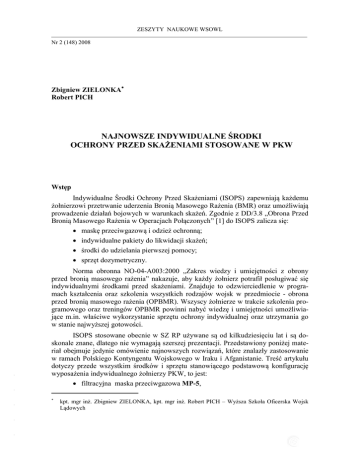 ZESZYTY NAUKOWE WSOWL Nr 2 (148) 2008 ISSN 1731-8157 Zbigniew ZIELONKA Robert PICH NAJNOWSZE INDYWIDUALNE ŚRODKI OCHRONY PRZED SKAŻENIAMI STOSOWANE W PKW Wstęp Indywidualne Środki Ochrony Przed Skażeniami (ISOPS) zapewniają każdemu żołnierzowi przetrwanie uderzenia Bronią Masowego Rażenia (BMR) oraz umożliwiają prowadzenie działań bojowych w warunkach skażeń. Zgodnie z DD/3.8 „Obrona Przed Bronią Masowego Rażenia w Operacjach Połączonych” [1] do ISOPS zalicza się: maskę przeciwgazową i odzież ochronną; indywidualne pakiety do likwidacji skażeń; środki do udzielania pierwszej pomocy; sprzęt dozymetryczny. ISOPS stosowane obecnie w SZ RP używane są od kilkudziesięciu lat i są doskonale znane, dlatego nie wymagają szerszej prezentacji. Przedstawiony poniżej materiał obejmuje jedynie omówienie najnowszych rozwiązań, które znalazły zastosowanie w ramach Polskiego Kontyngentu Wojskowego w Iraku i Afganistanie. Treść artykułu dotyczy przede wszystkim środków i sprzętu stanowiącego podstawową konfigurację wyposażenia indywidualnego żołnierzy PKW, to jest: filtracyjna maska przeciwgazowa MP-5, - - Norma obronna NO-04-A003:2000 „Zakres wiedzy i umiejętności z obrony przed bronią masowego rażenia” nakazuje, aby każdy żołnierz potrafił posługiwać się indywidualnymi środkami przed skażeniami. Znajduje to odzwierciedlenie w programach kształcenia oraz szkolenia wszystkich rodzajów wojsk w przedmiocie - obrona przed bronią masowego rażenia (OPBMR). Wszyscy żołnierze w trakcie szkolenia programowego oraz treningów OPBMR powinni nabyć wiedzę i umiejętności umożliwiające m.in. właściwe wykorzystanie sprzętu ochrony indywidualnej oraz utrzymania go w stanie najwyższej gotowości. - - - kpt. mgr inż. Zbigniew ZIELONKA, kpt. mgr inż. Robert PICH – Wyższa Szkoła Oficerska Wojsk Lądowych Robert PICH, Zbigniew ZIELONKA filtrosorpcyjna odzież ochronna FOO-1, narzutka ochronna NO-1, indywidualny pakiet przeciwchemiczny IPP-95, indywidualny pakiet do likwidacji skażeń IPLS-1, indywidualny zestaw autostrzykawek IZAS-05. Dodatkowo w artykule autorzy opisują inny nowo wprowadzony sprzęt: zestaw do odsysania jadu owadów i roślin Aspivenin, tymczasowy opatrunek osobisty Quick Cloth, autostrzykawkę z morfiną. Celem tego artykułu jest przybliżenie czytelnikowi tego wyposażenia, które obecnie stosowane jest przez żołnierzy PKW, a w przyszłości może zostać wprowadzone do powszechnego użycia w SZ RP. Filtracyjna maska przeciwgazowa MP-5 Filtracyjna maska przeciwgazowa MP-5 i filtrosorpcyjna odzież ochronna FOO1, wprowadzane, jako standardowe wyposażenie pododdziałów Wojsk Lądowych, są również na wyposażeniu żołnierzy wykonujących zadania poza granicami Polski m.in. PKW Irak. Filtracyjna maska przeciwgazowa MP-5 firmy „MASKPOL” jest przeznaczona do ochrony dróg oddechowych, oczu i twarzy użytkownika przed bojowymi środkami trującymi, substancjami biologicznymi oraz pyłem radioaktywnym. Umożliwia ona wykonywanie zadań w atmosferze skażonej i dodatkowo przystosowana jest do pobierania płynów bez konieczności jej zdejmowania. W skład zestawu obok części twarzowej maski, filtropochłaniacza węglowego FP-5 wchodzi bidon i rurka z zaworem. Konstrukcja części twarzowej maski zapewnia bardzo dobre pole widzenia (powyżej 90% normalnego pola widzenia) oraz umożliwia wygodne posługiwanie się przyrządami celowniczymi i optycznymi. Dane techniczne MP-5 (na podstawie danych producenta): - - - - - czas zmiany położenia maski z marszowego na bojowe – 9 s; możliwość ciągłego przebywania w masce – 1 doba; czas ochronnego działania zależny od rodzaju środka trującego, minimum 24h; możliwość przyjmowania płynów – 200 g/min; ciężar maski (w położeniu bojowym) – 800 g; samoczynne wydalanie potu z części twarzowej – 60 g/min; możliwość wymiany filtropochłaniacza w terenie skażonym; pojemnik na płyny o pojemności 0,5 dm3; pojemność sorpcyjna dla trwałych środków trujących nie mniej niż 8 g; możliwość podłączenia filtropochłaniaczy: wielogazowego lub selektywnego (Tabela 1); gwint gniazda filtropochłaniacza w części twarzowej maski – Rd 40x1/7”. 59 NAJNOWSZE INDYWIDUALNE ŚRODKI OCHRONY PRZED SKAŻENIAMI… Fot. 1. Filtracyjna maska przeciwgazowa MP-5 (w wersji PKW Irak) Źródło: Opracowanie własne Filtrosorpcyjna odzież ochronna FOO-1 Filtrosorpcyjna odzież ochronna FOO-1, wraz z filtracyjną maską przeciwgazową MP-5, przeznaczona jest do indywidualnej ochrony żołnierza przed skażeniami chemicznymi, biologicznymi i radioaktywnymi występującymi w powietrzu w postaci par, aerozoli i pyłów. Ubranie zastępuje, przy temperaturze powietrza powyżej -50C, standardowe mundury polowe i może być wkładane bezpośrednio na skórę, bieliznę. Przy niższej temperaturze otoczenia należy je wkładać na dres lub bezpośrednio na mundur polowy. - - - - - W ostatnich latach odchodzi się od stosowania odzieży izolacyjnej na korzyść odzieży filtrosorpcyjnej, która bez wątpienia stwarza bardziej komfortowe warunki do wykonywania zadań w warunkach zagrożenia skażeniami oraz w terenie skażonym (zakażonym). Na decyzję zastąpienia ogólnowojskowej odzieży ochronnej OP-1M przez filtrosorpcyjną odzież ochronną FOO-1, mimo wyższych kosztów zakupu i eksploatacji, wpłynęły przede wszystkim lepsze parametry odprowadzania nadmiaru ciepła z powierzchni ciała oraz lepsza (skuteczniejsza) ochrona przed czynnikami chemicznymi oraz aerozolami biologicznymi i radioaktywnymi. 60 Robert PICH, Zbigniew ZIELONKA Tabela 1. Wykaz filtropochłaniaczy selektywnych i wielogazowych. Rodzaj czynnika szkodliwego Lp Organiczne pary i gazy, o temp. wrzenia powyżej 650C Pyły i aerozole Nieorganiczne pary i gazy(za wyjątkiem tleneku węgla) Pyły i aerozole Dwutlenek siarki i inne kwaśne pary i gazy Pyły i aerozole Amoniak i pochodne organ