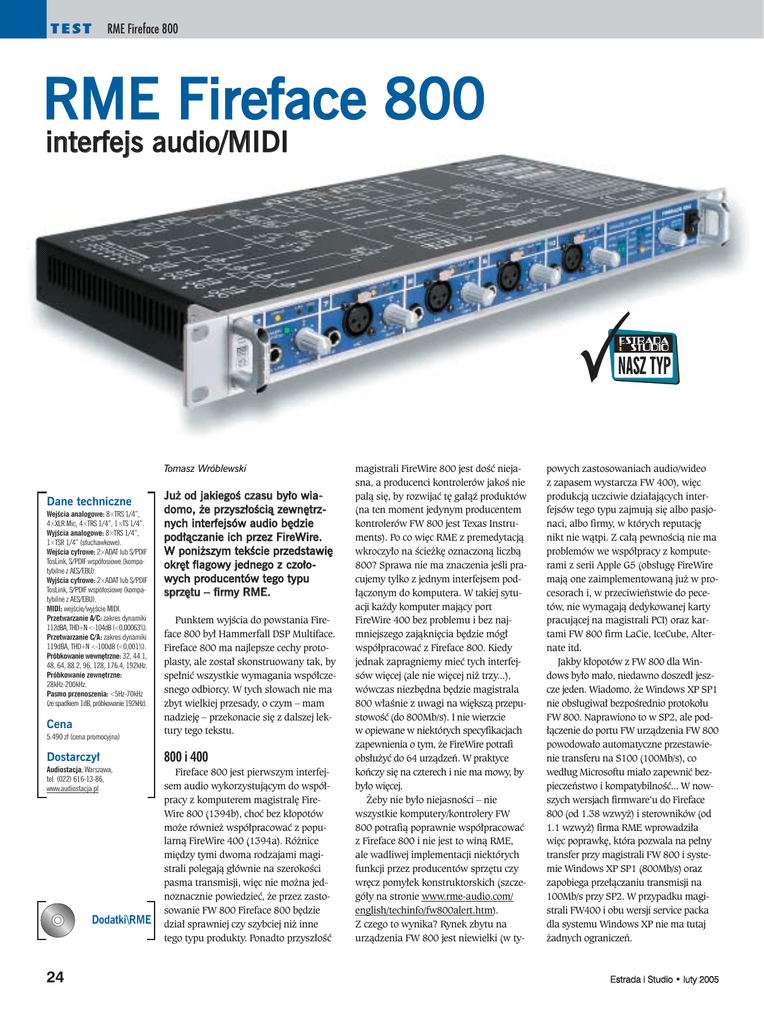 TEST RME Fireface 800 RME Fireface 800 interfejs audio/MIDI Tomasz Wróblewski Dane techniczne Wejœcia analogowe: 8×TRS 1/4”, 4×XLR Mic, 4×TRS 1/4”, 1×TS 1/4”. Wyjœcia analogowe: 8×TRS 1/4”, 1×TSR 1/4” (s³uchawkowe). Wejœcia cyfrowe: 2×ADAT lub S/PDIF TosLink, S/PDIF wspó³osiowe (kompatybilne z AES/EBU). Wyjœcia cyfrowe: 2×ADAT lub S/PDIF TosLink, S/PDIF wspó³osiowe (kompatybilne z AES/EBU). MIDI: wejœcie/wyjœcie MIDI. Przetwarzanie A/C: zakres dynamiki 112dBA, THD+N <-104dB (<0,00063%). Przetwarzanie C/A: zakres dynamiki 119dBA, THD+N <-100dB (<0,001%). Próbkowanie wewnêtrzne: 32, 44.1, 48, 64, 88.2, 96, 128, 176.4, 192kHz. Próbkowanie zewnêtrzne: 28kHz-200kHz. Pasmo przenoszenia: <5Hz-70kHz (ze spadkiem 1dB, próbkowanie 192kHz). Cena 5.490 z³ (cena promocyjna) Ju¿ od jakiegoœ czasu by³o wia domo, ¿e przysz³oœci¹ zewnêtrz nych interfejsów audio bêdzie pod³¹czanie ich przez FireWire. W poni¿szym tekœcie przedstawiê okrêt flagowy jednego z czo³o wych producentów tego typu sprzêtu – firmy RME. Punktem wyjścia do powstania Fireface 800 był Hammerfall DSP Multiface. Fireface 800 ma najlepsze cechy protoplasty, ale został skonstruowany tak, by spełnić wszystkie wymagania współczesnego odbiorcy. W tych słowach nie ma zbyt wielkiej przesady, o czym – mam nadzieję – przekonacie się z dalszej lektury tego tekstu. Dostarczy³ 800 i 400 Audiostacja, Warszawa, tel. (022) 616-13-86, www.audiostacja.pl Fireface 800 jest pierwszym interfejsem audio wykorzystującym do współpracy z komputerem magistralę FireWire 800 (1394b), choć bez kłopotów może również współpracować z popularną FireWire 400 (1394a). Różnice między tymi dwoma rodzajami magistrali polegają głównie na szerokości pasma transmisji, więc nie można jednoznacznie powiedzieć, że przez zastosowanie FW 800 Fireface 800 będzie dział sprawniej czy szybciej niż inne tego typu produkty. Ponadto przyszłość Dodatki\RME 24 magistrali FireWire 800 jest dość niejasna, a producenci kontrolerów jakoś nie palą się, by rozwijać tę gałąź produktów (na ten moment jedynym producentem kontrolerów FW 800 jest Texas Instruments). Po co więc RME z premedytacją wkroczyło na ścieżkę oznaczoną liczbą 800? Sprawa nie ma znaczenia jeśli pracujemy tylko z jednym interfejsem podłączonym do komputera. W takiej sytuacji każdy komputer mający port FireWire 400 bez problemu i bez najmniejszego zająknięcia będzie mógł współpracować z Fireface 800. Kiedy jednak zapragniemy mieć tych interfejsów więcej (ale nie więcej niż trzy...), wówczas niezbędna będzie magistrala 800 właśnie z uwagi na większą przepustowość (do 800Mb/s). I nie wierzcie w opiewane w niektórych specyfikacjach zapewnienia o tym, że FireWire potrafi obsłużyć do 64 urządzeń. W praktyce kończy się na czterech i nie ma mowy, by było więcej. Żeby nie było niejasności – nie wszystkie komputery/kontrolery FW 800 potrafią poprawnie współpracować z Fireface 800 i nie jest to winą RME, ale wadliwej implementacji niektórych funkcji przez producentów sprzętu czy wręcz pomyłek konstruktorskich (szczegóły na stronie www.rme-audio.com/ english/techinfo/fw800alert.htm). Z czego to wynika? Rynek zbytu na urządzenia FW 800 jest niewielki (w ty- powych zastosowaniach audio/wideo z zapasem wystarcza FW 400), więc produkcją uczciwie działających interfejsów tego typu zajmują się albo pasjonaci, albo firmy, w których reputację nikt nie wątpi. Z całą pewnością nie ma problemów we współpracy z komputerami z serii Apple G5 (obsługę FireWire mają one zaimplementowaną już w procesorach i, w przeciwieństwie do pecetów, nie wymagają dedykowanej karty pracującej na magistrali PCI) oraz kartami FW 800 firm LaCie, IceCube, Alternate itd. Jakby kłopotów z FW 800 dla Windows było mało, niedawno doszedł jeszcze jeden. Wiadomo, że Windows XP SP1 nie obsługiwał bezpośrednio protokołu FW 800. Naprawiono to w SP2, ale podłączenie do portu FW urządzenia FW 800 powodowało automatyczne przestawienie transferu na S100 (100Mb/s), co według Microsoftu miało zapewnić bezpieczeństwo i kompatybilność... W nowszych wersjach firmware’u do Fireface 800 (od 1.38 wzwyż) i sterowników (od 1.1 wzwyż) firma RME wprowadziła więc poprawkę, która pozwala na pełny transfer przy magistrali FW 800 i systemie Windows XP SP1 (800Mb/s) oraz zapobiega przełączaniu transmisji na 100Mb/s przy SP2. W przypadku magistrali FW400 i obu wersji service packa dla systemu Windows XP nie ma tutaj żadnych ograniczeń. Estrada i Studio • luty 2005 RME Fireface 800 Wejœcia i wyjœcia Liczba wejść analogowych dostępnych w opisywanym interfejsie nie od razu jest oczywista. Na przedniej płycie figuruje wejście oznaczone numerem 1 (instrumentalno/liniowe) oraz cztery wejścia 7-10 (mikrofonowo/liniowe). Z tyłu znajdziemy kolejne osiem, oznaczone numerami 1-8. Do rozwiązania zagadki brzmiącej „o co w tym wszystkim chodzi?” potrzebna nam jest informacja, że Fireface 800 w sumie oferuje 10 analogowych kanałów wejściowych. Wyjaśnienie przychodzi po uruchomieniu okna konfiguracji Fireface Settings, gdzie znajdziemy moduł INPUTS, pozwalający – niezależnie dla każdego z torów 1, 7 i 8 – definiować port wejściowy (czy tylko wejście mikrofonowe, czy tylko liniowe, czy wreszcie oba naraz – bo taką możliwość też przewidziano). Wart podkreślenia jest fakt, że dla wejścia 1 można aktywować realizowany na drodze sprzętowej efekt Drive (przesterowania) oraz symulację brzmienia gitarowych zestawów głośnikowych (podcięcie wysokich tonów, nieznaczne wyeksponowanie niskiego środka). Do tego dochodzi niezależny od obu efektów układ „miękkiego” limitera, który ładnie zaokrągla szczyty sygnału. Głębokość przesterowania (lub nasycenia brzmienia w przypadku wyłączonych efektów) regulujemy potencjometrem GAIN. Wszys