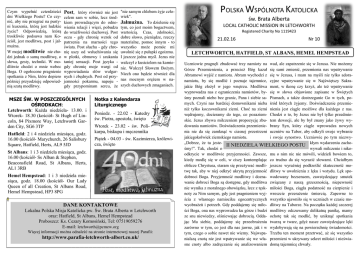 Czym wypełnić czterdzieści dni Wielkiego Postu? Co czynić, aby nie przegrać na pustyni kuszenia, którą jest ludzkie życie? Odpowiedzią, którą troskliwie podsuwa nam Kościół, jest modlitwa, post i jałmużna. W mojej modlitwie nie chodzi jednak o samą modlitwę, o słowa, gesty, techniki. W modlitwie chodzi o mnie wobec Boga. O ogołocone pragnienie spotkania z Nim, które dopiero później przyodzieję odpowiednią szatą modlitwy. Post, który również nie jest "nie samym chlebem żyje czło- celem sam w sobie, lecz środ- wiek". kiem prowadzącym do odno- Jałmużna. To dzielenie się wienia relacji i więzi, pobudza tym, co jest moim bogactwem, do wrażliwości duchowej. Post wartością. Czas, zdolności, oczu - gdy chronię wzrok od dobre słowo, pieniądze, rzeczy patrzenia na marności tego materialne, pomoc innym - to świata. Post słuchu - gdy chro- wszystko może pomóc mi nię uszy od wsłuchiwania się uwolnić się z pułapki egoizmu. w plotki, obmowy i szukania I jeszcze jedna myśl. Jezus nie taniej sensacji. Post języka - walczył z kusicielem na kamiegdy chronię moje wargi od nie. Walczył Słowem Bożym. wypowiadania słów wulgarNiech ono będzie również dla nych i zbędnych. Post od przyjemności pokarmu, napoju - nas mocnym orężem w nagdy przypominam sercu, że szych duchowych zmaganiach. MSZE ŚW. W POSZCZEGÓLNYCH OŚRODKACH: Letchworth: Każda niedziela- 13.00. i Wtorek- 18.30 (kościół- St Hugh of Lincoln, 84 Pixmore Way, Letchworth Garden City, SG6 3TP Hatfield: 2 i 4 niedziela miesiąca, godz. 16.00 (kościół- Marychurch, 26 Salisbury Square, Hatfield, Herts, AL9 5JD Notka z Kalendarza Liturgicznego Poniedz. - 22.02 - Katedry św. Piotra, apostoła, święto Wtorek - 23.02 - św. Polikarpa, biskupa i męczennika Piątek - 04.03 - św. Kazimierza, królewicza, święto St Albans: 1 i 3 niedziela miesiąca, godz. 16.00 (kościół- Ss Alban & Stephen, Beaconsfield Road, St Albans, Herts, AL1 3RB Hemel Hempstead: 1 i 3 niedziela miesiąca, godz. 18.00 (kościół- Our Lady Queen of all Creation, St Albans Road, Hemel Hempstead, HP3 8PG DANE KONTAKTOWE Lokalna Polska Misja Katolicka pw. Św. Brata Alberta w Letchworth oraz: Hatfield, St Albans, Hemel Hempstead Proboszcz: Ks. Cezary Komosiński, Tel: 07519059276 E-mail: [email protected] Więcej informacji można odnaleźć na stronie internetowej naszej Parafii: http://www.parafia-letchworth-albert.co.uk/ POLSKA WSPÓLNOTA KATOLICKA św. Brata Alberta LOCAL CATHOLIC MISSION IN LETCHWORTH Registered Charity No 1119423 21.02.16 Nr 10 LETCHWORTCH, HATFIELD, ST ALBANS, HEMEL HEMPSTEAD Uczniowie pragnęli zbudować trzy namioty na wad, ale zapatrzenie się w Jezusa. Nie możemy Górze Przemienienia, a przecież Bóg kazał się sami zmienić, przemienia nas wpatrywanie Abramowi wyjść z namiotu. Abram wychodzi z się w Jezusa, i mam na myśli nie tylko adoranamiotu, by się modlić i poznaje tajemnice, cyjne wpatrywanie się w Najświętszy Sakrajakie Bóg złożył w jego wnętrzu. Modlitwa ment, w ikonę czy krzyż, ale też wpatrywanie wyprowadza nas z ograniczenia namiotów, by- się w słowa objawione zapisane w Świętych śmy poznali niebo bez granic, Pana i siebie sa- Pismach, a także dostrzeganie Go w tych, pomych. Czyni nas bardziej domownikami nieba śród których żyjemy. Doświadczenie przemieniż tylko koczownikami ziemi. Choć na ziemi nienia jest ciągle możliwe dla każdego z nas. wędrujemy, docieramy do tego, co pozaziem- Chodzi o to, by Jezus nie był tylko przedmioskie. Jezus zbywa milczeniem propozycję zbu- tem dewocji, ale by był znany jako żywy wydowania namiotów. Doświadczenia przemienie- brany Syn, który ciągle wprowadza nowych nia nie da się zamknąć w ciasnej przestrzeni uczniów na Tabor, aby odkryli swoje wybranie jakiegokolwiek ziemskiego namiotu. i swoje synostwo. Uczniowie po tym niezwy„Dobrze, że tu jesteII NIEDZIELA WIELKIEGO POSTU kłym wydarzeniu zachośmy!”. Tak, chodzi o wywali milczenie i nikoodkrycie w modlitwie przyjemności. Zawsze, mu o nim nic nie mówili, widzieli bowiem to, kiedy modlę się w celi, w ciszy kontemplując co trudno da się wyrazić słowami. Chciałbym oblicze Chrystusa, staram się przeżywać modli- jeszcze wyraźniej podkreślić skuteczność motwę tak, aby w niej odkryć ukrytą przyjemność dlitwy w uwolnieniu z lęku i wstydu. Lęk spodobroci Boga. Przyjemność modlitwy i dozna- wodowany bezsensem, zawstydzający smutek wanie dobroci Boga są dostępne, gdy modlitwa związany z naszą grzesznością, niepewność nie wynika z moralnego obowiązku, lecz z tęsk- miłości Boga, ciągła podatność na cierpienie i noty za Nim samym, gdy jest pragnieniem wyj- wreszcie przerażenie śmiercią. Zapewne to ścia z własnego namiociku egocentrycznych wszystko ujawniło się w uczniach w czasie mowyobrażeń i potrzeb. Gdy poddajemy się miło- dlitwy na Taborze. Na początku każdej szczerej ści Boga, ona nas wyprowadza ku górze i budzi modlitwy odczuwamy delikatną panikę, mamy ze snu niewiedzy, olśniewając dobrocią. Odda- ochotę tak się modlić, by uniknąć spotkania jąc Mu siebie, poddajemy się przeobrażeniu twarzą w twarz, gdyż nasze zawstydzające lęki zarówno w tym, co jest dla nas jawne, jak i w wydobywają się na powierzchnię świadomości. tym, czego o sobie nawet nie wiemy. Najwspa- Trzeba ten moment przetrwać, aż się wszystko nialszą cnotą nie jest wpatrywanie się we wła- przemieni w ukrywany sekret miłości i nieświasne cnoty albo zadręczanie się analizowaniem domą tajemnicę chwały. INTENCJE MSZALNE DATA LOKALIZACJA Letchworth 21.02.2016 Niedziela St Albans Hemel Hempstead 23.02.2016 Wtorek Letchworth Letchworth OGŁOSZENIA PARAFIALNE INTENCJE I NABOŻEŃSTWA II NIEDZIELA WIELKIEGO POSTU 1. Nabożeństwo Drogi Krzyżowej w Wielkim Poście - w Letchworth, w każdy wtorek o godz. 18.30 a po nim Msza św. W innych ośrodkach - w niedzielę, 15 minut przed Mszą św. + R