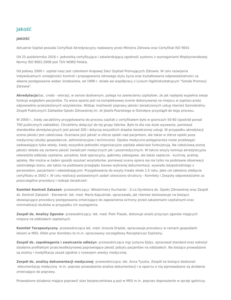 Jakość JAKOŚĆ Aktualnie Szpital posiada Certyfikat Akredytacyjny nadawany przez Ministra Zdrowia oraz Certyfikat ISO 9001 Od 25 października 2016 r. jednostką certyfikująca i zatwierdzającą zgodność systemu z wymaganiami Międzynarodowej Normy ISO 9001:2008 jest TUV NORD Polska. Od połowy 2000 r. szpital nasz jest członkiem Krajowej Sieci Szpitali Promujących Zdrowie. W celu rozwijania indywidualnych umiejętności kontroli i propagowania zdrowego stylu życia oraz kształtowania odpowiedzialności za własne postępowanie wobec środowiska, od 1999 r. działa we współpracy z Liceum Ogólnokształcącym "Szkoła Promocji Zdrowia". Akredytacja(tac. credo - wierzę), w sensie dosłownym, polega na zawierzeniu szpitalowi, że jak najlepiej wypełnia swoje funkcje względem pacjentów. Ta wiara oparta jest na kompleksowej ocenie dokonywanej na miejscu w szpitalu przez odpowiednio przeszkolonych wizytatorów. Widząc możliwość poprawy jakości świadczonych usług również Samodzielny Zespół Publicznych Zakładów Opieki Zdrowotnej im. dr Józefa Psarskiego w Ostrołęce przystąpił do tego procesu. W 2000 r., kiedy zaczęliśmy przygotowania do procesu szpitali z certyfikatem było w granicach 50-60 (spośród ponad 700 publicznych zakładów). Chcieliśmy dołączyć do tej grupy liderów. Było to dla nas duże wyzwanie, ponieważ standardów akredytacyjnych jest ponad 200 i dotyczą wszystkich etapów świadczonej usługi. W przypadku akredytacji ocena jakości jest całościowa. Oceniana jest jakość w sferze opieki nad pacjentem, ale także w sferze opieki poza medycznej (służby gospodarcze, administracyjne i techniczne). Opieka medyczno-pielęgniarska może przebiegać zadowalająco tylko wtedy, kiedy wszystkie jednostki organizacyjne szpitala właściwie funkcjonują. Na całościową ocenę jakości składa się zarówno jakość świadczeń medycznych jak i pozamedycznych. W takcie wizyty komisja akredytacyjna odwiedziła oddziały szpitalne, poradnie, blok operacyjny, gabinety zabiegowe, ale także zaplecze - kuchnię, pralnię, aptekę. Nie można w żaden sposób oszukać wizytatorów, ponieważ ocena opiera się nie tylko na podstawie obserwacji zaistniałego stanu, ale także na podstawie przeglądu losowo wybranej dokumentacji, wywiadu bezpośredniego z personelem, pacjentami i odwiedzającymi. Przygotowania do wizyty trwały około 1,5 roku. Jako cel założono zdobycie certyfikatu w 2002 r. W celu realizacji postawionych zadań utworzono struktury - Komitety i Zespoły odpowiedzialne za poszczególne procedury i rodzaje świadczeń: Komitet Kontroli Zakażeń- przewodniczący: Włodzimierz Kucharski - Z-ca Dyrektora ds. Opieki Zdrowotnej oraz Zespół ds. Kontroli Zakażeń - Kierownik: lek. med. Maria Kapuśniak, opracowała, jak również dostosowuje na bieżąco obowiązujące procedury postępowania zmierzające do zapewnienia ochrony przed zakażeniami szpitalnymi oraz minimalizacji skutków w przypadku ich wystąpienia. Zespół ds. Analizy Zgonów- przewodniczący: lek. med. Piotr Piasek, dokonuje analiz przyczyn zgonów mających miejsce na oddziałach szpitalnych. Komitet Terapeutyczny- przewodnicząca lek. med. Urszula Drężek, opracowuje procedury w ramach gospodarki lekami w MSS. Efekt prac Komitetu to m.in. opracowany szczegółowy Receptariusz Szpitalny. Zespół ds. zapobiegania i zwalczania odleżyn- przewodnicząca mgr Justyna Ejdys, opracował standard oraz wdrożył działania profilaktyki przeciwodleżynowej poprawiające jakość pobytu pacjentów na oddziałach. Na bieżąco prowadzone są analizy i modyfikacja zasad zgodnie z rozwojem wiedzy medycznej. Zespół ds. analizy dokumentacji medycznej- przewodnicząca: lek. Anna Tyszka. Zespół na bieżąco doskonali dokumentację medyczną m.in. poprzez prowadzenie analiza dokumentacji i w oparciu o nią wprowadzane są działania zmierzające do poprawy. Prowadzono działania mające poprawić stan bezpieczeństwa p.poż w MSS m.in. poprzez doposażenie w sprzęt gaśniczy. Przy współpracy Państwowej Straży Pożarnej organizowane są próbną ewakuację. Kompleksowemu przeglądowi poddano sprzęt medyczny używany do świadczenia usług medycznych. Sporządzono wykaz sprzętu i harmonogram przeglądów i na bieżąco jest on realizowany i modyfikowany. Po pierwszej wizycie spełniliśmy 74% wymaganych standardów i otrzymaliśmy akredytację warunkową na okres 1 roku. Ale to nas nie zniechęciło, wręcz przeciwnie. Taka ocena wskazała nam niedociągnięcia i kierunek działań, jaki należało podjąć, aby poprawić jakość. Nadal udoskonalaliśmy naszą pracę i zakład i po roku ponownie poddaliśmy się kontroli wizytatorów z CMJ i uzyskaliśmy 90% zgodności z opracowanymi standardami i status szpitala akredytowanego na okres 3 lat, tj., od 12 maja 2003 r. do 13 maja 2006 r. To był dla nas ogromny sukces. Jest to tylko symbol jakości, ponieważ ją najlepiej odczuwają pacjenci, którzy chcą leczyć się w naszym szpitalu, a także kontrahenci współpracujący z nami. Po uzyskaniu tego certyfikatu dyrektor podjął decyzję o wdrożeniu Systemu Zarządzania jakością wg Normy ISO 9001:2000. Pierwszy raz Międzynarodowy Certyfikat Jakości ISO 9001:2000 Szpital otrzymał 25 października 2004 r. Przyznanie certyfikatu było poprzedzone auditem zewnętrznym, przeprowadzonym przez auditorów z firmy certyfikującej Lloyd's Register. Uzyskanie certyfikatu było udziałem wielu ludzi zaangażowanych w projektowanie, wdrażanie oraz doskonalenie systemu zarządzania jakością. Proces wdrażania systemu rozpoczął się w dniu 9 września 2003 roku na podstawie decyzji dyrektora MSS w Ostrołęce. Funkcję Pełnomocnika ds. Systemu Zarządzania Jakością, Dyrektor powierzył Grażynie Oleksik (Parzych), która uzyskała pełnomocnictwo do sprawowania nadzoru nad wdrażaniem, utrzymaniem i doskonaleniem systemu. Opracowano Księgę Jakości oraz Politykę Jakości, 