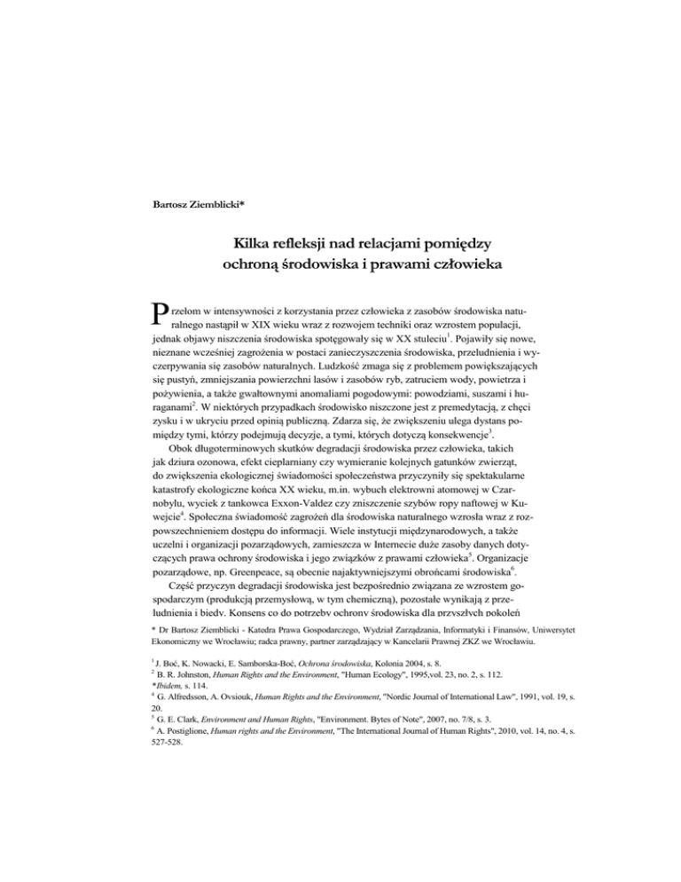 Bartosz Ziemblicki* Kilka refleksji nad relacjami pomiędzy ochroną środowiska i prawami człowieka P rzełom w intensywności z korzystania przez człowieka z zasobów środowiska naturalnego nastąpił w XIX wieku wraz z rozwojem techniki oraz wzrostem populacji, jednak objawy niszczenia środowiska spotęgowały się w XX stuleciu1. Pojawiły się nowe, nieznane wcześniej zagrożenia w postaci zanieczyszczenia środowiska, przeludnienia i wyczerpywania się zasobów naturalnych. Ludzkość zmaga się z problemem powiększających się pustyń, zmniejszania powierzchni lasów i zasobów ryb, zatruciem wody, powietrza i pożywienia, a także gwałtownymi anomaliami pogodowymi: powodziami, suszami i huraganami2. W niektórych przypadkach środowisko niszczone jest z premedytacją, z chęci zysku i w ukryciu przed opinią publiczną. Zdarza się, że zwiększeniu ulega dystans pomiędzy tymi, którzy podejmują decyzje, a tymi, których dotyczą konsekwencje3. Obok długoterminowych skutków degradacji środowiska przez człowieka, takich jak dziura ozonowa, efekt cieplarniany czy wymieranie kolejnych gatunków zwierząt, do zwiększenia ekologicznej świadomości społeczeństwa przyczyniły się spektakularne katastrofy ekologiczne końca XX wieku, m.in. wybuch elektrowni atomowej w Czarnobylu, wyciek z tankowca Exxon-Valdez czy zniszczenie szybów ropy naftowej w Kuwejcie4. Społeczna świadomość zagrożeń dla środowiska naturalnego wzrosła wraz z rozpowszechnieniem dostępu do informacji. Wiele instytucji międzynarodowych, a także uczelni i organizacji pozarządowych, zamieszcza w Internecie duże zasoby danych dotyczących prawa ochrony środowiska i jego związków z prawami człowieka5. Organizacje pozarządowe, np. Greenpeace, są obecnie najaktywniejszymi obrońcami środowiska6. Część przyczyn degradacji środowiska jest bezpośrednio związana ze wzrostem gospodarczym (produkcją przemysłową, w tym chemiczną), pozostałe wynikają z przeludnienia i biedy. Konsens co do potrzeby ochrony środowiska dla przyszłych pokoleń * Dr Bartosz Ziemblicki - Katedra Prawa Gospodarczego, Wydział Zarządzania, Informatyki i Finansów, Uniwersytet Ekonomiczny we Wrocławiu; radca prawny, partner zarządzający w Kancelarii Prawnej ZKZ we Wrocławiu. J. Boć, K. Nowacki, E. Samborska-Boć, Ochrona środowiska, Kolonia 2004, s. 8. B. R. Johnston, Human Rights and the Environment, "Human Ecology", 1995,vol. 23, no. 2, s. 112. * Ibidem, s. 114. 4 G. Alfredsson, A. Ovsiouk, Human Rights and the Environment, "Nordic Journal of International Law", 1991, vol. 19, s. 20. 5 G. E. Clark, Environment and Human Rights, "Environment. Bytes of Note", 2007, no. 7/8, s. 3. 6 A. Postiglione, Human rights and the Environment, "The International Journal of Human Rights", 2010, vol. 14, no. 4, s. 527-528. 1 2 Kilka refleksji nad relacjami pomiędzy ochroną środowiska i prawami człowieka 215 stawia ludzkość przed wyzwaniem przekucia tej świadomości na konkretne, precyzyjne standardy prawne. Ponieważ problem degradacji środowiska dotyka wszystkich państw świata, konieczne jest jego rozwiązanie na płaszczyźnie międzynarodowej. Na pierwszy rzut oka ochrona środowiska ma niewiele wspólnego z prawami człowieka, zwłaszcza że wykształciła się ona później i w izolacji od nich. Jednak obecnie pomiędzy tymi dwiema dziedzinami prawa powstają wzajemne relacje i współzależności. Zdegradowane środowisko uniemożliwia urzeczywistnienie wielu praw człowieka, m.in. społecznych i gospodarczych. Bez skutecznej ochrony praw człowieka cierpi również środowisko7. Zjawisko intensyfikacji współzależności między ochroną środowiska i prawami człowieka wpisuje się w szerszy nurt relacji ochrony środowiska z innymi dziedzinami prawa. Świadomość potrzeby łącznego rozwiązywania problemów globalnych sprawiła, że kwestie środowiskowe zaczęły przenikać do innych gałęzi prawa międzynarodowego, np. do międzynarodowego prawa handlowego8 i prawa morza9. Międzynarodowa ochrona środowiska Pomimo globalnych różnic kultur i systemów prawnych jedno jest niezmienne: człowiek jest zależny od środowiska, a degradacja środowiska w jednym państwie może wpływać na jego sytuację w innych. Skuteczna ochrona środowiska jest zatem możliwa tylko poprzez współpracę międzynarodową10. Przełomowym momentem w statusie środowiska w prawie międzynarodowym była Konferencja Narodów Zjednoczonych, która odbyła się w Sztokholmie w 1972 roku. Na marginesie warto wspomnieć, że Szwecja należy do światowych liderów w tej dziedzinie - w 2005 roku aż 39% zużywanej w niej energii pochodziło ze źródeł odnawialnych, a do 2020 roku ten odsetek ma wzrosnąć do 49°/on. Na Konferencji przyjęta została Deklaracja Sztokholmska - do dziś podstawowy dokument międzynarodowej ochrony środowiska. Art. 1 Deklaracji stanowi, że człowiek ma fundamentalne prawo do wolności, równości i odpowiednich warunków życia w środowisku umożliwiającym życie w godności i dostatku. Potrzeba dostosowania rozwoju cywilizacyjnego człowieka do ochrony środowiska stała się w tamtym okresie popularnym tematem, zgłębianym przez różne środowiska. Spośród publikacji, które odbiły się szerokim echem, należy wspomnieć Granice wzrostu12 wydane w 1972 roku przez organizację pozarządową Klub Rzymski, a także Mans Responsibility for Nature Johna Passmore'a z 1974 roku13. 7 Ibidem, s. 524. Zob. np. F. Francioni, Environment, Human Rights and the Limits of Free Trade, [w:] EnvironmentHuman Rights & International Trade, ed. by idem, Oxford 2003; B. Ziemblicki, Ochrona praw człowieka w systemie Światowej Organizacji Handlu, Toruń 2013, s. 209-219. 9 Np. art. 116-120, 145, a w szczególności 192-237 Konwencji o Prawie Morza z 1982 r. 10 S. Turner, The Human Right to a Good Environment - The sword in the stone, "Non-State Actors and International Law", 2004, no. 4, s. 301