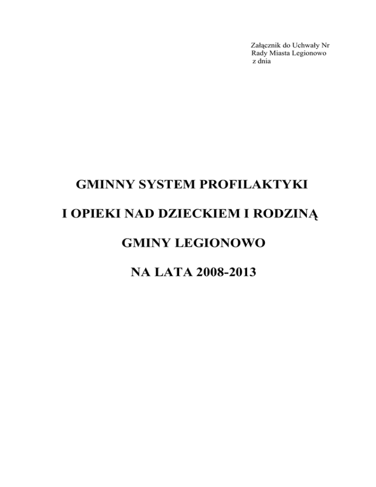 Załącznik do Uchwały Nr Rady Miasta Legionowo z dnia GMINNY SYSTEM PROFILAKTYKI I OPIEKI NAD DZIECKIEM I RODZINĄ GMINY LEGIONOWO NA LATA 2008-2013 WSTĘP W polityce społecznej kwestie dziecka traktujemy z wielką uwagą. Dzieje się tak, gdyż dzieci wymagają szczególnej troski i ochrony, a działalność na ich rzecz koncentrować powinna się przede wszystkim na ochronie praw, wyrównywaniu szans życiowych, rozwojowych poprzez umożliwianie dostępu do oświaty, systemu ochrony zdrowia, wypoczynku oraz pomoc w obliczu ryzyka i zagrożeń życiowych. Niestety mimo wysiłków społeczeństwa, sytuacja dzieci i młodzieży w naszym kraju daleka jest od stanu zadawalającego. Szansą na poprawę tego stanu rzeczy jest budowa lokalnych systemów profilaktyki i opieki nad dzieckiem i rodziną. Niniejszy dokument został opracowany w Ośrodku Pomocy Społecznej w Legionowie. Jest zgodny z art. 17 ust. 1 pkt 13 ustawy z dnia 12 marca 2004r. o pomocy społecznej i ma na celu wzmocnienie pozycji dziecka i rodziny na terenie gminy. Rodzina jako podstawowa komórka społeczna jest pierwszym i najważniejszym środowiskiem dziecka, które ma obowiązek zaspokoić wszystkie jego potrzeby. Przede wszystkim powinna umożliwić prawidłowy rozwój biologiczny i psychospołeczny dziecka. Jest pierwszą instytucją wychowawczą, w której przebiega proces socjalizacji dzieci, kształtowanie ich osobowości oraz przygotowanie do przyszłych ról społecznych. Prawidłowemu funkcjonowaniu rodziny zagraża szereg czynników wśród których istotną rolę odgrywają zjawiska patologiczne . Rodzina w pierwszej kolejności powinna mieć możliwość samodzielnego zmierzenia się ze swoimi problemami, co pozwala zwiększyć jej szansę na prawidłowe funkcjonowanie w środowisku i umacnia więzi między jej członkami. Jednak długotrwałe oddziaływanie na rodzinę zjawisk patologicznych może ją uczynić dysfunkcjonalną, czyli taką która nie potrafi sprostać swoim obowiązkom wobec swoich członków rodziny oraz pomyślnie rozwiązywać problemy i sytuacje kryzysowe. Wsparcie rodziny w takich sytuacjach powinno być w miarę możliwości wczesne i mieć charakter profilaktyczny. Zewnętrzna pomoc instytucjonalna powinna być nakierowana na wykorzystanie zasobów własnych rodziny, na wsparcie osób w rodzinie i aktywizację jej ze środowiskiem lokalnym. Powinno doprowadzić do życiowego usamodzielnienia osób i rodzin z niej korzystających. ____________________________________________________________________________________________________________ SYSTEM PROFILAKTYKI I OPIEKI NAD DZIECKIEM I RODZINĄ GMINY LEGIONOWO 2 I. REGULACJE PRAWNE DOTYCZĄCE RODZINY I DZIECKA Rodzina i dziecko są chronione zarówno w ustawodawstwie międzynarodowym jak i polskim. W Polsce obowiązują akty międzynarodowe ratyfikowane przez nasz kraj odnoszące się do problematyki rodziny. Jednym z nich jest Powszechna Deklaracja Praw Człowieka, której art. 16 stanowi, że rodzina jest naturalną i podstawową komórką społeczeństwa i ma prawo do ochrony ze strony społeczeństwa i państwa. Najważniejszym aktem prawnym regulującym prawa dziecka jest Konwencja o Prawach Dziecka. Postanowienia dotyczące dziecka urodzonego, które nie ukończyło 18 roku życia, obejmują: prawa cywilne, prawo do swobody myśli, sumienia i wyznania, prawo do wychowywania w rodzinie i kontaktów z rodzicami, prawa socjalne oraz kulturalne i polityczne. Konwencja ustanawia status dziecka oparty na założeniach że: dziecko jest samodzielnym podmiotem, ze względu na swoją niedojrzałość psychiczną i fizyczną wymaga szczególnej opieki i ochrony prawnej i jako istota ludzka wymaga poszanowania jego tożsamości, godności i prywatności. Rodzina jest najlepszym środowiskiem wychowania dziecka i wymaga ze strony państwa wsparcia. Tworząc system ochrony dziecka, kierowano się : - zasadą dobra dziecka – wszystkie działania podejmowane są w najlepiej pojętym interesie dziecka; - zasadą równości – wszystkie dzieci, niezależnie od ich cech: koloru skóry, płci, narodowości, mają być równe wobec prawa; - zasadą poszanowania praw i odpowiedzialności obojga rodziców za rozwój i wychowanie dziecka; - ochronie podlega autonomia rodziny i prawa obojga rodziców do decydowania o sprawach dziecka; - zasadą pomocy państwa w zabezpieczaniu odpowiednich warunków socjalnych i zdrowotnych rodziny. Rodzina i dziecko są chronione w ustawodawstwie Unii Europejskiej. Prawny zapis ochrony rodziny i dziecka znajduje się w aktach międzynarodowych oraz konstytucjach poszczególnych państw członkowskich. Istnieją poza tym wspólnotowe akty wtórne dotyczące równego traktowania kobiet, które zwracają uwagę na konieczność godzenia życia ____________________________________________________________________________________________________________ SYSTEM PROFILAKTYKI I OPIEKI NAD DZIECKIEM I RODZINĄ GMINY LEGIONOWO 3 zawodowego z rodzinnym oraz na szczególną ochronę kobiet w ciąży i w okresie macierzyństwa. Konstytucja Rzeczpospolitej Polskiej w art. 18 stanowi, że małżeństwo, macierzyństwo i rodzicielstwo znajdują się pod ochroną i opieką Rzeczpospolitej Polskiej. Podstawowym źródłem polskiego prawa rodzinnego jest Kodeks Rodzinny i Opiekuńczy z 25 lutego 1964 r.( Dz. U. z 1964 nr 9 poz. 59 z późn. zm.) reguluje on: - problematykę zawierania i ustawania małżeństw, - stosunków majątkowych między małżonkami, - obowiązków alimentacyjnych, - pochodzenia dziecka, - stosunków między rodzicami i dziećmi, - instytucji przysposobienia, opieki i kurateli. Ustawa o przeciwdziałaniu przemocy w rodzinie z 29 lipca 2005r.(Dz. U. z 2005r. nr 180 poz. 1493) określa zadania w zakresie przeciwdziałania przemocy w rodzinie, zasady postępowania wobec osób dotkniętych przemocą, oraz zasady postępowania wobec osób stosujących przemoc w rodzinie. Regulacje prawne dotyczące rodziny znajdują s