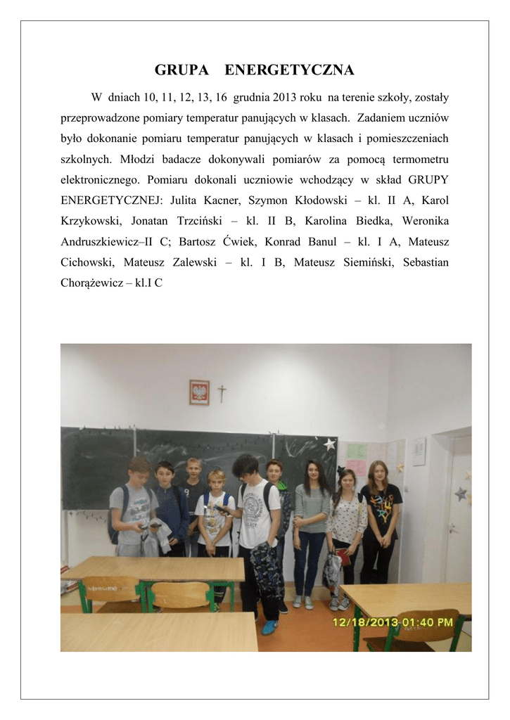GRUPA ENERGETYCZNA W dniach 10, 11, 12, 13, 16 grudnia 2013 roku na terenie szkoły, zostały przeprowadzone pomiary temperatur panujących w klasach. Zadaniem uczniów było dokonanie pomiaru temperatur panujących w klasach i pomieszczeniach szkolnych. Młodzi badacze dokonywali pomiarów za pomocą termometru elektronicznego. Pomiaru dokonali uczniowie wchodzący w skład GRUPY ENERGETYCZNEJ: Julita Kacner, Szymon Kłodowski – kl. II A, Karol Krzykowski, Jonatan Trzciński – kl. II B, Karolina Biedka, Weronika Andruszkiewicz–II C; Bartosz Ćwiek, Konrad Banul – kl. I A, Mateusz Cichowski, Mateusz Zalewski – kl. I B, Mateusz Siemiński, Sebastian Chorążewicz – kl.I C