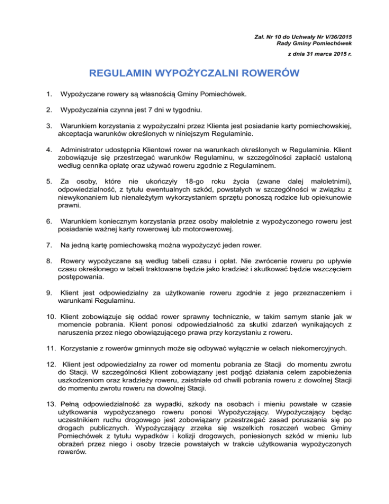 Zał. Nr 10 do Uchwały Nr V/36/2015 Rady Gminy Pomiechówek z dnia 31 marca 2015 r. REGULAMIN WYPOŻYCZALNI ROWERÓW 1. Wypożyczane rowery są własnością Gminy Pomiechówek. 2. Wypożyczalnia czynna jest 7 dni w tygodniu. 3. Warunkiem korzystania z wypożyczalni przez Klienta jest posiadanie karty pomiechowskiej, akceptacja warunków określonych w niniejszym Regulaminie. 4. Administrator udostępnia Klientowi rower na warunkach określonych w Regulaminie. Klient zobowiązuje się przestrzegać warunków Regulaminu, w szczególności zapłacić ustaloną według cennika opłatę oraz używać roweru zgodnie z Regulaminem. 5. Za osoby, które nie ukończyły 18-go roku życia (zwane dalej małoletnimi), odpowiedzialność, z tytułu ewentualnych szkód, powstałych w szczególności w związku z niewykonaniem lub nienależytym wykorzystaniem sprzętu ponoszą rodzice lub opiekunowie prawni. 6. Warunkiem koniecznym korzystania przez osoby małoletnie z wypożyczonego roweru jest posiadanie ważnej karty rowerowej lub motorowerowej. 7. Na jedną kartę pomiechowską można wypożyczyć jeden rower. 8. Rowery wypożyczane są według tabeli czasu i opłat. Nie zwrócenie roweru po upływie czasu określonego w tabeli traktowane będzie jako kradzież i skutkować będzie wszczęciem postępowania. 9. Klient jest odpowiedzialny za użytkowanie roweru zgodnie z jego przeznaczeniem i warunkami Regulaminu. 10. Klient zobowiązuje się oddać rower sprawny technicznie, w takim samym stanie jak w momencie pobrania. Klient ponosi odpowiedzialność za skutki zdarzeń wynikających z naruszenia przez niego obowiązującego prawa przy korzystaniu z roweru. 11. Korzystanie z rowerów gminnych może się odbywać wyłącznie w celach niekomercyjnych. 12. Klient jest odpowiedzialny za rower od momentu pobrania ze Stacji do momentu zwrotu do Stacji. W szczególności Klient zobowiązany jest podjąć działania celem zapobieżenia uszkodzeniom oraz kradzieży roweru, zaistniałe od chwili pobrania roweru z dowolnej Stacji do momentu zwrotu roweru na dowolnej Stacji. 13. Pełną odpowiedzialność za wypadki, szkody na osobach i mieniu powstałe w czasie użytkowania wypożyczanego roweru ponosi Wypożyczający. Wypożyczający będąc uczestnikiem ruchu drogowego jest zobowiązany przestrzegać zasad poruszania się po drogach publicznych. Wypożyczający zrzeka się wszelkich roszczeń wobec Gminy Pomiechówek z tytułu wypadków i kolizji drogowych, poniesionych szkód w mieniu lub obrażeń przez niego i osoby trzecie powstałych w trakcie użytkowania wypożyczonych rowerów. 14. W przypadku kradzieży roweru dokonanej podczas użytkowania Klient ma obowiązek powiadomić o tym administratora oraz niezwłocznie zgłosić fakt kradzieży (rozboju) w najbliższej jednostce Policji. 15. Zabronione jest korzystanie z rowerów przez osoby będące pod wpływem alkoholu lub innych środków odurzających, substancji psychotropowych lub środków zastępczych w rozumieniu przepisów o przeciwdziałaniu narkomanii; silnych leków przeciwalergicznych, innych leków, które z definicji zabraniają lub zalecają powstrzymanie się od kierowania pojazdami. 16. Klient ponosi pełną i całkowitą odpowiedzialność oraz zobowiązuje się do pokrycia wszelkich mandatów, opłat itp. otrzymanych przez Klienta, związanych z użytkowaniem roweru. 17. W przypadku udowodnionych zniszczeń wynikłych z niewłaściwego użytkowania sprzętu wchodzącego w skład systemu wypożyczającego, Klient zgadza się pokryć koszty naprawy i odtworzenia sprzętu do stanu pierwotnego, sprzed pobrania. 18. Jakiekolwiek celowe zniszczenie własności gminy skutkuje wszczęciem postępowania. Administratorowi przysługuje prawo do dochodzenia pokrycia wszelkich uzasadnionych kosztów, w tym kosztów obsługi prawnej, od sprawcy uszkodzeń i zniszczeń. 19. Klient odpowiada za ewentualne szkody powstałe w następstwie niewykonania lub nienależytego wykonania regulaminu do pełnej wysokości. 20. W przypadku uszkodzenia roweru wynikającego z złego użytkowania bądź zdarzenia losowego w trakcie wypożyczenia problem należy niezwłocznie zgłosić administratorowi. 21. Rekomenduje się, aby Klient w trakcie użytkowania roweru posiadał zdolny do wykonywania połączeń telefon komórkowy. 22. W przypadku stwierdzenia podczas wypożyczenia roweru jakiejkolwiek usterki roweru Wypożyczający zobowiązany jest do niezwłocznego zgłoszenia problemu do administratora. 23. Wypożyczenie i korzystanie przez Wypożyczającego z niesprawnego roweru może skutkować jego odpowiedzialnością za usterki lub szkody z tego wynikające, w przypadku gdy Wypożyczający mógł dostrzec niesprawność roweru. 24. Zabronione jest samodzielne dokonywanie jakichkolwiek napraw, modyfikacji, wymiany części w wypożyczonym rowerze. Jedynym uprawnionym podmiotem do tych działań jest administrator. 25. Wypożyczenie roweru jest równoznaczne z akceptacją niniejszego regulaminu i Klient nie ma możliwości odwołania się. 26. Sporne kwestie rozstrzyga administrator bądź osoba wyznaczona przez administratora. TELEFONY KONTAKTOWE: POLICJA 997 POGOTOWIE RATUNKOWE 997 ADMINISTRATOR (22) 765-27-40