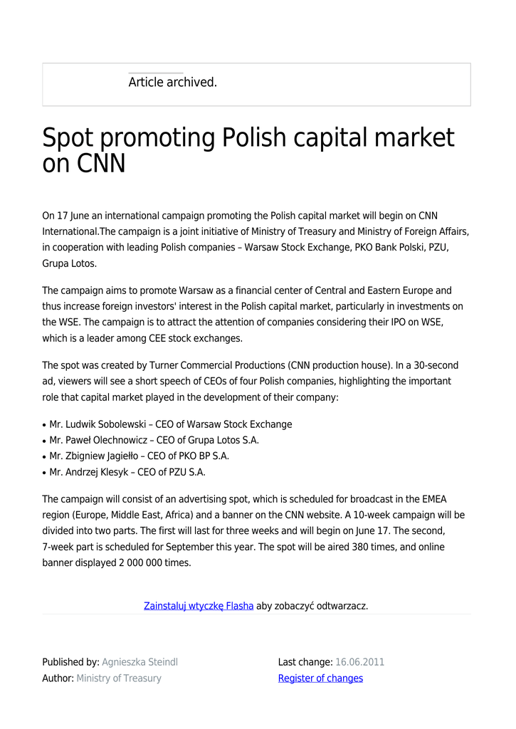 Article archived. Spot promoting Polish capital market on CNN On 17 June an international campaign promoting the Polish capital market will begin on CNN International.The campaign is a joint initiative of Ministry of Treasury and Ministry of Foreign Affairs, in cooperation with leading Polish companies – Warsaw Stock Exchange, PKO Bank Polski, PZU, Grupa Lotos. The campaign aims to promote Warsaw as a financial center of Central and Eastern Europe and thus increase foreign investors' interest in the Polish capital market, particularly in investments on the WSE. The campaign is to attract the attention of companies considering their IPO on WSE, which is a leader among CEE stock exchanges. The spot was created by Turner Commercial Productions (CNN production house). In a 30-second ad, viewers will see a short speech of CEOs of four Polish companies, highlighting the important role that capital market played in the development of their company: ● Mr. Ludwik Sobolewski – CEO of Warsaw Stock Exchange ● Mr. Paweł Olechnowicz – CEO of Grupa Lotos S.A. ● Mr. Zbigniew Jagiełło – CEO of PKO BP S.A. ● Mr. Andrzej Klesyk – CEO of PZU S.A. The campaign will consist of an advertising spot, which is scheduled for broadcast in the EMEA region (Europe, Middle East, Africa) and a banner on the CNN website. A 10-week campaign will be divided into two parts. The first will last for three weeks and will begin on June 17. The second, 7-week part is scheduled for September this year. The spot will be aired 380 times, and online banner displayed 2 000 000 times. Zainstaluj wtyczkę Flasha aby zobaczyć odtwarzacz. Published by: Agnieszka Steindl Last change: 16.06.2011 Author: Ministry of Treasury Register of changes
