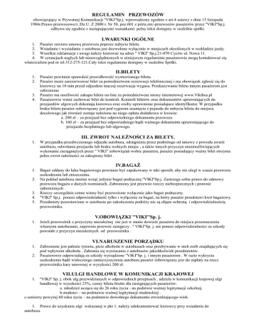 REGULAMIN PRZEWOZÓW obowiązujący w Prywatnej Komunikacji ''VIKI''Sp.j. wprowadzony zgodnie z art.4 ustawy z dnia 15 listopada 1984r.Prawo przewozowe/t.:Dz.U. Z 2000 r. Nr 50, poz.601 z późn.zm/-przewozów pasażerów przez ''VIKI''Sp.j. odbywa się zgodnie z następującymi warunkami: pełny tekst dostępny w siedzibie spółki. I.WARUNKI OGÓLNE 1. Pasażer zawiera umowę przewozu poprzez nabycie biletu. 2. Wsiadanie i wysiadanie z autobusu jest dozwolone wyłącznie w miejscach określonych w rozkładzie jazdy. 3. Wszelkie reklamacje i uwagi należy kierować na adres '' VIKI'' Sp.j.21-070 Cyców ul. Nowa 11. 4. W sytuacjach nagłych lub nieuwzględnionych w niniejszym regulaminie pasażerowie mogą kontaktować się właścicielem pod nr tel.512-275-121.Cały tekst regulaminu dostępny w siedzibie Spółki. II.BILETY 1. 2. 3. 4. Pasażer powinien sprawdzić prawidłowość wystawionego biletu. Pasażer może zarezerwować bilet za pośrednictwem rezerwacji telefonicznej i ma obowiązek zgłosić się do kierowcy na 10 min przed odjazdem inaczej rezerwacja wygasa. Przekazywanie biletu innym pasażerom jest zabronione Pasażer ma możliwość zakupu biletu on-line za pośrednictwem strony internetowej www.Vikibus.pl Pasażerowie winni zachować bilet do kontroli. Kontroli biletów oraz dokumentów uprawniających do przejazdów ulgowych dokonują kierowca oraz osoby uprawnione posiadajace identyfikator. W przypadku braku biletu pasażer zobowiązany jest pod rygorem usunięcia z pojazdu do nabycia biletu do miejsca docelowego jak również zostaje nałożona na niego opłata dodatkowa w kwocie: a. 200 zł – za przejazd bez odpowiedniego dokumentu przewozu b. 160 zł – za przejazd bez odpowiedniego bądź ważnego dokumentu uprawniającego do przejazdu bezpłatnego lub ulgowego. III. ZWROT NALEŻNOŚCI ZA BILETY. 1. W przypadku przedwczesnego odjazdu autobusu, odstąpienia przez podróżngo od umowy z powodu awarii autobusu, odwołania przejazdu lub braku wolnych miejsc , a także innych przyczyn uniemożliwiających wykonanie zaciągniętych przez '' VIKI'' zobowiązań wobec pasażera, pasażer posiadający ważny bilet otrzyma pełen zwrot należności za zakupiony bilet . 1. Bagaż oddany do luku bagażowego powinien być zapakowany w taki sposób, aby nie uległ w czasie przewozu uszkodzeniu lub zniszczeniu. Na pokład autobusu można wziąć jedynie bagaż podręczny.''VIKI''Sp.j. Zastrzega sobie prawo do odmowy przewozu bagażu o dużych rozmiarach. Zabroniony jest przewóz rzeczy niebezpiecznych i prawnie zabronionych . Rzeczy szczególnie cenne winny być przewożone wyłącznie jako bagaż podręczny. ''VIKI'' Sp.j. ponosi odpowiedzialność tylko i wyłącznie za bagaż, na który pasażer przedstawi kwit bagażowy. Przedmioty pozostawione w autobusie po zakończeniu podróży nie są objęte ochroną i odpowiedzialnością przewoźnika. IV.BAGAŻ 2. 3. 4. 5. V.OBOWIĄZKI ''VIKI''Sp. j. 1. Jeżeli przewoźnik z przyczyny niezależnej nie jest w stanie dowieźć pasażera do miejsca przeznaczenia własnymi autobusami, zapewnia przewóz zastępczy . '' VIKI''Sp. j. nie ponosi odpowiedzialności za szkody powstałe z przyczyn niezależnych od przewoźnika . 1. Zabronione jest palenie tytoniu, picie alkoholu w autobusach oraz przebywanie w nich osób znajdujących się pod wpływem alkoholu . Zabrania się wyrzucania z autobusów jakichkolwiek przedmiotów. Pasażerowie odpowiadają za szkody wyrządzone ''VIKI''Sp. j. i innym pasażerom . W razie wykrycia uszkodzenia bądź widocznego zanieczyszczenia autobusu pasażer zobowiązany jesr do zapłaty na rzecz przewoźnika kary umownej w wysykości 200 zł. VI.NARUSZENIE PORZĄDKU 2. VII.ULGI HANDLOWE W KOMUNIKACJI KRAJOWEJ 1. ''VIKI'' Sp. j. obok ulg przewidzianych w odpowiednich przepisach , udziela w komunikacji krajowej ulgi handlowej w wysokości 23%, cenny biletu brutto dla następujących pasażerów: a. młodzież ucząca się do 26 roku życia - na podstwie ważnej legitymacji szkolnej. b.studenci – na podstawie ważnej legitymacji studenckiej . c.seniorzy powyżej 60 roku życia – na podstawie dowolnego dokumentu stwierdzającego wiek. 1. Prawo do uzyskania ulgi wskazanej w pkt 1. należy udokumentować kierowcy przy wsiadaniu do autobusu.