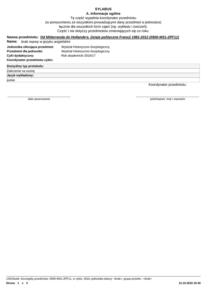 SYLABUS A. Informacje ogólne Tę część wypełnia koordynator