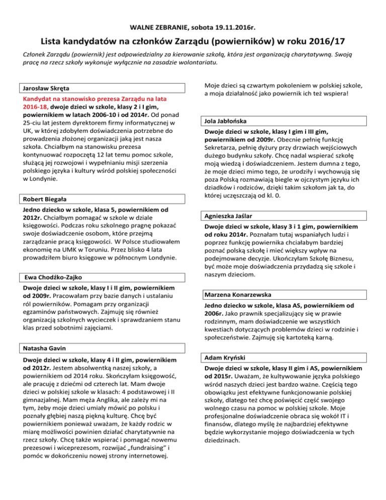 WALNE ZEBRANIE, sobota 19.11.2016r. Lista kandydatów na członków Zarządu (powierników) w roku 2016/17 Członek Zarządu (powiernik) jest odpowiedzialny za kierowanie szkołą, która jest organizacją charytatywną. Swoją pracę na rzecz szkoły wykonuje wyłącznie na zasadzie wolontariatu. Jarosław Skręta Kandydat na stanowisko prezesa Zarządu na lata 2016-18, dwoje dzieci w szkole, klasy 2 i I gim, powiernikiem w latach 2006-10 i od 2014r. Od ponad 25-ciu lat jestem dyrektorem firmy informatycznej w UK, w której zdobyłem doświadczenia potrzebne do prowadzenia złożonej organizacji jaką jest nasza szkoła. Chciałbym na stanowisku prezesa kontynuować rozpoczętą 12 lat temu pomoc szkole, służącą jej rozwojowi i wypełnianiu misji szerzenia polskiego języka i kultury wśród polskiej społeczności w Londynie. Robert Biegała Jedno dziecko w szkole, klasa 5, powiernikiem od 2012r. Chciałbym pomagać w szkole w dziale księgowości. Podczas roku szkolnego pragnę pokazać swoje doświadczenie osobom, które przejmą zarządzanie pracą księgowości. W Polsce studiowałem ekonomię na UMK w Toruniu. Przez blisko 4 lata prowadziłem biuro księgowe w północnym Londynie. Ewa Chodźko-Zajko Dwoje dzieci w szkole, klasy I i II gim, powiernikiem od 2009r. Pracowałam przy bazie danych i ustalaniu ról powierników. Pomagam przy organizacji egzaminów państwowych. Zajmuję się również organizacją szkolnych wycieczek i sprawdzaniem stanu klas przed sobotnimi zajęciami. Moje dzieci są czwartym pokoleniem w polskiej szkole, a moja działalność jako powiernik ich też wspiera! Jola Jabłońska Dwoje dzieci w szkole, klasy I gim i III gim, powiernikiem od 2009r. Obecnie pełnię funkcję Sekretarza, pełnię dyżury przy drzwiach wejściowych dużego budynku szkoły. Chcę nadal wspierać szkołę moją wiedzą i doświadczeniem. Jestem dumna z tego, że moje dzieci mimo tego, że urodziły i wychowują się poza Polską rozmawiają biegle w ojczystym języku ich dziadków i rodziców, dzięki takim szkołom jak ta, do której uczęszczają od kl. 0. Agnieszka Jaślar Dwoje dzieci w szkole, klasy 3 i 1 gim, powiernikiem od roku 2014r. Poznałam tutaj wspaniałych ludzi i poprzez funkcję powiernika chciałabym bardziej poznać polską szkołę i mieć większy wpływ na podejmowane decyzje. Ukończyłam Szkołę Biznesu, być może moje doświadczenia przydadzą się szkole i naszym dzieciom. Marzena Konarzewska Jedno dziecko w szkole, klasa AS, powiernikiem od 2006r. Jako prawnik specjalizujący się w prawie rodzinnym, mam doświadczenie we wszystkich kwestiach dotyczących problemów dzieci w rodzinie i społeczeństwie. Zajmuję się kartoteką karną. Natasha Gavin Dwoje dzieci w szkole, klasy 4 i II gim, powiernikiem od 2012r. Jestem absolwentką naszej szkoły, a powiernikiem od 2014 roku. Skończyłam księgowość, ale pracuję z dziećmi od czterech lat. Mam dwoje dzieci w polskiej szkole w klasach: 4 podstawowej i II gimnazjalnej. Mam męża Anglika, ale zależy mi na tym, żeby moje dzieci umiały mówić po polsku i poznały głębiej naszą piękną kulturę. Chcę być powiernikiem ponieważ uważam, że każdy rodzic w miarę możliwości powinien działać charytatywnie na rzecz szkoły. Chcę także wspierać i pomagać nowemu prezesowi i wiceprezesom, rozwijać „fundraising” i pomóc w dokończeniu nowej strony internetowej. Adam Kryński Dwoje dzieci w szkole, klasy II gim i AS, powiernikiem od 2015r. Uważam, że kultywowanie języka polskiego wśród naszych dzieci jest bardzo ważne. Częścią tego obowiązku jest efektywne funkcjonowanie polskiej szkoły, dlatego też chcę poświęcić część swojego wolnego czasu na pomoc w polskiej szkole. Moje profesjonalne doświadczenie obraca się wokół IT i finansów, dlatego myślę że najbardziej efektywne będzie wykorzystanie mojego doświadczenia w tych dziedzinach. Krystyna Łukasiewicz Dwoje dzieci w szkole, klasy 5 i AS, powiernikiem od 2014r. Polska szkoła odgrywa w życiu mojej rodziny bardzo ważną rolę. Pomaga przekazać mi to, co chciałabym aby moje dzieci wiedziały o naszej ojczyźnie, historii oraz twórczości polskich poetów i pisarzy. Dlatego chciałabym brać czynny udział w funkcjonowaniu szkoły, oraz pomagać w miarę moich możliwości. Obecnie pomagam przy zapisach i bazie danych. Grażyna Perkowska Jedno dziecko w szkole, klasa I gim, powiernikiem od 2013r. Moja córka od 7 lat uczęszcza do polskiej szkoły na Ealingu. Od 5 lat pomagam w szkole w finansach: przy opłatach, w komisji finansowej, prowadzę system Home Contact. Mam doświadczenie w księgowości, w dziale reklam i fotografii. Wraz z dziećmi współredaguje gazetkę „Głos Ucznia”. Joanna Rutkowska Jedno dziecko w szkole, w klasie I gim, powiernikiem od 2013r. Mając wykształcenie pedagogiczne oraz trzyletnie doświadczenie zdobyte podczas prac charytatywnych na rzecz polskiej szkoły na Ealingu, chciałabym mieć dalszy wkład w rozwój i prężne funkcjonowanie tejże placówki. Obecnie zajmuje się organizacją dyżurów w szkole. Paweł Rutkowski Jedno dziecko w szkole, w klasie I gim, powiernikiem od 2013r. Od pięciu lat mój syn jest uczniem polskiej szkoły na Ealingu. Jestem absolwentem Akademii Wychowania Fizycznego, i ukończyłem Uniwersytet Gdański. Od 2003 roku mieszkam w Londynie, a od 2013r. jestem Powiernikiem Szkoły. Poświęcenie, determinacja i charaktery woluntariuszy budują tak niesamowitą atmosferę, że byłbym zaszczycony będąc częścią tak szacownego grona. Posiadam sporo doświadczenia w organizacji i zarządzaniu, które chętnie wykorzystam w pracy na rzecz szkoły. Ania Smolkowska Jedno dziecko w szkole, klasa II gim, powiernikiem od 2015r. Ze szkołą związana jestem od kilku lat; przez ostatni rok również jako powiernik, co chciałabym kontynuować. Kandydując do roli powiernika oferuję dziesięcioletnie doświadczenie pozyskane w pracy z dziećm