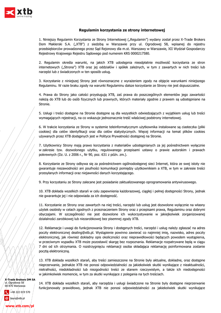 Regulamin korzystania ze strony internetowej 1. Niniejszy Regulamin Korzystania ze Strony Internetowej („Regulamin”) wydany został przez X-Trade Brokers Dom Maklerski S.A. („XTB”) z siedzibą w Warszawie przy ul. Ogrodowej 58, wpisanej do rejestru przedsiębiorców prowadzonego przez Sąd Rejonowy dla m.st. Warszawy w Warszawie, XII Wydział Gospodarczy Rejestrowy Krajowego Rejestru Sądowego pod numerem KRS 0000217580. 2. Regulamin określa warunki, na jakich XTB udostępnia nieodpłatnie możliwość korzystania ze stron internetowych („Strona”) XTB oraz jej oddziałów i spółek zależnych, w tym z zawartych w nich treści lub narzędzi lub z świadczonych w ten sposób usług. 3. Korzystanie z niniejszej Strony jest równoznaczne z wyrażeniem zgody na objęcie warunkami niniejszego Regulaminu. W razie braku zgody na warunki Regulaminu dalsze korzystanie ze Strony nie jest dopuszczalne. 4. Prawa do Strony jako całości przysługują XTB, zaś prawa do poszczególnych elementów jego zawartości należą do XTB lub do osób fizycznych lub prawnych, których materiały zgodnie z prawem są udostępniane na Stronie. 5. Usługi i treści dostępne na Stronie dostępne są dla wszystkich odwiedzających z wyjątkiem usług lub treści wymagających rejestracji, na co wskazuje jednoznacznie treść właściwej podstrony internetowej. 6. W trakcie korzystania ze Strony w systemie teleinformatycznym użytkownika instalowane są ciasteczka (pliki cookies) dla celów identyfikacji oraz dla celów statystycznych. Więcej informacji na temat plików cookies używanych przez XTB dostępnych jest w Polityce Prywatności dostępnej na Stronie. 7. Użytkownicy Strony mają prawo korzystania z materiałów udostępnianych za jej pośrednictwem wyłącznie w zakresie tzw. dozwolonego użytku, regulowanego przepisami ustawy o prawie autorskim i prawach pokrewnych (Dz. U. z 2006 r., Nr 90, poz. 631 z późn. zm.). 8. Korzystanie ze Strony odbywa się za pośrednictwem ogólnodostępnej sieci Internet, która ze swej istoty nie gwarantuje niezawodności ani poufności komunikacji pomiędzy użytkownikiem a XTB, w tym w zakresie treści przesyłanych informacji oraz niejawności danych korzystającego. 9. Przy korzystaniu ze Strony zalecane jest posiadanie zaktualizowanego oprogramowania antywirusowego. 10. XTB dokłada wszelkich starań w celu zapewnienia każdorazowej, ciągłej i pełnej dostępności Strony, jednak nie gwarantuje jej i nie odpowiada za ich dostępność. 11. Korzystanie ze Strony oraz zawartych na niej treści, narzędzi lub usług jest dozwolone wyłącznie na własny użytek osobisty w celach zgodnych z przeznaczeniem Strony oraz z przepisami prawa, Regulaminu oraz dobrymi obyczajami. W szczególności nie jest dozwolone ich wykorzystywanie w jakiejkolwiek zorganizowanej działalności zarobkowej lub niezarobkowej bez pisemnej zgody XTB. 12. Reklamacje i uwagi do funkcjonowania Strony i dostępnych treści, narzędzi i usług należy zgłaszać na adres poczty elektronicznej [email protected]. Wystąpienie powinno zawierać co najmniej imię, nazwisko, adres poczty elektronicznej, jak również dokładny opis okoliczności oraz nieprawidłowości będących powodem wystąpienia, w przeciwnym wypadku XTB może pozostawić skargę bez rozpoznania. Reklamacje rozpatrywane będą w ciągu 7 dni od ich otrzymania. O rozstrzygnięciu reklamacji osoba składająca reklamację poinformowana zostanie pocztą elektroniczną. 13. XTB dokłada wszelkich starań, aby treści zamieszczone na Stronie były aktualne, dokładne, oraz dostępne nieprzerwanie, jednakże XTB nie ponosi odpowiedzialności za jakiekolwiek skutki wynikające z nieaktualności, nietrafności, niedokładności lub niezgodności treści ze stanem rzeczywistym, a także ich niedostępności w jakimkolwiek momencie, w tym za skutki wynikające z polegania na tych treściach. X-Trade Brokers DM SA ul. Ogrodowa 58 00-876 Warszawa +48 222 019 570 [email protected] www.xtb.com/pl 14. XTB dokłada wszelkich starań, aby narzędzia i usługi świadczone na Stronie były dostępne nieprzerwanie funkcjonowały prawidłowo, jednak XTB nie ponosi odpowiedzialności za jakiekolwiek skutki wynikające z nieprawidłowego ich działania lub niedostępności w jakimkolwiek momencie, w tym skutki wynikające z posługiwania się narzędziami i usługami. 15. XTB dokłada wszelkich starań, aby Strona była wolne od złośliwego oprogramowania, jednak XTB nie ponosi odpowiedzialności za skutki korzystania ze stron w systemie teleinformatycznym korzystającego, w tym infrastrukturze technicznej i danych. 16. XTB nie ponosi odpowiedzialności za prawidłowość działania operatorów zapewniających łączność ze Stroną zarówno po stronie XTB i osób korzystających ze Strony. 17. XTB nie ponosi odpowiedzialności za skutki nieprawidłowego korzystania ze Stron, w tym za skutki blokady lub anulowania rejestracji przez XTB. 18. XTB nie ponosi odpowiedzialności za prawne, finansowe i jakiekolwiek inne konsekwencje użycia przez użytkownika informacji zamieszczonych na Stronie. XTB nie odpowiada za szkody lub straty użytkownika lub osób trzecich związane w jakikolwiek sposób z wykorzystaniem tych informacji, w tym do podjęcia decyzji w indywidualnej sprawie. Korzystanie przez użytkownika ze Strony odbywa się na jego własne ryzyko. 19. XTB jest uprawniony do zmiany Regulaminu w każdym momencie. Zmiana Regulaminu nie wymaga uprzedzenia i wchodzi w życie z momentem publikacji nowej wersji Regulaminu na Stronie. O zmianach Regulaminu XTB informuje przez ogłoszenie nowego Regulaminu na Stronie w zakładce „Nowości w XTB” oraz Regulacje podstrona „Zarządzenia”. W przypadku braku zgody na zmianę Regulaminu dalsze korzystanie ze Strony nie jest dopuszczalne. 20. XTB może w każdym momencie zmienić zakres lub rodzaj treści dostępnych na Stronie, a także rozszerzyć, zmienić, ograniczyć lub zaprzestać ofero