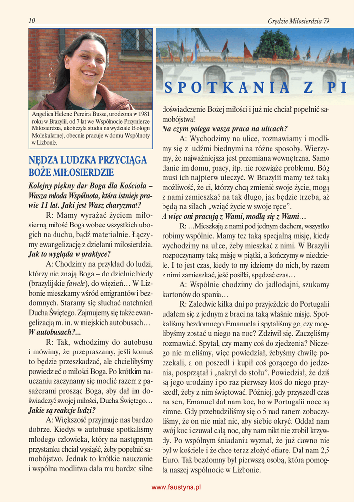 10 Orędzie Miłosierdzia 79 SPOTKANIA Z PI Angelica Helene Pereira Busse, urodzona w 1981 roku w Brazylii, od 7 lat we Wspólnocie Przymierze Miłosierdzia, ukończyła studia na wydziale Biologii Molekularnej, obecnie pracuje w domu Wspólnoty w Lizbonie. NÊDZA LUDZKA PRZYCI¥GA BO¯E MI£OSIERDZIE Kolejny piękny dar Boga dla Kościoła – Wasza młoda Wspólnota, która istnieje prawie 11 lat. Jaki jest Wasz charyzmat? R: Mamy wyrażać życiem miłosierną miłość Boga wobec wszystkich ubogich na duchu, bądź materialnie. Łączymy ewangelizację z dziełami miłosierdzia. Jak to wygląda w praktyce? A: Chodzimy na przykład do ludzi, którzy nie znają Boga – do dzielnic biedy (brazylijskie fawele), do więzień… W Lizbonie mieszkamy wśród emigrantów i bezdomnych. Staramy się słuchać natchnień Ducha Świętego. Zajmujemy się także ewangelizacją m. in. w miejskich autobusach… W autobusach?... R: Tak, wchodzimy do autobusu i mówimy, że przepraszamy, jeśli komuś to będzie przeszkadzać, ale chcielibyśmy powiedzieć o miłości Boga. Po krótkim nauczaniu zaczynamy się modlić razem z pasażerami prosząc Boga, aby dał im doświadczyć swojej miłości, Ducha Świętego… Jakie są reakcje ludzi? A: Większość przyjmuje nas bardzo dobrze. Kiedyś w autobusie spotkaliśmy młodego człowieka, który na następnym przystanku chciał wysiąść, żeby popełnić samobójstwo. Jednak to krótkie nauczanie i wspólna modlitwa dała mu bardzo silne doświadczenie Bożej miłości i już nie chciał popełnić samobójstwa! Na czym polega wasza praca na ulicach? A: Wychodzimy na ulice, rozmawiamy i modlimy się z ludźmi biednymi na różne sposoby. Wierzymy, że najważniejsza jest przemiana wewnętrzna. Samo danie im domu, pracy, itp. nie rozwiąże problemu. Bóg musi ich najpierw uleczyć. W Brazylii mamy też taką możliwość, że ci, którzy chcą zmienić swoje życie, mogą z nami zamieszkać na tak długo, jak będzie trzeba, aż będą na siłach „wziąć życie w swoje ręce”. A więc oni pracują z Wami, modlą się z Wami… R: …Mieszkają z nami pod jednym dachem, wszystko robimy wspólnie. Mamy też taką specjalną misję, kiedy wychodzimy na ulice, żeby mieszkać z nimi. W Brazylii rozpoczynamy taką misję w piątki, a kończymy w niedziele. I to jest czas, kiedy to my idziemy do nich, by razem z nimi zamieszkać, jeść posiłki, spędzać czas… A: Wspólnie chodzimy do jadłodajni, szukamy kartonów do spania… R: Zaledwie kilka dni po przyjeździe do Portugalii udałem się z jednym z braci na taką właśnie misję. Spotkaliśmy bezdomnego Emanuela i spytaliśmy go, czy moglibyśmy zostać u niego na noc? Zdziwił się. Zaczęliśmy rozmawiać. Spytał, czy mamy coś do zjedzenia? Niczego nie mieliśmy, więc powiedział, żebyśmy chwilę poczekali, a on poszedł i kupił coś gorącego do jedzenia, posprzątał i „nakrył do stołu”. Powiedział, że dziś są jego urodziny i po raz pierwszy ktoś do niego przyszedł, żeby z nim świętować. Później, gdy przyszedł czas na sen, Emanuel dał nam koc, bo w Portugalii noce są zimne. Gdy przebudziliśmy się o 5 nad ranem zobaczyliśmy, że on nie miał nic, aby siebie okryć. Oddał nam swój koc i czuwał całą noc, aby nam nikt nie zrobił krzywdy. Po wspólnym śniadaniu wyznał, że już dawno nie był w kościele i że chce teraz złożyć ofiarę. Dał nam 2,5 Euro. Tak bezdomny był pierwszą osobą, która pomogła naszej wspólnocie w Lizbonie. www.faustyna.pl lipiec, sierpień, wrzesień 2011 11 ELGRZYMAMI Jesteście z ludźmi biednymi nie tylko materialnie, ale i duchowo? R: Chcemy być mostem między bogatymi, którzy mogą pomóc ubogim i ubogimi, którzy mogą pomóc bogatym. Kiedy otwieraliśmy nasz dom w fawelach w Sao Paolo, dzielnica, do której zaprosił nas kardynał, była jedną z najniebezpieczniejszych – 10 morderstw tygodniowo. Po roku naszego pobytu między nimi: wspólnego życia, wspólnej modlitwy, ewangelizacji od środka – zmieniły się statystyki. Jedno morderstwo rocznie. Szef mafii narkotykowej, która tam działała, darzył misjonarzy dużym szacunkiem i zaufaniem, a ci prosili go, żeby zamiast zabijać osobę, z którą „miał problemy”, pozwolił im z nią porozmawiać. Tak rozwiązywali wszystkie problemy. Czy to wszystko ma coś wspólnego ze świętą Siostrą Faustyną? A: W „Dzienniczku” czytamy, że nawet największy grzesznik może stać się największym świętym, jeśli tylko zaufa… Mocno w to wierzymy i doświadczamy tego. Poza tym Siostra Faustyna jest z nami od początku. Podczas jej kanonizacji dostaliśmy znak od Boga potwierdzający, że pragnie założenia Wspólnoty Przymierza Miłosierdzia. R: Do naszej wspólnoty należą także osoby chore, które przyjmują swoje cierpienie i ofiarują je Bogu prosząc o nawrócenie grzeszników. Niedawno zmarł na raka skóry 19 letni Paul Roberto, który dziękował Bogu za to, że może zrobić coś dla innych, że może innym pomóc swoim cierpieniem. Odnalazł w charyzmacie miłosierdzia swoje powołanie i był szczęśliwy. My wierzymy w to, że nędza ludzka przyciąga Boże miłosierdzie. Mówi o tym także świadectwo Jose Carlosa, który należał do gangu, zabił wiele osób. Chodził jednak do kościoła. Któregoś dnia na Mszy Świętej śpiewaliśmy pieśń uwielbiającą Jezusa. Podczas śpiewu został uzdrowiony z niewielkiego paraliżu dłoni, dzięki czemu mógł całym sobą włączyć się w uwielbienie. To był moment jego nawrócenia. Zaczął codziennie do nas przychodzić. Bardzo mocno doświadczył obecności Boga. Zerwał z gangiem, Rafael Ferreira de Brito, urodzony w 1983 roku w Brazylii, od 10 lat we Wspólnocie Przymierze Miłosierdzia, obecnie pracuje w domu Wspólnoty w Lizbonie i jest koordynatorem misji na Europę. a oni chcieli, żeby wrócił, nalegali, ale on już wybrał Boga i życie zgodne z Ewangelią. Grozili mu, aż w