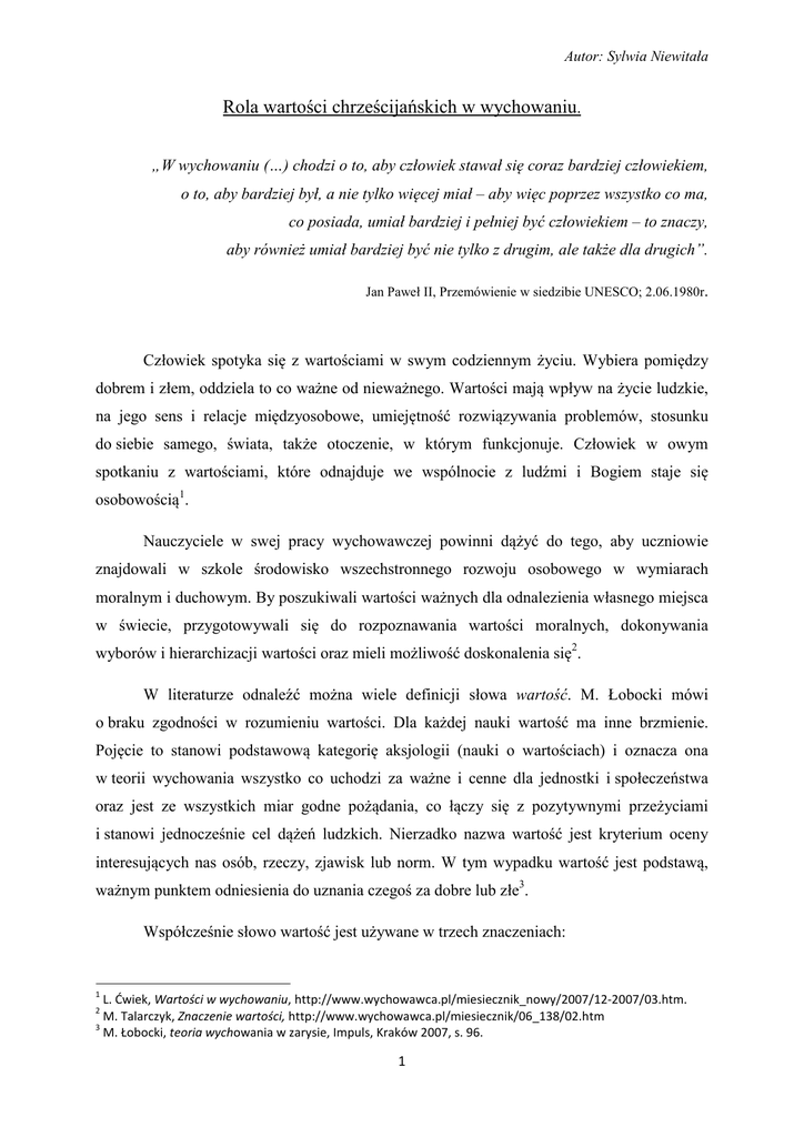 Autor: Sylwia Niewitała Rola wartości chrześcijańskich w wychowaniu. „W wychowaniu (…) chodzi o to, aby człowiek stawał się coraz bardziej człowiekiem, o to, aby bardziej był, a nie tylko więcej miał – aby więc poprzez wszystko co ma, co posiada, umiał bardziej i pełniej być człowiekiem – to znaczy, aby również umiał bardziej być nie tylko z drugim, ale także dla drugich”. Jan Paweł II, Przemówienie w siedzibie UNESCO; 2.06.1980r. Człowiek spotyka się z wartościami w swym codziennym życiu. Wybiera pomiędzy dobrem i złem, oddziela to co ważne od nieważnego. Wartości mają wpływ na życie ludzkie, na jego sens i relacje międzyosobowe, umiejętność rozwiązywania problemów, stosunku do siebie samego, świata, także otoczenie, w którym funkcjonuje. Człowiek w owym spotkaniu z wartościami, które odnajduje we wspólnocie z ludźmi i Bogiem staje się osobowością1. Nauczyciele w swej pracy wychowawczej powinni dążyć do tego, aby uczniowie znajdowali w szkole środowisko wszechstronnego rozwoju osobowego w wymiarach moralnym i duchowym. By poszukiwali wartości ważnych dla odnalezienia własnego miejsca w świecie, przygotowywali się do rozpoznawania wartości moralnych, dokonywania wyborów i hierarchizacji wartości oraz mieli możliwość doskonalenia się2. W literaturze odnaleźć można wiele definicji słowa wartość. M. Łobocki mówi o braku zgodności w rozumieniu wartości. Dla każdej nauki wartość ma inne brzmienie. Pojęcie to stanowi podstawową kategorię aksjologii (nauki o wartościach) i oznacza ona w teorii wychowania wszystko co uchodzi za ważne i cenne dla jednostki i społeczeństwa oraz jest ze wszystkich miar godne pożądania, co łączy się z pozytywnymi przeżyciami i stanowi jednocześnie cel dążeń ludzkich. Nierzadko nazwa wartość jest kryterium oceny interesujących nas osób, rzeczy, zjawisk lub norm. W tym wypadku wartość jest podstawą, ważnym punktem odniesienia do uznania czegoś za dobre lub złe3. Współcześnie słowo wartość jest używane w trzech znaczeniach: 1 L. Ćwiek, Wartości w wychowaniu, http://www.wychowawca.pl/miesiecznik_nowy/2007/12-2007/03.htm. M. Talarczyk, Znaczenie wartości, http://www.wychowawca.pl/miesiecznik/06_138/02.htm 3 M. Łobocki, teoria wychowania w zarysie, Impuls, Kraków 2007, s. 96. 2 1 Autor: Sylwia Niewitała • Po pierwsze, słowo to oznacza albo własność rzeczy, albo rzecz, która jest obdarzona tą własnością. • Po drugie, w mowie potocznej słowo wartość ma znaczenie dodatnie, natomiast w języku filozofii jest ono także używane w znaczeniu ujemnym. W życiu codziennym mówi się, że wartością jest zdrowie, miłość, sprawiedliwość, natomiast brzydota, choroba, kłamstwo nie są wartościami. W języku filozoficznym są to wartości negatywne, ujemne. • Po trzecie, wartości w sensie szerszym to wartości filozoficzne, a w węższym to wartości gospodarcze, na przykład wartość ekonomiczna, w szczególności cena4. Wartościami najwyższymi są wartości religijne, trwale włączone w ludzką naturę, są nieporównywalne z żadnymi innymi wartościami. Max Scheler uwypuklił drogę wartości ku Bogu, zwrócił uwagę na to, że wśród istniejących wartości najwyższą ich odmianę stanowią wartości religijne, które finalizują się ostatecznie w wartości absolutnej, to jest w Bogu5. Poniżej przedstawiłam hierarchię wartości tegoż filozofa niemieckiego Maxa Schelera, który podaje, że na drabinie wartości należy od dołu wymienić: 1. Wartości hedonistyczne – przyjemne - nieprzyjemne lub też - wygodne - niewygodne. Hedonizm może być zmysłowy, intelektualny (duchowy). Można powiedzieć, że to wartości zmysłowe - obejmują przedmioty przyjemności i bólu oraz różnego rodzaju dobra użytkowe; 2. Wartości witalne – np. życie, zdrowie, sytość, tężyzna fizyczna, sprężystość ciała itd. Zdaniem Schelera życie jest wartością podstawową, ale nie jedyną i ostateczną. Błąd witalizmu polega na tym, że uznaje on ważność wartości witalnych, ale odrzuca inne wartości; 3. Wartości duchowe – prawda, dobro i piękno. Z prawdą wiąże się prawdomówność, rzetelność, obiektywność, wszechstronność, a także mądrość, przenikliwość, umiejętność dobrej rady. 4 5 M. Talarczyk, Znaczenie wartości, dz. cyt. Tamże. 2 Autor: Sylwia Niewitała Nosicielem wartości duchowych jest człowiek jako osoba. To nie ciało, ale osoba jest mężna, obiektywna, prawdomówna, sprawiedliwa. Hierarchia wartości nie zatrzymuje się na wartościach duchowych, lecz daje szansę otwarcia się na sferę absolutności, tj. świętości. 4. Świętość – jest to najbardziej specyficznie ludzkie doświadczenie aprioryczne, tzn. niemające swego źródła w doczesności. Doświadczenie to, przekracza wszelkie inne doświadczenia, odzwierciedla się w człowieku jako osobie w postaci czegoś, co jednocześnie budzi bojaźń i pociąga (fascynuje) ku sobie. Świętość jest źródłem religii i religijności6. Hierarchię wartości w postaci graficznej można przedstawić w formie stożka: Im wyżej umieszczona jest wartość, tym większą ma moc nadawania sensu i kształtu wartościom niższym w hierarchii. Wszystkie wartości razem stanowią system, który wyraża pełnię osoby ludzkiej, ale absolutyzowanie którejś z nich lub eliminowanie jednej z nich w systemie prowadzi do dewiacji osobowości. Wartości nie są poddane czasowi. Czas ma władzę nad życiem ludzkim, stąd włączenie wartości w życie ludzkie kieruje go w stronę niezniszczalności, wieczności, transcendencji. Świętość z najwyższego pułapu wartości przenika niższe wartości i utrwala to, co chwilowe (czasowe), przemienia je w to, co wieczne i niezmienne. To dzięki świętości wartości z niższego szczebla otrzymują właściwy sobie sens. Wartości hedonistyczne, witalne i duchowe nie mają sensu same dla s