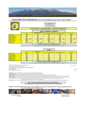 Uzdrowisko Nowy Smokowiec a. s., Nowy Smokowiec 30, 062 01 Tatry Wysokie www.kupelens.sk [email protected] tel: +421 (0) 52 44 22 454-5-6 fax: +421 (0) 52 44 23 140 hotel PALACE***, hotel BRANISKO***, hotel PALACE GRAND**** ZIMA, WIÓSNA, JESIEŃ 1/2 KWC 1/2 pokój LUX - PALACE GRAND**** 50 48 45 239 -49 € 109 129 50 -30% Pobyt leczniczy Pobyt relaksacyjny Pobyt paraleczniczy Wellness tydzień Wellness weekend TYi JA weekend Dla seniorów 1/2, 1/3 i więcej, apartament 1/2 z przysznicem, bez WC prszystawka 57 67 40 55 65 38 54 64 35 279 -49 € 329 - 49 € 189 - 49 € 119 129 89 139 149 109 57 -30% 67 -30% 40 -30% GRATIS: dostęp do internetu, pingpong, biliard 38 36 33 179 - 49 € 85 105 38 -30% przy pobytach trwających 5 nocy i dłużej 50% zniżki na wstep do Witalnego Świata a 20% na zabiegi LATO 1/2 KWC 1/2 pokój LUX - PALACE GRAND**** 54 52 49 269 119 139 Pobyt leczniczy Pobyt relaksacyjny Pobyt paraleczniczy Wellness tydzień Wellness weekend TY i JA weekend 1/2, 1/3 i więcej, apartament 1/2 z prysznicem, bez WC prszystawka 61 71 44 59 69 42 58 68 41 299 349 219 129 139 99 149 159 109 GRATIS: dostęp do internetu, pingpong, biliard 42 40 39 209 95 105 przy pobytach trwających 5 nocy i dłużej 50% zniżki na wstep do Witalnego Świata a 20% na zabiegi Dopłata w przypadku zakwaterowania 1 osoby: 13 € /noc 602,52 Sk / 903,78 Sk Nie wykonujemy zabiegów dzieciom do lat 15. Pobyty lecznicze, relaksacyjne i programowe nie zawierają podatku VAT. Parking gratisowy. 60,25 Sk Opłata klimatyczna 1 euro / dzień. 30,126 Sk Pobyt leczniczy (min. 7 nocy): zakwaterowanie, 3 posiłki dziennie, konsultacja lekarska, 3 zabiegi dziennie Pobyt relaksacyjny (min. 3 noce): zakwaterowanie, śniadania+kolacje, konsultacja lekarska, 2 zabiegi dziennie Pobyt paraleczniczy: zakwaterowanie, śniadania + kolacje, konsultacja lekarska, 1 zabieg dziennie do wyboru (oprócz niedziel), wstęp na basen gratis Wellness tydzień ( 5nocy ): zakwaterowanie, śniadania+kolacje, konsultacja lekarska, 6 zabiegów, 2x wstęp do Witalnego Świata, wstęp wolny do fitness i na basen + misa owoców na powitanie Wellness weekend ( 2 noce ): zakwaterowanie, śniadania+kolacje, konsultacja lekarska, 2 zabiegi, 1x wstep do Witalnego Świata, wstep wolny do fitness i na basen + misa owoców na powitanie TY i JA weekend (2 noce): zakwaterowanie, butelka sektu na pokoju, śniadania, kolacje przi swiecach w restauracji Svist, konsultacja lekarska, 2x wstep do Witalnego Świata, wstep wolny do fitness i na basen + misa owoców na powitanie Dla seniorów (min. 6 nocy,wiek: ponad 60 lat) /obowiązuje tylko w okresie 01.11-22.12/: zakwaterowanie, pełne wyżwywienie, konsultacja lekarska, 2 zabiego dziennie, wstęp na basen gratis Pobyt w naszym uzdrowisku będzie doskonałym prezentem dla najbliższych. Goście zakwaterowani w naszych hotelach otrzymają 10% zniżki w stylowej restauracji Svišť . NOWOŚĆ - WITALNY ŚWIAT (sauna parowa, sauna eukaliptusowa, infra sauna, kneippowe łaźnie, "lodopad", tepidarium, jacuzzi, bicze wodne, fińskie wiadro, inhalacja solna) W Nowym Smokowcu 7.7.2009 Ing. Jozef Vilim Dyrektor generalny