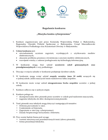 Regulamin konkursu „Muzyka kontra cyberprzemoc” 1. Konkurs organizowany jest przez Komendę Wojewódzką Policji w Białymstoku, Regionalny Ośrodek Polityki Społecznej w Białymstoku, Urząd Marszałkowski Województwa Podlaskiego oraz Kuratorium Oświaty w Białymstoku. 2. Celem konkursu jest: uświadomienie uczniom zagrożeń, wynikających z użytkowania mediów elektronicznych, ukazanie problemu przemocy rówieśniczej z użyciem mediów elektronicznych, rozwijanie wiedzy z zakresu posługiwania się technologią informacyjną. 3. W konkursie mogą brać udział ponadgimnazjalnych z woj. podlaskiego. uczniowie szkół gimnazjalnych oraz 4. Decyzję o wzięciu udziału w konkursie podejmuje dyrektor szkoły. 5. W konkursie mogą wziąć udział zespoły uczniów (max 10 osób) uczących się w jednej szkole. Jeden nauczyciel może nadzorować kilka zespołów. 6. W konkursie może wziąć udział nieograniczona liczba zespołów uczniów z jednej szkoły. 7. Konkurs odbywa się w jednym etapie. 8. Konkurs polega na: skomponowaniu słów piosenki przez uczniów w szkole pod nadzorem nauczyciela, nagraniu teledysku do słów skomponowanej piosenki. 9. Treść piosenki oraz teledysk mogą dotyczyć następujących tematów: Ochrona prywatności w sieci. Uzależnienie od Internetu. Zagrożenia w sieci (np. cyberprzemoc). Zasady bezpiecznego korzystania z Internetu. 10. Przy ocenie będzie brana pod uwagę: wartość merytoryczna przedstawionych treści (słowa piosenki), forma prezentacji teledysku. 1 11. Zasady techniczne i prawne: Wymagania techniczne: teledysk nie może trwać dłużej niż 5 min, pliki nagrany w formatach np. AVI, Windows Media Player, plik nagrany powinien być na płytkę CD. Prawa autorskie: wszystkie użyte materiały na stronie muszą być zgodne z ustawą z dnia 4 lutego 1994r. o prawie autorskim i prawach pokrewnych (Dz.U. 2006 Nr 90, poz. 631), każdy z elementów projektu musi być autorski, organizator konkursu może odmówić przyznania nagrody za projekt, który został w całości lub częściowo skopiowany. 12. Projekt należy nadesłać do dnia 14 marca 2016 roku na płycie CD, wraz z wypełnionym formularzem zgłoszeniowym dostępnym na stronie internetowej: www.podlaska.policja.gov.pl - na adres: Wydział Prewencji KWP w Białymstoku ul. Sienkiewicza 65 Białystok 15 – 003 z dopiskiem Konkurs „Muzyka kontra cyberprzemoc” 13. Wyniki konkursu zostaną opublikowane na stronie: www.podlaska.policja.gov.pl 14. Skład komisji konkursowej: przedstawiciel KWP w Białymstoku, przedstawiciel Regionalnego Ośrodka Polityki Społecznej w Białymstoku, przedstawiciel Urzędu Marszałkowskiego Województwa Podlaskiego, przedstawiciel Kuratorium Oświaty w Białymstoku. 15. Spośród uczestników konkursu Jury wyłoni 3 zespoły uczniów (max 10 osób zaangażowanych w przedsięwzięcie), którzy otrzymają nagrody główne za miejsce pierwsze, drugie oraz trzecie. Nagrody przyznane zostaną zespołowi. 16. Osoby uczestniczące w konkursie wyrażają zgodę na przetwarzanie przez organizatora ich danych osobowych w zakresie koniecznym do prawidłowego przeprowadzenia konkursu oraz ogłoszenia jego wyników. 17. Zgłoszenie konkursowe jest równoznaczne z oświadczeniem autora, że nie narusza on praw osób trzecich, a w szczególności majątkowych i osobistych praw autorskich. 18. Autorskie prawa majątkowe zostają przez uczestników Konkursu przeniesione nieodpłatnie na rzecz organizatorów konkursu bez ograniczeń czasowych i terytorialnych, na polach eksploatacji wskazanych w art. 50 ustawy o prawie autorskim i prawach pokrewnych. 19. Zgłoszenie projektu do konkursu oznacza przyjęcie warunków uczestnictwa określonych niniejszym Regulaminem. 2