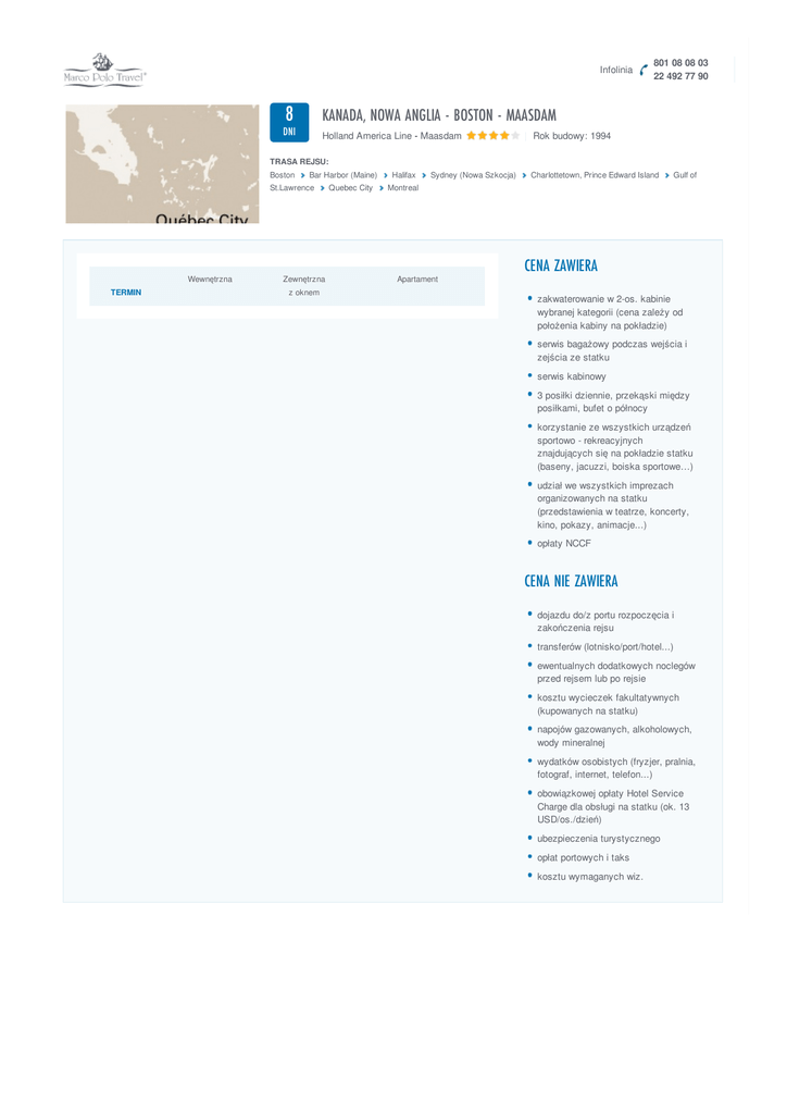 Infolinia 8 KANADA, NOWA ANGLIA - BOSTON - MAASDAM DNI Holland America Line - Maasdam 801 08 08 03 22 492 77 90 | Rok budowy: 1994 TRASA REJSU: Boston Bar Harbor (Maine) St.Lawrence Wewnętrzna TERMIN Zewnętrzna z oknem Quebec City Halifax Sydney (Nowa Szkocja) Charlottetown, Prince Edward Island Gulf of Montreal Apartament CENA ZAWIERA zakwaterowanie w 2-os. kabinie wybranej kategorii (cena zależy od położenia kabiny na pokładzie) serwis bagażowy podczas wejścia i zejścia ze statku serwis kabinowy 3 posiłki dziennie, przekąski między posiłkami, bufet o północy korzystanie ze wszystkich urządzeń sportowo - rekreacyjnych znajdujących się na pokładzie statku (baseny, jacuzzi, boiska sportowe…) udział we wszystkich imprezach organizowanych na statku (przedstawienia w teatrze, koncerty, kino, pokazy, animacje...) opłaty NCCF CENA NIE ZAWIERA dojazdu do/z portu rozpoczęcia i zakończenia rejsu transferów (lotnisko/port/hotel...) ewentualnych dodatkowych noclegów przed rejsem lub po rejsie kosztu wycieczek fakultatywnych (kupowanych na statku) napojów gazowanych, alkoholowych, wody mineralnej wydatków osobistych (fryzjer, pralnia, fotograf, internet, telefon...) obowiązkowej opłaty Hotel Service Charge dla obsługi na statku (ok. 13 USD/os./dzień) ubezpieczenia turystycznego opłat portowych i taks kosztu wymaganych wiz.