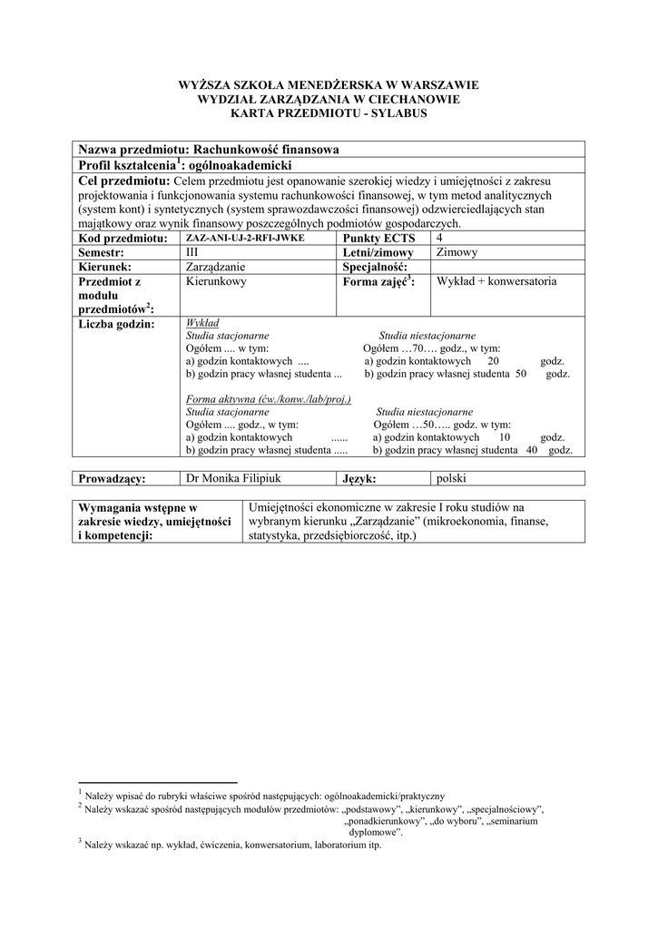 WYŻSZA SZKOŁA MENEDŻERSKA W WARSZAWIE WYDZIAŁ ZARZĄDZANIA W CIECHANOWIE KARTA PRZEDMIOTU - SYLABUS Nazwa przedmiotu: Rachunkowość finansowa Profil kształcenia1: ogólnoakademicki Cel przedmiotu: Celem przedmiotu jest opanowanie szerokiej wiedzy i umiejętności z zakresu projektowania i funkcjonowania systemu rachunkowości finansowej, w tym metod analitycznych (system kont) i syntetycznych (system sprawozdawczości finansowej) odzwierciedlających stan majątkowy oraz wynik finansowy poszczególnych podmiotów gospodarczych. 4 Kod przedmiotu: ZAZ-ANI-UJ-2-RFI-JWKE Punkty ECTS III Zimowy Semestr: Letni/zimowy Zarządzanie Kierunek: Specjalność: Kierunkowy Wykład + konwersatoria Przedmiot z Forma zajęć3: modułu przedmiotów2: Wykład Liczba godzin: Studia stacjonarne Ogółem .... w tym: a) godzin kontaktowych .... b) godzin pracy własnej studenta ... Studia niestacjonarne Ogółem …70…. godz., w tym: a) godzin kontaktowych 20 b) godzin pracy własnej studenta 50 Forma aktywna (ćw./konw./lab/proj.) Studia stacjonarne Ogółem .... godz., w tym: a) godzin kontaktowych ...... b) godzin pracy własnej studenta ..... Prowadzący: Dr Monika Filipiuk Wymagania wstępne w zakresie wiedzy, umiejętności i kompetencji: 1 godz. godz. Studia niestacjonarne Ogółem …50….. godz. w tym: a) godzin kontaktowych 10 godz. b) godzin pracy własnej studenta 40 godz. Język: polski Umiejętności ekonomiczne w zakresie I roku studiów na wybranym kierunku „Zarządzanie” (mikroekonomia, finanse, statystyka, przedsiębiorczość, itp.) Należy wpisać do rubryki właściwe spośród następujących: ogólnoakademicki/praktyczny Należy wskazać spośród następujących modułów przedmiotów: „podstawowy”, „kierunkowy”, „specjalnościowy”, „ponadkierunkowy”, „do wyboru”, „seminarium dyplomowe”. 3 Należy wskazać np. wykład, ćwiczenia, konwersatorium, laboratorium itp. 2 Lp. 1. 2. 3. 4. 5. 6. Narzędzia dydaktyczne Właściwe zaznaczyć znakiem „x” Praca z literaturą Wykłady zakładające hipotetyczno-dedukcyjne myślenie słuchaczy Ćwiczenia aktywizujące Metody problemowe Praktyczne i aktywizujące metody projektów realizowanych na podstawie założeń podanych przez prowadzącego Inne (proszę doprecyzować) Prezentacja i analiza rozwiązywanych zadań, praca w grupach Praktyczne sporządzenie sprawozdania finansowego na przykładzie małej firmy stworzonej pod potrzeby zrealizowania zadania.( od bilansu otwarcia przez dokonanie operacji wskazanych przez wykładowcę do bilansu zamknięcia z wykorzystanie porównania sald na kontach syntetycznych z wykorzystaniem kont wynikowych i analitycznych) X X X X X Treści programowe Lp. Liczba godzin przeznaczona na realizację obszaru tematycznego 1 1. Pojęcie i zadania rachunkowości. 2. Środki gospodarcze i źródła ich pochodzenia. 1 3. Bilans, pojęcia: aktywa, pasywa. 1 4. Operacje gospodarcze i ich wpływ na bilans. 1 5. Dokumentacja operacji finansowych. 1 6. 1 8. Bilans, rachunek zysków i strat, sprawozdanie z przepływów środków pieniężnych. Konto i jego rola w ewidencji. Dzielenie pionowe i poziome kont. Łączenie kont. Obroty. Salda. Księgi. 9. Poprawianie błędów księgowych. 1 10. Zestawienie obrotów i sald. 1 7. 1 1 11. Ewidencja środków pieniężnych, rozrachunków i wynagrodzeń. 2 12. Naliczanie wynagrodzeń, podatków i składek na ubezpieczenia. 2 13. Ewidencja środków trwałych oraz wartości niematerialnych i prawnych. 2 14. Amortyzacja i umorzenia. 2 15. Ewidencja zapasów. 2 16. Wycena rozchodu materiałów i towarów. 2 17. Fundusze i wynik finansowy. Rodzaje funduszy. 2 18. Wynik finansowy w rachunku zysków i strat. 2 19. Ewidencja przychodów i kosztów oraz księgowe ustalenie wyniku finansowego. 20. Wariant porównawczy i kalkulacyjny rachunku zysków i strat. Formy prowadzenia zajęć i metody oceny Student, który zaliczył przedmiot Forma zajęć Zamierzone efekty Wykład W01, W02, W03 U01, U02, U03, U04 K01, K02 Ćwiczenia Konwersatorium W01, W02, W03 U01, U02, U03, U04 K01, K02 2 2 Metody oceny Egzamin pisemny Odniesienie do kierunku K_W01 K_W13 K_W17 K_U01 K_U02 K_U03 K_U04 K_K02 K_K11 Zaliczenie K_W01 kolokwium K_W13 K_W17 K_U01 K_U02 K_U03 K_U04 K_K02 K_K11 Laboratorium Inne (należy doprecyzować) 4 Podstawowa : Uzupełniająca: Literatura przedmiotu E. Nowak Rachunkowość - Kurs podstawowy Warszawa PWE 2008 J. Olchowicz- Podstawy rachunkowości tom II-wykład tom I- zadania i rozwiązania - Difin Warszawa 2009 Podstawy rachunkowości pod redakcją K. Sawickiego PWE Warszawa 2005 M. Gmytrasiewicz, A Karmańska Rachunkowość finansowa Difin 2007 J. Matusiewicz P. Matusiewicz - Rachunkowość od Podstaw + Zbiór zadań do podręcznika Rachunkowość od Podstaw SF Warszawa 2007 Efekty kształcenia i ich odniesienie do efektów kształcenia w obszarze nauk społecznych dla kierunku Zarządzanie Efekty kształcenia dla modułu 4 OPIS KIERUNKOWYCH EFEKTÓW KSZTAŁCENIA Absolwent studiów I stopnia na kierunku Zarządzanie Odniesienie do efektów kształcenia dla obszaru nauk5 społecznych Odniesienie do efektów kształcenia dla kierunku Należy wskazać literaturę spośród księgozbioru Biblioteki WSM w Warszawie. Rozporządzenie Ministra Nauki i Szkolnictwa Wyższego z dnia 2 listopada 2011 r. w sprawie Krajowych Ram Kwalifikacji dla Szkolnictwa Wyższego (Dz. U. Nr 253, poz. 1520) określa opis efektów kształcenia dla profilu ogólnoakademickiego i praktycznego w obszarach kształcenia w zakresie: nauk humanistycznych, nauk społecznych, nauk ścisłych, nauk przyrodniczych, nauk technicznych, nauk medycznych, nauk rolniczych, leśnych i weterynaryjnych oraz sztuki. 5 W01 W02 W03 U01 U02 U03 U04 K01 K02 WIEDZA Zna standardowe metody ilościowe w tym wybrane metody standardowe gromadzenia, analizy, jakości prezentacji danych ekonomicznych w przedsiębiorstwie. Potrafi opisać znaczenie wybranych norm i standardów w poszczególnych obszarach dz