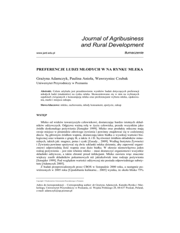 Journal of Agribusiness and Rural Development www.jard.edu.pl tłumaczenie PREFERENCJE LUDZI MŁODYCH W NA RYNKU MLEKA Grażyna Adamczyk, Paulina Anioła, Wawrzyniec Czubak Uniwersytet Przyrodniczy w Poznaniu Abstrakt. Celem artykułu jest przedstawienie wyników badań dotyczących preferencji młodych ludzi (studentów) na rynku mleka. Skoncentrowano się w nim na wybranych aspektach związanych z konsumpcją mleka oraz preferencjami wyboru mleka, opakowania, marki i miejsca zakupu. Słowa kluczowe: mleko, zachowania, młody konsument, spożycie, zakup WSTĘP Mleko od wieków towarzyszyło człowiekowi, dostarczając bardzo istotnych składników odżywczych. Odgrywa ważną rolę w życiu człowieka, przede wszystkim jako źródło doskonałego pożywienia [Sznajder 1999]. Mleko oraz produkty mleczne mają swoje miejsce w piramidzie zdrowego żywienia i powinny znajdować się w codziennej diecie. Są głównym źródłem wapnia, dostarczają także białka o wysokiej wartości biologicznej oraz witamin z grupy B, a także A i D. Są również źródłem składników mineralnych, takich jak: magnez, potas i cynk [Zasady... 2009]. Według Instytutu Żywności i Żywienia powinno spożywać się dwie szklanki mleka dziennie, aby zapewnić organizmowi odpowiednią ilość wapnia oraz dużo białka. W okresie niemowlęctwa jeden rodzaj pożywienia – jest nim właśnie mleko – musi dostarczyć organizmowi wszystkie składniki odżywcze, a także chronić przed infekcjami. Mleko zawiera więc znacznie większy zasób składników pokarmowych niż jakiekolwiek inne rodzaje pożywienia [Sznajder 1999]. Pod względem wartości odżywczej nie posiada odpowiedniego substytutu [Adamczyk 2005]. Z badań przeprowadzonych przez CBOS w listopadzie 2000 roku, a następnie powtórzonych w 2005 roku [Upodobania kulinarne... 2005] wynika, że około blisko 75% Copyright © Wydawnictwo Uniwersytetu Przyrodniczego w Poznaniu Adres do korespondencji – Corresponding author: dr Grażyna Adamczyk, Katedra Rynku i Marketingu, Uniwersytet Przyrodniczy w Poznaniu, ul. Wojska Polskiego 28, 60-637 Poznań, Poland, e-mail: [email protected] 2 G. Adamczyk, P. Anioła, W. Czubak ankietowanych Polaków deklaruje, iż odżywia się zdrowo lub nawet bardzo zdrowo. W ciągu pięciu lat przekonanie to nie zmieniło się znacząco. Tymczasem w ostatnich latach konsumpcja mleka w Polsce gwałtowanie się zmniejsza. Jeszcze w 1990 roku spożycie mleka per capita w Polsce wynosiło 242 l mleka (mleko i przetwory w ekwiwalencie surowca, bez mleka przetworzonego na masło), podczas gdy w latach 2006-2008 odpowiednio już tylko 176 l i 185 l [Rynek mleka... 2008]. Ponadto, na rynku mleka można zauważyć tendencję zmian preferencji konsumentów w kierunku produktów o większym stopniu przetworzenia i atrakcyjności dla konsumenta, takich jak: jogurty, kefiry czy sery (tzw. produkty added value) [Łaba 2007]. Zwiększająca się konkurencja na rynku produktów mleczarskich przyczynia się do wprowadzania coraz to nowszej oferty asortymentowej i walki o konsumenta. Obecnie mleko dostępne jest pod wieloma postaciami, w różnych opakowaniach i o różnych właściwościach. Zmiany te zachodzą stopniowo od 1989 roku. Przedtem – w okresie gospodarki centralnie planowanej – to klient miał dostosować swoje potrzeby i wymagania do tego, co było odgórnie narzucone – albo w postaci systemu kartkowego, albo dostępności towarów [Sznajder i in. 1998]. Po roku 1989 nastąpił zwrot od konsumenta pozbawionego wyboru, do konsumenta podejmującego świadome decyzje [Sznajder 1999]. Zacięta walka o konsumenta sprawia, że ważne staje się poznanie jego preferencji, motywów postępowania, kryteriów podejmowania decyzji. Celem tego opracowania jest pokazanie popularności konsumpcji mleka oraz zbadanie preferencji studentów, dotyczących spożycia i zakupu mleka. MATERIAŁ I METODA Materiał do opracowania stanowią dane pierwotne pochodzące z badań ankietowych, przeprowadzonych metodą audytoryjną w grudniu 2008 roku wśród studentów Wydziału Ekonomiczno-Społecznego Uniwersytetu Przyrodniczego w Poznaniu. Próba, w której wzięło udział 180 studentów została dobrana w sposób kwotowy, gdzie głównym kryterium doboru był rok studiów. Strukturę wyznaczonej próby przedstawiono w tabeli 1. Tabela 1. Dobór próby do badań ankietowych Rok studiów Liczba studentów na Wydziale Ekonomiczno-Społecznym Udział w populacji Liczebność próby I 587 38% 68 II 245 16% 28 III 221 14% 26 IV 237 15% 27 V 267 17% 31 1 557 100% 180 Razem Źródło: opracowanie własne. Journal of Agribusiness and Rural Development Preferencje ludzi młodych w na rynku mleka 3 Badania przeprowadzono wśród grupy studentów, ponieważ z jednej strony są to ludzie młodzi, a więc od ich preferencji i nawyków zakupowych w szczególności zależeć będą przyszłe kierunki przemysłu mleczarskiego, z drugiej strony – studia to taki okres w życiu, gdzie część młodych ludzi zaczyna się usamodzielniać (wśród badanej próby ponad połowa respondentów mieszkała w trakcie studiów poza domem rodzinnym, prawie 1/4 pracowała), a więc i podejmować samodzielne decyzje dotyczące zarówno wyboru produktów, miejsca i sposobu w ich zaopatrzenie, jak i rozdysponowania środków finansowych. W badaniu uczestniczyło 72% kobiet i 28% mężczyzn. 37% respondentów pochodziło ze wsi, 36% – z miast do 100 tys. mieszkańców, a 28% – z miast powyżej 100 tys. mieszkańców. Prawie połowa badanych studentów w czasie studiów zamieszkiwała dom rodzinny, 1/5 mieszkała w akademiku, 13% – w mieszkaniu studenckim, 11% – na stancji lub w kwaterze prywatnej, a 9% respondentów posiadało własne mieszkanie. Zebrane dane zanalizowano wykorzystując wybrane mierniki jednowymiarowej analizy danych – wskaźniki struktury i miary położenia. Spożycie mleka Mimo spadkowego trendu w spożyciu mleka w ostatnich latach, a także rosnąc