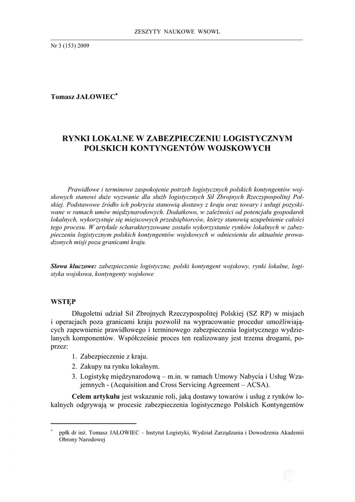 ZESZYTY NAUKOWE WSOWL Nr 3 (153) 2009 ISSN 1731-8157 Tomasz JAŁOWIEC RYNKI LOKALNE W ZABEZPIECZENIU LOGISTYCZNYM POLSKICH KONTYNGENTÓW WOJSKOWYCH Prawidłowe i terminowe zaspokojenie potrzeb logistycznych polskich kontyngentów wojskowych stanowi duże wyzwanie dla służb logistycznych Sił Zbrojnych Rzeczypospolitej Polskiej. Podstawowe źródło ich pokrycia stanowią dostawy z kraju oraz towary i usługi pozyskiwane w ramach umów międzynarodowych. Dodatkowo, w zależności od potencjału gospodarek lokalnych, wykorzystuje się miejscowych przedsiębiorców, którzy stanowią uzupełnienie całości tego procesu. W artykule scharakteryzowane zostało wykorzystanie rynków lokalnych w zabezpieczeniu logistycznym polskich kontyngentów wojskowych w odniesieniu do aktualnie prowadzonych misji poza granicami kraju. Słowa kluczowe: zabezpieczenie logistyczne, polski kontyngent wojskowy, rynki lokalne, logistyka wojskowa, kontyngenty wojskowe WSTĘP Celem artykułu jest wskazanie roli, jaką dostawy towarów i usług z rynków lokalnych odgrywają w procesie zabezpieczenia logistycznego Polskich Kontyngentów - - Długoletni udział Sił Zbrojnych Rzeczypospolitej Polskiej (SZ RP) w misjach i operacjach poza granicami kraju pozwolił na wypracowanie procedur umożliwiających zapewnienie prawidłowego i terminowego zabezpieczenia logistycznego wydzielanych komponentów. Współcześnie proces ten realizowany jest trzema drogami, poprzez: 1. Zabezpieczenie z kraju. 2. Zakupy na rynku lokalnym. 3. Logistykę międzynarodową – m.in. w ramach Umowy Nabycia i Usług Wzajemnych - (Acquisition and Cross Servicing Agreement – ACSA). - - - ppłk dr inż. Tomasz JAŁOWIEC – Instytut Logistyki, Wydział Zarządzania i Dowodzenia Akademii Obrony Narodowej RYNKI LOKALNE W ZABEZPIECZENIU LOGISTYCZNYM POLSKICH… Wojskowych (PKW) oraz analiza struktury pozyskiwanych tą drogą produktów i usług w odniesieniu do poszczególnych misji SZ RP prowadzonych poza granicami kraju. 1. TEORETYCZNE ASPEKTY UŻYCIA GOSPODARCZEGO POTENCJAŁU LOKALNEGO W ZABEZPIECZENIU LOGISTYCZNYM PKW Wojskowe strategie i doktryny współczesnych armii podkreślają wzrastającą zależność sił zbrojnych i ich wsparcia logistycznego od dostawców cywilnych. Ograniczony budżet wojskowy jest zasadniczą determinantą poszukiwania takich rozwiązań (w tym logistycznych), które gwarantują nie tylko skuteczność działania, ale i ograniczenia kosztów1. Siły zbrojne państw zrzeszonych w NATO, drogą indywidualnego zawierania umów, stosują szeroką kontraktację cywilno-wojskową, zapewniającą wojskom zaopatrzenie i usługi w zakresie zabezpieczenia logistycznego. Taki sposób realizacji zadań logistycznych na rzecz armii, nazywany „trzecią drogą”, polega na wykorzystywaniu przez wojska cywilnych zasobów logistycznych, zgodnie z doraźnie lub zawczasu ustalonymi umowami kontraktacyjnymi. Należy zaznaczyć, że zgodnie z przyjętą w NATO terminologią, „pierwsza droga” to wykorzystywanie wojskowych zasobów logistycznych, „druga droga” to wsparcie przez państwo-gospodarza – HNS (Host Nation Support). Kontrakty zawierane z zewnętrznymi podmiotami cywilnymi uznawane są jako zwiększenie potencjału logistycznego wojsk, pozwalające im jednocześnie na zachowanie własnych zasobów logistycznych. Mają one szczególną wartość podczas wykonywania priorytetowych zadań jako uzupełnienie braków lub zniesienie ograniczeń w określonych asortymentach zaopatrzenia lub zakresach usług specjalistycznych. Współcześnie pododdziały Wojska Polskiego uczestniczą w szeregu operacji Organizacji Narodów Zjednoczonych (ONZ), Unii Europejskiej (UE) oraz Paktu Północnoatlantyckiego (NATO). Na rys. 1. przedstawiono aktualne zaangażowanie SZ RP w operacjach poza granicami kraju. UNIFIL EUFOR UNDOF GRUZJA I S AF K F OR CZAD - Rys. 1. Zaangażowanie SZ RP w operacjach poza granicami kraju (stan na październik 2009 r.) - Źródło: Materiały Dowództwa Operacyjnego SZ RP - - - 1 S. Smyk, Rola zewnętrznych oferentów usług logistycznych (outsourcingu) w logistyce wojskowej, Warszawa 2007, s. 69. 159 Tomasz JAŁOWIEC Łącznie poza granicami kraju służy obecnie (10.2009 r.) około 3500 żołnierzy SZ RP. Prawidłowa realizacja zadań mandatowych oraz operacyjnych nie jest możliwa bez odpowiedniego i terminowego pokrycia potrzeb PKW w zakresie dostaw towarów i usług. Podstawowym źródłem ich zabezpieczenia jest przerzut środków materiałowych z kraju oraz pomoc sojusznicza uzyskiwana między innymi w ramach Umowy ACSA. Uzupełnieniem pozyskiwanych tymi drogami materiałów i usług jest zakup dóbr na rynkach lokalnych, uzależniony w głównej mierze od potencjału i możliwości ewentualnych miejscowych kontrahentów. Zgodnie z obowiązującymi przepisami podstawę dokonania zakupu na rynku lokalnym stanowi „PLAN RZECZOWO-FINANSOWY PKW” oraz „PLAN ZAMÓWIEŃ PUBLICZNYCH PKW”, opracowane na podstawie propozycji „ROCZNEGO PLANU ZAKUPÓW NA RYNKU LOKALNYM” przygotowanego przez Dowódcę Narodowego Elementu Wsparcia PKW (National Support Element – NSE) w terminie nakazanym przez właściwego dysponenta III stopnia lub wyższego na rok następny2. Przygotowane przez NSE propozycje na druku przedstawionym na rysunku 2, w rozbiciu na poszczególne działy zaopatrzenia, są przesyłane do właściwego dowódcy Oddziału Gospodarczego (OG), który po weryfikacji i akceptacji przez szefów służb, szefa logistyki, szefa sztabu ujmuje je w planie rzeczowo-finansowym. Rys. 2. Wzór rocznego planu zakupów środków materiałowych i usług PKW na rynku lokalnym Źródło: Zasady prowadzenia gospodarki…, op. cit., s. 95 - Zakupy na rynkach lokalnych podlegają procedurom zamówień publicznych, takim jak na terytorium Polski3. Obligują one między innymi Dowódcę NSE do sporzą- - 2 - - - 3 Zasady prowadzenia gospodarki materiałowej i finansowej w Polskich Kontyngentach Wojskowych rea