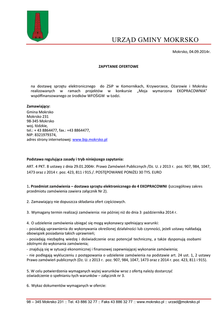 URZĄD GMINY MOKRSKO Mokrsko, 04.09.2014r. ZAPYTANIE OFERTOWE na dostawę sprzętu elektronicznego do ZSiP w Komornikach, Krzyworzece, Ożarowie i Mokrsku realizowanych w ramach projektów w konkursie „Moja wymarzona EKOPRACOWNIA” współfinansowanego ze środków WFOŚiGW w Łodzi. Zamawiający: Gmina Mokrsko Mokrsko 231 98-345 Mokrsko woj. łódzkie, tel.: + 43 8864477, fax.: +43 8864477, NIP: 8321979374, adres strony internetowej: www.bip.mokrsko.pl Podstawa regulująca zasady i tryb niniejszego zapytania: ART. 4 PKT. 8 ustawy z dnia 29.01.2004r. Prawo Zamówień Publicznych /Dz. U. z 2013 r. poz. 907, 984, 1047, 1473 oraz z 2014 r. poz. 423, 811 i 915./. POSTĘPOWANIE PONIŻEJ 30 TYS. EURO 1. Przedmiot zamówienia – dostawa sprzętu elektronicznego do 4 EKOPRACOWNI (szczegółowy zakres przedmiotu zamówienia zawiera załącznik Nr 2). 2. Zamawiający nie dopuszcza składania ofert częściowych. 3. Wymagany termin realizacji zamówienia: nie później niż do dnia 3 października 2014 r. 4. O udzielenie zamówienia ubiegać się mogą wykonawcy spełniający warunki: - posiadają uprawnienia do wykonywania określonej działalności lub czynności, jeżeli ustawy nakładają obowiązek posiadania takich uprawnień; - posiadają niezbędną wiedzę i doświadczenie oraz potencjał techniczny, a także dysponują osobami zdolnymi do wykonania zamówienia; - znajdują się w sytuacji ekonomicznej i finansowej zapewniającej wykonanie zamówienia; - nie podlegają wykluczeniu z postępowania o udzielenie zamówienia na podstawie art. 24 ust. 1, 2 ustawy Prawo zamówień publicznych (Dz. U. z 2013 r. poz. 907, 984, 1047, 1473 oraz z 2014 r. poz. 423, 811 i 915). 5. W celu potwierdzenia wymaganych wyżej warunków wraz z ofertą należy dostarczyć oświadczenie o spełnianiu tych warunków – załącznik nr 3. 6. Wykaz dokumentów wymaganych w ofercie: 98 – 345 Mokrsko 231 :: Tel. 43 886 32 77 :: Faks 43 886 32 77 :: www.mokrsko.pl :: [email protected] URZĄD GMINY MOKRSKO 1) formularz ofertowy – załącznik nr 1; 2) szczegółowy zakres przedmiotu zamówienia – załącznik nr 2; 3) oświadczenie, o którym mowa w punkcie 5 – załącznik nr 3; 7. Oferta wraz z załącznikami winna być napisana w języku polskim, trwałą i czytelną techniką, wypełniona i parafowana w całości oraz podpisana przez osobę upoważnioną do reprezentowania firmy. 8. Wykonawca poniesie wszelkie koszty związane z przygotowaniem i złożeniem oferty. Zamawiający nie przewiduje zwrotu kosztów udziału w postępowaniu poniesionych przez wykonawcę. 9. Przy wyborze oferty Zamawiający będzie kierował się kryterium najniższej ceny. 10. Okres związania ofertą wynosi 30 dni od daty złożenia oferty. 11. Wykonawca złoży ofertę w zaklejonej kopercie skierowanej na adres Zamawiającego wraz z oznaczeniem „Oferta na – dostawę sprzętu elektronicznego do 4 EKOPRACOWNI” 12. Termin składania ofert upływa dnia 9 września 2014 r. o godz. 12.00, oferty należy składać w sekretariacie Urzędu Gminy Mokrsko. 13. Otwarcie ofert nastąpi w dniu 9 września 2014 r. o godz. 12.15 w Sali konferencyjnej Urzędu Gminy Mokrsko. 14. Zamawiający udzieli zamówienia Wykonawcy, którego oferta odpowiada zasadom określonym w niniejszym zapytaniu oraz zostanie uznana za najkorzystniejszą. 15. Zamawiający zastrzega sobie prawo do podjęcia decyzji w sprawie zamknięcia postępowania przed upływem terminu składania ofert lub unieważnienia postępowania po tym terminie. 16. Zamawiający powiadomi wszystkich Wykonawców o wyniku postępowania poprzez stronę internetową. W zawiadomieniu wysłanym do Wykonawcy, którego oferta została wybrana Zamawiający określi termin i miejsce zawarcia umowy Wójt Gminy Mokrsko Tomasz Kącki 98 – 345 Mokrsko 231 :: Tel. 43 886 32 77 :: Faks 43 886 32 77 :: www.mokrsko.pl :: [email protected] Załącznik nr 1 ......................................, dn .............................. ............................................................... ................................................................ (nazwa i adres Wykonawcy) FORMULARZ OFERTOWY 1. Stosownie do warunków określonych w Zakresie Przedmiotu Zamówienia Firma nasza oferuje realizację zadania za poniższą cenę: Cena brutto ………………………. zł (słownie:…………………………………………………………………………………….) Zaproponowana cena wynika ze szczegółowej kalkulacji dokonanej w Tabeli 1. Tabela 1. Kalkulacja kosztów zamówienia Lp. Nazwa pozycji Ilość Cena brutto szt. 1 1 2 3 4 5 2 Tablica interaktywna z oprogramowaniem 3 4 projektor krótkoogniskowy z uchwytem 4 Głośniki Notebook z oprogramowaniem biurowym aparat fotograficzny 4 4 1 1 Razem 1. Termin realizacji zamówienia: do 3 października 2014 . 2. Wyrażam zgodę na warunki płatności określone w zapytaniu ofertowym. 3. Oświadczam, że zapoznałem się z opisem przedmiotu zamówienia i nie wnoszę do niego zastrzeżeń. 4. Oświadczam, że spełniam warunki określone przez Zamawiającego. Załącznikami do niniejszego formularza oferty stanowiącego integralną część oferty są: a. zakres przedmiotu zamówienia – załącznik nr 2 b. oświadczenie o spełnianiu warunków udziału w zamówieniu – załącznik nr 3 c. projekt umowy dostaw – załącznik nr 4 ..................................., dn .............................. ........................................................... pieczątka i podpis osoby uprawnionej Załącznik nr 2 ZAKRES PRZEDMIOTU ZAMÓWIENIA Informacje ogólne 1. Przedmiotem zamówienia jest dostawa sprzętu elektronicznego do 4 EKOPRACOWNI 2. Szczegółowe warunki dotyczące przedmiotu zamówienia 1. Zamówienie obejmuje zakup, dostawę i montaż: a) Laptop z oprogramowaniem – 1 szt. spełniający niniejsze wymogi minimum: Parametry Lp. Wymagane minimalne parametry techniczne notebooka 1. Typ Komputer przenośny (tzw. laptop, noteboo