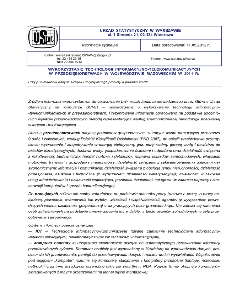 URZĄD STATYSTYCZNY W WARSZAWIE ul. 1 Sierpnia 21, 02-134 Warszawa Data opracowania: 17.05.2012 r. Informacja sygnalna Kontakt: e-mail:[email protected] tel. 22 464 23 15 faks 22 846 76 67 Internet: www.stat.gov.pl/warsz WYKORZYSTANIE TECHNOLOGII INFORMACYJNO-TELEKOMUNIKACYJNYCH W PRZEDSIĘBIORSTWACH W WOJEWÓDZTWIE MAZOWIECKIM W 2011 R. Przy publikowaniu danych Urzędu Statystycznego prosimy o podanie źródła. Źródłem informacji wykorzystanych do opracowania były wyniki badania prowadzonego przez Główny Urząd Statystyczny na formularzu SSI-01 – sprawozdanie o wykorzystaniu technologii informacyjno- -telekomunikacyjnych w przedsiębiorstwach. Prezentowane informacje opracowano na podstawie uogólnionych wyników przeprowadzonych metodą reprezentacyjną według zharmonizowanej metodologii stosowanej w krajach Unii Europejskiej. Dane o przedsiębiorstwach dotyczą podmiotów gospodarczych, w których liczba pracujących przekracza 9 osób i zaliczanych, według Polskiej Klasyfikacji Działalności (PKD 2007), do sekcji: przetwórstwo przemysłowe; wytwarzanie i zaopatrywanie w energię elektryczną, gaz, parę wodną, gorącą wodę i powietrze do układów klimatyzacyjnych; dostawa wody, gospodarowanie ściekami i odpadami oraz działalność związana z rekultywacją; budownictwo; handel hurtowy i detaliczny, naprawa pojazdów samochodowych, włączając motocykle; transport i gospodarka magazynowa; działalność związana z zakwaterowaniem i usługami gastronomicznymi; informacja i komunikacja; działalność związana z obsługą rynku nieruchomości; działalność profesjonalna, naukowa i techniczna (z wyłączeniem działalności weterynaryjnej); działalność w zakresie usług administrowania i działalność wspierająca; pozostała działalność usługowa (w zakresie naprawy i konserwacji komputerów i sprzętu komunikacyjnego). Do pracujących zalicza się osoby zatrudnione na podstawie stosunku pracy (umowa o pracę, o pracę nakładczą, powołanie, mianowanie lub wybór), właścicieli i współwłaścicieli, agentów (z wyłączeniem prowadzących własną działalność gospodarczą) oraz pracujących poza granicami kraju. Nie zalicza się natomiast osób zatrudnionych na podstawie umowy-zlecenia lub o dzieło, a także uczniów zatrudnionych w celu przygotowania zawodowego. Użyte w informacji pojęcia oznaczają: — ICT – Technologie Informacyjno-Komunikacyjne (zwane zamiennie technologiami informacyjno-telekomunikacyjnymi, teleinformatycznymi lub technikami informacyjnymi); — komputer osobisty to urządzenie elektroniczne służące do automatycznego przetwarzania informacji przedstawionych cyfrowo. Komputer osobisty jest wyposażony w klawiaturę do wprowadzania danych, procesor do ich przetwarzania, pamięć do przechowywania danych i monitor do ich wyświetlania. Współcześnie pod pojęciem „komputer” rozumie się komputery stacjonarne i komputery przenośne (laptopy, notebooki, netbooki) oraz inne urządzenia przenośne takie jak smartfony, PDA. Pojęcie to nie obejmuje komputerów zintegrowanych z innymi urządzeniami na jednej płycie montażowej; — Internet to ogólnoświatowa sieć komputerowa, będąca zbiorem milionów sieci lokalnych i pojedynczych komputerów z całego świata, oparta na protokole komunikacyjnym TCP/IP. W ramach sieci Internet dostępne są usługi, takie jak: WWW, poczta elektroniczna; — szerokopasmowy dostęp do Internetu jest to rodzaj połączenia, które cechuje się dużą szybkością przepływu informacji mierzoną w setkach kb/s (kilobitów na sekundę) lub w Mb/s (megabitach na sekundę). Dostęp szerokopasmowy umożliwiają technologie z rodziny xDSL (ADSL, SDSL itp.), sieci telewizji kablowej (modem kablowy), łącza satelitarne, połączenia bezprzewodowe przez modem 3G lub 3G handset w technologii UMTS, CDMA2000-1xEVDO, HSDPA; — DSL – rodzina technologii umożliwiających szerokopasmowe połączenie z Internetem przy użyciu miedzianego kabla telefonicznego; — 3G (trzecia generacja) – sieć cyfrowa telefonii komórkowej o poszerzonej pojemności dysponująca dodatkowymi usługami umożliwiającymi transmisję wideo i transmisję pakietową; 3G handset – jest to urządzenie umożliwiające wykonania takich czynności przez telefon; — strona internetowa (WWW) – zbiór dokumentów (zawierających zwykle oprócz tekstu także grafikę, animacje itp.) w Internecie dotyczący określonej tematyki, obejmujący dokument początkowy, zwany stroną główną, i zazwyczaj powiązane z nim dalsze dokumenty – kolejne strony i odsyłacze (hiperłącza) do innych stron. Strony internetowe są zapisane w języku HTML, odczytywanym przez programy zwane przeglądarkami internetowymi, np. Internet Explorer; — open source – oprogramowanie, którego kod źródłowy jest powszechnie dostępny. Z punktu widzenia przedsiębiorstwa oprogramowanie takie może być swobodnie uruchamiane, kopiowane i rozpowszechniane bez konieczności ponoszenia kosztów za prawa autorskie; — CRM – system służący do zarządzania informacjami o klientach pozwalający na zbieranie, przechowywanie i analizowanie informacji; — ERP – Planowanie Zasobów Przedsiębiorstwa to system informatyczny składający się z aplikacji integrujących informacje i działania danego przedsiębiorstwa na wszystkich szczeblach i w większości obszarów zarządzania. Typowe systemy ERP łączą ze sobą planowanie, zaopatrywanie, sprzedaż, marketing, relacje z klientami, finanse i zarządzanie personelem, i pozwalają na optymalne wykorzystanie zasobów oraz uporządkowanie zachodzących w przedsiębiorstwie procesów. Systemy te oparte są na jednej – wspólnej dla całego systemu – bazie danych. Dzięki temu dane wprowadzane raz są widoczne we wszystkich modułach. Niezwykle ważną cechą systemów ERP jest ich elastyczność i możliwość dopasowania do specyfiki danego przedsiębiorstwa; — automatyczna wymiana danych mi