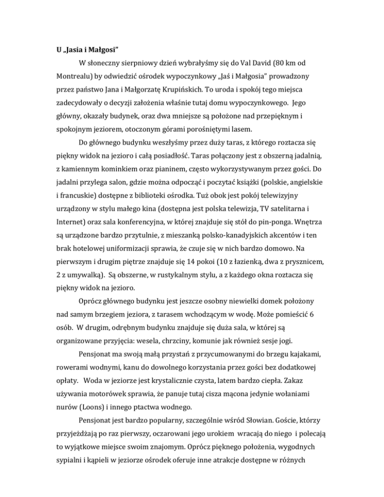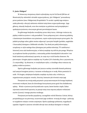 U „Jasia i Małgosi” W słoneczny sierpniowy dzień wybrałyśmy się do Val David (80 km od Montrealu) by odwiedzić ośrodek wypoczynkowy „Jaś i Małgosia” prowadzony przez państwo Jana i Małgorzatę Krupińskich. To uroda i spokój tego miejsca zadecydowały o decyzji założenia właśnie tutaj domu wypoczynkowego. Jego główny, okazały budynek, oraz dwa mniejsze są położone nad przepięknym i spokojnym jeziorem, otoczonym górami porośniętymi lasem. Do głównego budynku weszłyśmy przez duży taras, z którego roztacza się piękny widok na jezioro i całą posiadłość. Taras połączony jest z obszerną jadalnią, z kamiennym kominkiem oraz pianinem, często wykorzystywanym przez gości. Do jadalni przylega salon, gdzie można odpocząć i poczytać książki (polskie, angielskie i francuskie) dostępne z biblioteki ośrodka. Tuż obok jest pokój telewizyjny urządzony w stylu małego kina (dostępna jest polska telewizja, TV satelitarna i Internet) oraz sala konferencyjna, w której znajduje się stół do pin-ponga. Wnętrza są urządzone bardzo przytulnie, z mieszanką polsko-kanadyjskich akcentów i ten brak hotelowej uniformizacji sprawia, że czuje się w nich bardzo domowo. Na pierwszym i drugim piętrze znajduje się 14 pokoi (10 z łazienką, dwa z prysznicem, 2 z umywalką). Są obszerne, w rustykalnym stylu, a z każdego okna roztacza się piękny widok na jezioro. Oprócz głównego budynku jest jeszcze osobny niewielki domek położony nad samym brzegiem jeziora, z tarasem wchodzącym w wodę. Może pomieścić 6 osób. W drugim, odrębnym budynku znajduje się duża sala, w której są organizowane przyjęcia: wesela, chrzciny, komunie jak również sesje jogi. Pensjonat ma swoją małą przystań z przycumowanymi do brzegu kajakami, rowerami wodnymi, kanu do dowolnego korzystania przez gości bez dodatkowej opłaty. Woda w jeziorze jest krystalicznie czysta, latem bardzo ciepła. Zakaz używania motorówek sprawia, że panuje tutaj cisza mącona jedynie wołaniami nurów (Loons) i innego ptactwa wodnego. Pensjonat jest bardzo popularny, szczególnie wśród Słowian. Goście, którzy przyjeżdżają po raz pierwszy, oczarowani jego urokiem wracają do niego i polecają to wyjątkowe miejsce swoim znajomym. Oprócz pięknego położenia, wygodnych sypialni i kąpieli w jeziorze ośrodek oferuje inne atrakcje dostępne w różnych porach roku. Zimą można pokonywać jedną z najdłuższych tras na nartach biegowych, która przebiega tuż koło pensjonatu, uczestniczyć w kuligach, spędzić „szampańskiego” Sylwestra. W inne pory roku oprócz sportów wodnych można wędrować szlakami leśnymi i górskimi, zbierać grzyby ( prawdziwki, kozaki, rydze, maślaki) – jest ich bardzo dużo, łowić ryby – (wiosną są pstrągi!), piec kiełbaski przy ognisku czy na grillu oraz korzystać z licznych atrakcji ślicznego miasteczka Val David, do których oprócz restauracji, kawiarni, sklepów z pamiątkami, galerii można również zaliczyć coroczną wystawę ceramiki, największą w Ameryce Północnej. Spędziłyśmy zaledwie jeden dzień w tym ustroniu. Poznałyśmy gościnnych właścicieli, którzy opowiedzieli nam historię ośrodka. Trudne początki powoli odchodzą w zapomnienie, a zaprowadzane w nim zmiany, plany odnowienia i przebudowy, powodują, że pensjonat z roku na rok staje się bardziej popularny. Ciepła, domowa atmosfera nie jest wyłącznie spowodowana urokliwym otoczeniem, czy domową, smaczną kuchnią – którą miałyśmy okazję wypróbować (podano nam zupę pomidorową o smaku, który pamiętamy z dzieciństwa i pyszne pierogi), ale również gościnnością gospodarzy oraz rodzajem ludzi odwiedzających to miejsce miłośników przyrody i dobrego towarzystwa, z którym tak łatwo nawiązać kontakt siedząc w wygodnych fotelach na tarasie. Doświadczyłyśmy tego od pierwszej chwili, poznając gości z Polski oraz Kanadyjczyków – Ukrainkę Tanię i Rosjanina – Rusłana. Rusłana nie trzeba było długo prosić, aby uderzył w struny gitary i zanucił piosenki Okudżawy. Łatwo mogłyśmy uwierzyć słowom właścicieli, że kto przyjedzie do „Jasia i Małgosi” zawsze wraca w to miejsce, gdzie łatwo nie tylko o nawiązanie przyjaźni, ale i o spotkanie miłości życia - skojarzyło ono już kilka par. I my żegnając to miejsce postanowiłyśmy wkrótce do niego powrócić, tym razem w większym gronie przyjaciół i znajomych. Beata Gołembiowska – www.beatagolembiowska.studiobim.ca Bogusława Milewska Dodatkowe informacje na stronie pensjonatu – aubergeparkerslodge.com