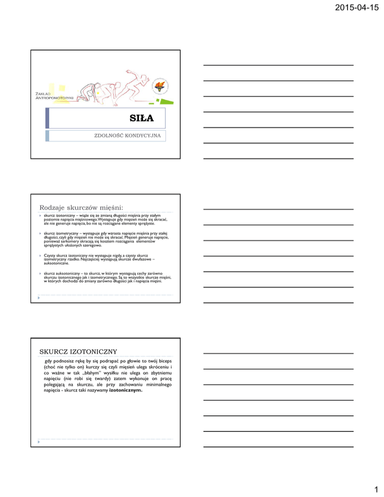 2015-04-15 SIŁA ZDOLNOŚĆ KONDYCYJNA Rodzaje skurczów mięśni: skurcz izotoniczny – wiąże się ze zmianą długości mięśnia przy stałym poziomie napięcia mięśniowego.Występuje gdy mięsień może się skracać, ale nie generuje napięcia, bo nie są rozciągane elementy sprężyste. skurcz izometryczny – występuje gdy wzrasta napięcie mięśnia przy stałej długości, czyli gdy mięsień nie może się skracać. Mięsień generuje napięcie, ponieważ sarkomery skracają się kosztem rozciągania elementów sprężystych ułożonych szeregowo. Czysty skurcz izotoniczny nie występuje nigdy, a czysty skurcz izometryczny rzadko. Najczęściej występują skurcze dwufazowe – auksotoniczne. skurcz auksotoniczny – to skurcz, w którym występują cechy zarówno skurczu izotonicznego jak i izometrycznego. Są to wszystkie skurcze mięśni, w których dochodzi do zmiany zarówno długości jak i napięcia mięśni. SKURCZ IZOTONICZNY gdy podnosisz rękę by się podrapać po głowie to twój biceps (choć nie tylko on) kurczy się czyli mięsień ulega skróceniu i co ważne w tak „błahym” wysiłku nie ulega on zbytniemu napięciu (nie robi się twardy) zatem wykonuje on pracę polegającą na skurczu, ale przy zachowaniu minimalnego napięcia - skurcz taki nazywamy izotonicznym. 1 2015-04-15 SKURCZ IZOTONICZNY : Praca ekscentryczna Siły oporu (zewnętrzne) są większe niż siła mięśnia. Jest to praca ustępująca. Przyczepy mięśnia oddalają się od siebie. Mięsień ulega rozciąganiu podczas przeciwstawianiu się sile grawitacji. Praca koncentryczna Siła mięśnia jest większa od przeciwstawiających mu się sił zewnętrznych, mięsień wykonuje pracę pokonującą. Przyczepy mięśnia zbliżają się do siebie i następuje skrócenie mięśnia. SKURCZ KONCENTRYCZNY gdy generujesz siłę większa niż obciążenie działające na twój mięsień to napinasz go i zmniejszasz jego długość, podnosisz coś– to skurcz koncentryczny. Inaczej faza pozytywna ruchu. SKURCZ EKSCENTRYCZNY gdy natomiast zaczynasz opuszczać ciężar wówczas musisz generować siłę mniejszą niż podniesiony ciężar, mięsień ciągle jest w stałym napięciu ale tym razem zaczyna się rozciągać a dokładnie wraca do swej naturalnej długość. Taki skurcz kiedy stale napięty mięsień się rozciąga nazywamy skurczem ekscentrycznym. Inaczej faza negatywna ruchu. SKURCZ IZOMETRYCZNY gdy chcesz podnieść ciężar (np. sztangielkę), której ciężar przewyższa twoje możliwości wówczas jedyne co ci się uda to maksymalnie napiąć mięsień, lecz jego długość nie ulegnie zmianie, przyczepy pozostają na swoim miejscu, nie zajdzie ruch - taki skurcz nazywamy izometrycznym. 2 2015-04-15 SKURCZ AUKSOTONICZNY w praktyce najczęściej do czynienia mamy za skurczami auksotonicznymi. W czasie takiego skurczu początkowo mięsień zwiększa napięcie aż do momentu zrównoważenia ciężaru sztangi, a następnie dochodzi do jego skracania, do podnoszenia sztangi. Wykazuje on więc w pierwszej fazie cechy skurczu izometrycznego a w drugiej izotonicznego. DEFINICJA SIŁY Zdolność do pokonywania lub przeciwstawiania się oporowi zewnętrznemu (np. przybór, woda, przeciwnik) lub wewnętrznemu, czyli masie własnego ciała kosztem pracy mięśniowej. SIŁA STATYCZNA I DYNAMICZNA Rodzaje skurczów mięśniowych stały się podstawą podziału wysiłku fizycznego i siły na statyczną i dynamiczną. Pierwsza warunkuje wysiłki, w których przeważa praca izometryczna natomiast druga determinuje możliwości pokonywania oporu w czynnościach, w których przeważa izotoniczna komponenta. 3 2015-04-15 SIŁA STATYCZNA Siła aktywna - w trakcie pracy dąży się przede wszystkim do przeciwdziałania oporom zewnętrznym przez aktywny skurcz mięśni Siła pasywna - siły zewnętrzne działają tu w ten sposób, że mięsień może się tylko przeciwstawiać postępującemu rozciąganiu. SIŁA DYNAMICZNA podział ze względu na relacje między masą i przyspieszeniem Wolna - występuje w przypadku pokonywania maksymalnych oporów z prawie stałą szybkością 𝑎 𝐹𝑤 = 𝑃 1 + 𝑔 gdzie: P=Pmax; a ≈ 0 Szybka - przejawia się podczas pokonywania oporów nie dochodzących do wartości granicznej, z przyspieszeniem również nie dochodzącym do wartości granicznej 𝑎 𝐹𝑠 = 𝑃 1 + 𝑔 gdzie: P<Pmax; a<amax Zrywowa - występuje podczas pokonywania oporów nie osiągających krańcowych obciążeń, przy jednoczesnym, maksymalnym dla danego przypadku przyspieszeniu 𝐹𝑧 = 𝑃 1 + gdzie: P<Pmax; a≈amax 𝑎 𝑔 We wzorach poszczególne symbole oznaczają: a – przyspieszenie pokonywanego oporu (m/s2) g – przyspieszenie zmiemskie P – wielkość (masa) pokonywanego oporu (kg) F – rozwijana siła (N) SIŁA WZGLĘDNA I ABSOLUTNA Absolutna siła mięśniowa wielkość maksymalnego, możliwego jeszcze do pokonania oporu w wybranym ruchu, w którym jest zaangażowana znaczna część układu mięśniowego Siła względna wielkość siły absolutnej przypadającej na 1 kg masy ciała. 4 2015-04-15 Pomiar zdolności siłowych: Syntetyczny (np. rzut piłką lekarską) Analityczny , czyli konkretna próba dla poszczególnych partii mięśniowych – dynamometr, skok w dal z miejsca (kk. dolne), zwis na drążku (kk. górne), „brzuszki” (siła mięśni brzucha). 5