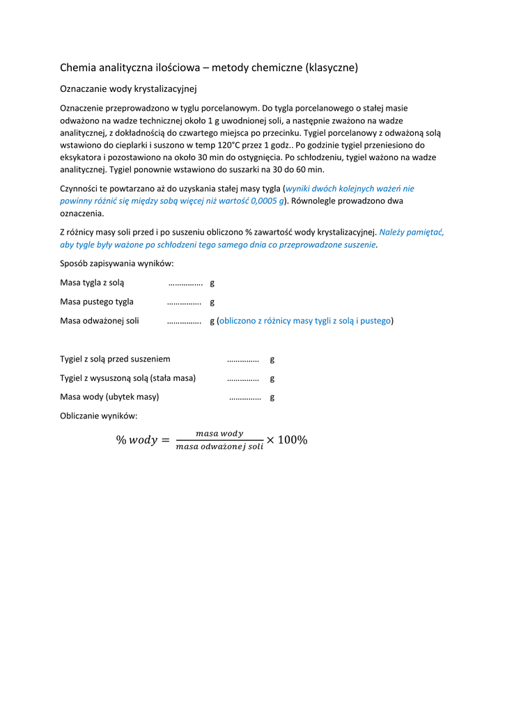 Chemia analityczna ilościowa – metody chemiczne (klasyczne) Oznaczanie wody krystalizacyjnej Oznaczenie przeprowadzono w tyglu porcelanowym. Do tygla porcelanowego o stałej masie odważono na wadze technicznej około 1 g uwodnionej soli, a następnie zważono na wadze analitycznej, z dokładnością do czwartego miejsca po przecinku. Tygiel porcelanowy z odważoną solą wstawiono do cieplarki i suszono w temp 120°C przez 1 godz.. Po godzinie tygiel przeniesiono do eksykatora i pozostawiono na około 30 min do ostygnięcia. Po schłodzeniu, tygiel ważono na wadze analitycznej. Tygiel ponownie wstawiono do suszarki na 30 do 60 min. Czynności te powtarzano aż do uzyskania stałej masy tygla (wyniki dwóch kolejnych ważeń nie powinny różnić się między sobą więcej niż wartość 0,0005 g). Równolegle prowadzono dwa oznaczenia. Z różnicy masy soli przed i po suszeniu obliczono % zawartość wody krystalizacyjnej. Należy pamiętać, aby tygle były ważone po schłodzeni tego samego dnia co przeprowadzone suszenie. Sposób zapisywania wyników: Masa tygla z solą ……………. g Masa pustego tygla ……………. g Masa odważonej soli ……………. g (obliczono z różnicy masy tygli z solą i pustego) Tygiel z solą przed suszeniem …………… g Tygiel z wysuszoną solą (stała masa) …………… g Masa wody (ubytek masy) …………… g Obliczanie wyników: % 𝑤𝑜𝑑𝑦 = 𝑚𝑎𝑠𝑎 𝑤𝑜𝑑𝑦 𝑚𝑎𝑠𝑎 𝑜𝑑𝑤𝑎ż𝑜𝑛𝑒𝑗 𝑠𝑜𝑙𝑖 × 100%