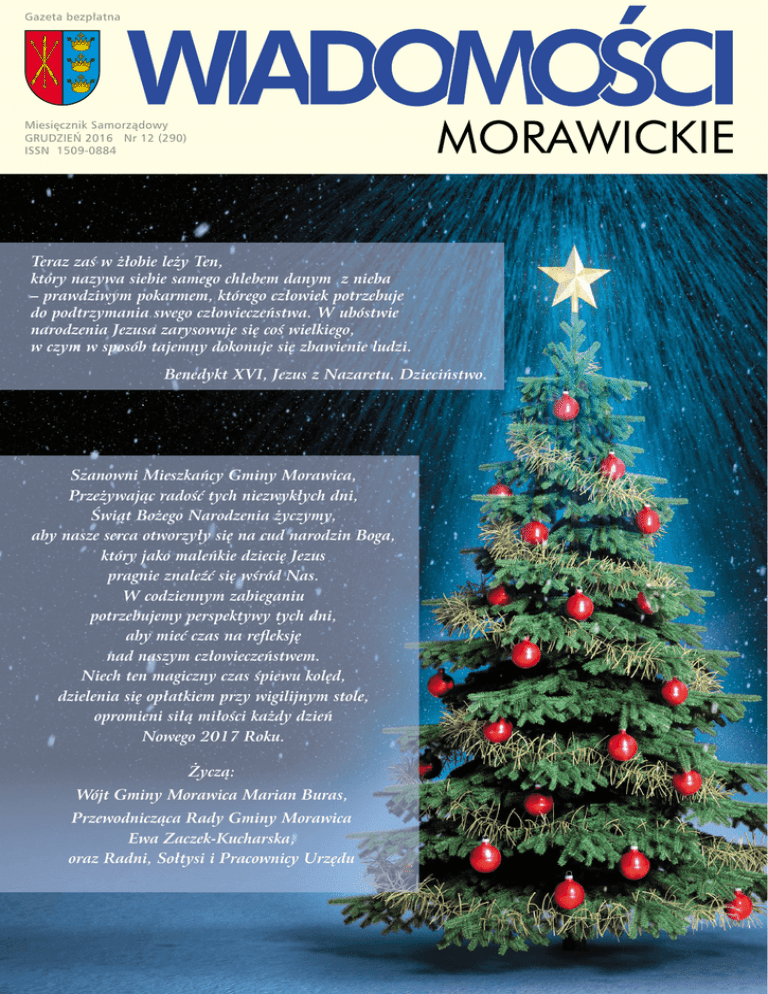 Gazeta bezpłatna Miesięcznik Samorządowy GRUDZIEŃ 2016 Nr 12 (290) ISSN 1509-0884 Teraz zaś w żłobie leży Ten, który nazywa siebie samego chlebem danym z nieba – prawdziwym pokarmem, którego człowiek potrzebuje do podtrzymania swego człowieczeństwa. W ubóstwie narodzenia Jezusa zarysowuje się coś wielkiego, w czym w sposób tajemny dokonuje się zbawienie ludzi. Benedykt XVI, Jezus z Nazaretu. Dzieciństwo. Szanowni Mieszkańcy Gminy Morawica, Przeżywając radość tych niezwykłych dni, Świąt Bożego Narodzenia życzymy, aby nasze serca otworzyły się na cud narodzin Boga, który jako maleńkie dziecię Jezus pragnie znaleźć się wśród Nas. W codziennym zabieganiu potrzebujemy perspektywy tych dni, aby mieć czas na refleksję nad naszym człowieczeństwem. Niech ten magiczny czas śpiewu kolęd, dzielenia się opłatkiem przy wigilijnym stole, opromieni siłą miłości każdy dzień Nowego 2017 Roku. Życzą: Wójt Gminy Morawica Marian Buras, Przewodnicząca Rady Gminy Morawica Ewa Zaczek-Kucharska, oraz Radni, Sołtysi i Pracownicy Urzędu Informujemy, że z dniem 1 marca 2015 r. uległy zmianie godziny pracy Urzędu Gminy w Morawicy: W „KORAL”-u czas świątecznej radości dopełniamy i cenę biletów obniżamy. Od 23 do 31 grudnia za 60 minut tylko 7 zł Państwo zapłacicie i zrelaksujecie się znakomicie. Mamy coś jeszcze ekstra w gratisie: zdrowia oraz spokoju w czas świąteczny winszujemy. Nowy Rok niechaj szczodrym się okaże, i każdego dnia hojnie przynosi w darze: moc radości, bogactwa, wzajemnego szacunku, krzepkiego ciała i ducha dla dorosłego oraz malucha. Zarząd i pracownicy „Koral” sport i rekreacja sp. z o.o. poniedziałek: wtorek - piątek: 9.00 - 17.00 7.30 - 15.30 godziny pracy Urzędu Stanu Cywilnego pozostają bez zmian tj.: poniedziałek: wtorek - piątek: 7.00 - 17.00 7.30 - 15.30 Bezpośrednio na komórkę do morawickiej Straży Gminnej 605 978 337 to numer do morawickiej Straży Gminnej. Funkcjonariusze są dostępni w godzinach służbowych. Zakład Gospodarki Komunalnej w Morawicy Spółka z o.o. informuje, że od dnia 02 marca 2015 roku zmieniły się godziny pracy zakładu: poniedziałek: 7.30 - 17.30 wtorek - piątek: 7.30 - 15.30 Ośrodek Tradycji Garncarstwa w Chałupkach zaprasza Wiadomości Morawickie Miesięcznik Samorządowy Wydawca: Urząd Gminy w Morawicy Adres redakcji: 26-026 Morawica, ul. Spacerowa 7 tel./fax: 41 311 46 90 e-mail:gmina@morawica,pl www.morawica.pl Redaktor naczelny: Agnieszka Olech-Mońska Współpracownicy: Paweł Marcjan, Teresa Badowska, Jacek Kubicki, Krzysztof Kubicki, Małgorzata Bielawska, Monika Malicka, Marcin Dziewięcki, Marianna Parlicka-Słowik, Edyta Włodarska, Przemysław Strójwąs Fotografie: Bartosz Kruk, Andrzej Radomski Skład i druk: Digital Art Studio Gała Przemysław www.digitalartstudio.pl Redakcja nie odpowiada za treści reklam i ogłoszeń ISSN 1509-0884 Od wtorku do niedzieli w godz. 10-16. Ekspozycja stała: wystawa wyrobów garncarskich garncarzy z Chałupek i zaprzyjaźnionych miejscowości, miejsce pracy garncarza. Bilety: 4 zł - osoba dorosła 2 zł - uczniowie i studenci Rezerwacji wycieczek można dokonać telefonicznie 41 311 87 02 (u przewodnika ośrodka) Zgłoszenie awarii wodociągów i kanalizacji Zakład Gospodarki Komunalnej tel. 311-47-95 dzwonić można w godz. 730 - 1530 Oczyszczalnia Ścieków w Brzezinach tel. 311-49-28 czynna całą dobę Wójt Gminy Morawica odebrał „samorządowego Oscara” Nagrodę imienia Grzegorza Palki, najbardziej prestiżową nagrodę samorządową odebrał w niedzielę, 30 października w Muzeum imienia Jana Pawła II w Warszawie wójt gminy Morawica Marian Buras. „Samorządowego Oscara” otrzymał w kategorii działań w samorządzie lokalnym o znaczeniu ponadlokalnym za wybitne zasługi dla rozwoju samorządności terytorialnej. Była to już XIX edycja Nagrody im Grzegorza Palki. Nagroda im. Grzegorza Palki za wybitne zasługi dla rozwoju samorządności terytorialnej została ustanowiona przez Ligę Krajową uchwałą Zgromadzenia w dniu 18 maja 1997 roku, aby promować wszelkie działania na rzecz kontynuacji demokratycznych reform w naszym kraju, wspierania reformy Państwa w kierunku decentralizacji kompetencji i finansów publicznych, a czerpiąc z dorobku pokoleń społeczności lokalnej wspiera jednocześnie wszelkie formy samorządności i tworzenia autentycznych więzi lokalnych integrujących mieszkańców. - Fundując Nagrodę im. Grzegorza Palki chcemy uhonorować jednego z najwybitniejszych przedstawicieli polskiego samorządu terytorialnego, tragicznie zmarłego Grzegorza Palkę – podkreślał Przewodniczący Ligi Krajowej, Tadeusz Wrona, przypominając, że Grzegorz Palka, pierwszy prezydent Miasta Łodzi w II Rzeczypospolitej, a także w drugiej kadencji Przewodniczący Rady Miejskiej w Łodzi położył nieocenione zasługi w organizowaniu od podstaw wspólnoty samorządowej w drugim co do wielkości mieście w Polsce. - Dzięki prawości, pracy i uzdolnieniom Grzegorza Palki, Łódź zawdzięcza mu wzorowe zarządzanie oraz wiele oryginalnych rozwiązań organizacyjnych i finansowych. Twórca i wieloletni Prezes Unii Metropolii Polskich, zabiegał o poszerzenie uprawnień samorządu terytorialnego i szans rozwojowych wspólnot lokalnych w Polsce. Grzegorz Palka kierował się w swoim życiu i pracy ideałami tożsamymi z założeniami programowymi Ligi Krajowej – zaznaczył. Najbardziej prestiżowe wyróżnienia samorządowe przyznane Nagroda im. Grzegorza Palki stała się najbardziej prestiżowym wyróżnieniem samorządowym. Jest przyznawana raz w roku w trzech kategoriach: w dziedzinie ogólnopaństwowej, w dziedzinie działalności samorządowej o wymiarze ogólnokrajowym oraz w kategorii działań w samorządzie lokalnym o znaczeniu ponadlokalnym. Przyznawana jest zaledwie trzem laureatom w każdej z kategorii. Otrzymują ją ci, którzy w swoich dokonaniach na rzecz rozwoju