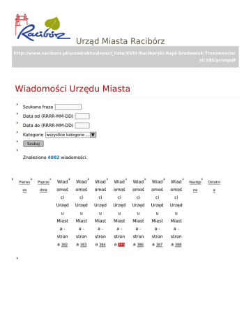 Urząd Miasta Racibórz http://www.raciborz.pl/urzad/aktualnosci_lista/XVIII-Raciborski-Rajd-Srodowisk-Trzezwoscio/ st:385/printpdf Wiadomości Urzędu Miasta Szukana fraza Data od (RRRR-MM-DD) Data do (RRRR-MM-DD) Kategorie wszystkie kategorie ... ▼ Szukaj Znaleziono 4082 wiadomości. Pierws Poprze Wiad Wiad Wiad Wiad Wiad Wiad Wiad Następ Ostatni za dnia omoś omoś omoś omoś omoś omoś omoś na a ci ci ci ci ci ci ci Urzęd Urzęd Urzęd Urzęd Urzęd Urzęd Urzęd u u u u u u u Miast Miast Miast Miast Miast Miast Miast a- a- a- a- a- a- a- stron stron stron stron stron stron stron a 382 a 383 a 384 a 385 a 386 a 387 a 388 2004-10-13 Dzień Edukacji Narodowej kategoria: Wiadomości i wydarzenia Święto pedagogów, potocznie zwane dniem nauczyciela, a ustawowo Dniem Edukacji Narodowej tradycyjnie obchodzone jest dnia 14 października. Jako święto wszystkich pracowników oświaty wprowadzono je Ustawą Karta Nauczyciela z 1982 roku. Obecnie 14 października jest dniem, w którym podczas uroczystości nagradza się również zasłużonych nauczycieli w podziękowaniu za ich trud i poświęcenie.Miejskie obchody Dnia Edukacji 2004-10-11 Awanse na stopień nauczyciela mianowanego kategoria: Wiadomości i wydarzenia Dnia 13 października br. o godz. 14.00 w Raciborskim Centrum Kultury odbędzie się spotkanie Prezydenta Miasta z nauczycielami, którzy w roku 2004r. uzyskali stopień awansu zawodowego nauczyciela mianowanego. Na spotkaniu zostaną wręczone m.in. listy gratulacyjne. Wykaz nauczycieli, którzy osiągneli ten stopień awansu zawodowego:Szkoła Podstawowa nr 1:Sebastian ŁobodaSzkoła Podstawowa nr 2:Katarzyna PolanowskaSzkoła Podstawowa nr 2004-10-07 Minister MSZ Włodzimierz Cimoszewicz w Raciborzu kategoria: Wiadomości i wydarzenia Resorty spraw zagranicznych i spraw wewnętrznych przygotowują propozycję pomocy prawnej dla obywateli, których mogłyby dotknąć roszczenia majątkowe byłych niemieckich właścicieli poinformował szef MSZ, Włodzimierz Cimoszewicz, goszczący 7 października br. z krótką wizytą w Raciborzu. W I Liceum Ogólnokształcącym im. Jana Kasprowicza w Raciborzu minister spotkał się z młodzieżą, samorządowcami i przedstawicielami 2004-10-05 Dowód osobisty dla repatriantów kategoria: Wiadomości i wydarzenia Prezydent Miasta Jan Osuchowski wręczył dziś Pani Stefani Kramarenko przybyłej w ramach ustawy o repatriacji dowód osobisty. Pochodząca z Kaliningradu z Rosji Kramarenko przyjechała do Raciborza na zaproszenie swojej siostry, z którą obecnie zamieszka. W uroczystym przekazaniu dowodu osobistego uczestniczył również wicewojewoda śląski Andrzej Waliszewski."Od stycznia 2004 r. weszła w życie nowa ustawa o repatriacji, 2004-10-05 Spotkania prezydenta z mieszkańcami kategoria: Wiadomości i wydarzenia W związku z przygotowywanym w Urzędzie Miasta materiałem na temat „Kierunków rozwoju „dzielnic” Raciborza”, prezydent miasta zaprasza mieszkańców dzielnic na spotkania. Celem spotkań jest m.in. zaznajomienie lokalnej społeczności z propozycjami planowanych inwestycji. Pierwsze spotkanie z mieszkańcami Brzezia odbędzie się dnia 6 października o godzinie 17:00 w Szkole Podstawowej nr 3 przy ulicy Myśliwca 15. 2004-10-04 Strefa płatnego parkowianaia i stawki opłat kategoria: Wiadomości i wydarzenia Od nowego roku w Raciborzu obowiązywać będzie nowa strefa płatnego parkowania. Na jej obszarze pobierane będą opłaty za parkowanie pojazdów samochodowych na drogach publicznych.Strefę płatnego parkowania wyznaczają następujące ulice: Reymonta, pl. Mostowy, Podwale, Batorego, Pocztowa, Mickiewicza, Drzymały, Wojska Polskiego, pl. Wolności, Drewniana.Miejsca do parkowania w strefie płatnego parkowania są niestrzeżone.Opłaty 2004-09-30 Podsumowano akcje "Lato w miescie 2004" kategoria: Wiadomości i wydarzenia Podczas posiedzenia Komisji Oświaty, Kultury, Sportu, Rekreacji i Opieki Społecznej Rady Miasta Racibórz omówiono przebieg tegorocznej akcji wypoczynku letniego dzieci i młodzieży w naszym mieście. Akcja, trwająca od 28.06. do 31.08.2004 miała na celu zapewnienie różnorodnej oferty wszystkim, którzy wakacje spędzają w miejscu zamieszkania (ok. 70-80 procent osób w wieku 5-19 lat).Szczegółowy program akcji wydany został drukiem 2004-09-30 Podwyżka cen biletów komunikacji miejskiej kategoria: Wiadomości i wydarzenia 2 zł, tyle będzie wynosiła opłata za bilet normalny na przejazd środkami komunikacji miejskiej zbiorowej w granicach administracyjnych miasta Raciborza. 1 zł 10 gr kosztować będzie bilet ulgowy. Tak zdecydowali radni na wczorajszym (29.09.04) posiedzeniu Rady Miasta. Za dowolną ilość przejazdów na określonej linii w ciągu miesiąca bilet imienny normalny kosztować będzie 60,00 zł, natomiast za bilet ulgowy będzie trzeba 2004-09-27 kategoria: Nagrody dla wyróżniających się animatorów kultury Wiadomości i wydarzenia Prezydent Raciborza już po raz trzeci przyznał nagrody dla wyróżniających się animatorów kultury.Od trzech lat zgłoszenia do nagrody nadsyłane są przez raciborskie instytucje upowszechniania kultury, stowarzyszenia i towarzystwa prowadzące działalność kulturalnooświatową. Wnioski bada i analizuje oraz decyduje o przyznaniu nagrody specjalnie powołana przez Prezydenta Raciborza komisja ds. przyznawania dorocznych nagród 2004-09-24 kategoria: Sesja Rady Miasta Racibórz Wiadomości i wydarzenia Najbliższa sesja Rady Miasta będzie miała miejsce 29 września 2004r. Początek posiedzenia o na godz. 14.00. Sesja odbędzie się w sali kolumnowej Urzędu Miasta Racibórz przy ul. Batorego 6. Porządek sesji:1. Otwarcie sesji.2. Przyjęcie protokołu z XXIII sesji Rady Miasta.3. Informacja o bieżących działaniach Prezydenta Miasta i realizacji uchwał Rady Miasta.4. Interpelacje, zapytania i wnioski.5. Sprawozdanie z wykonania budżetu Pierws Poprze Wiad Wiad Wiad Wiad Wiad Wiad Wiad Następ Ostat