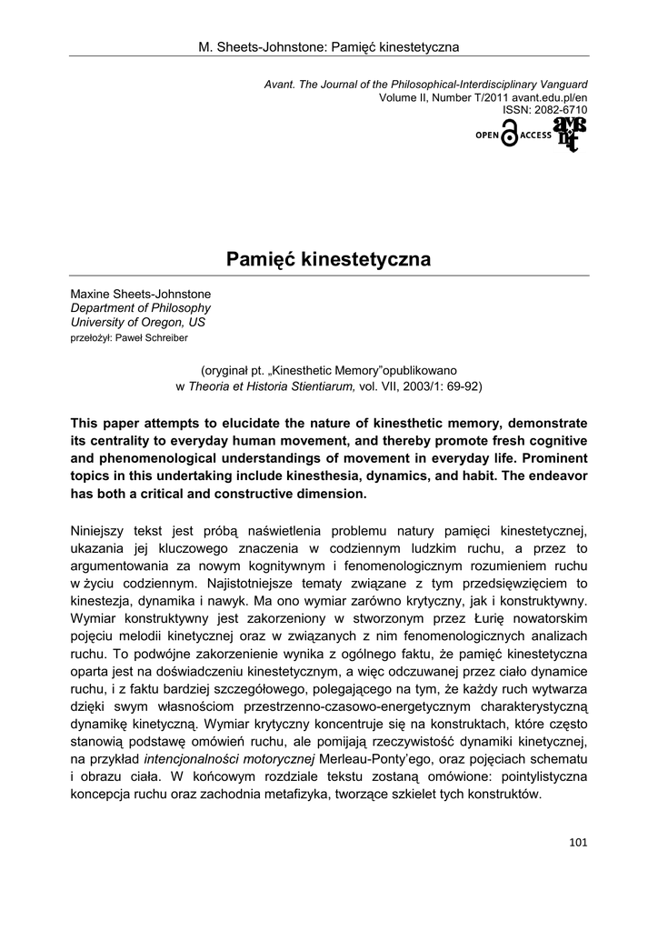 M. Sheets-Johnstone: Sheets Pamięć kinestetyczna Avant. The Journal of the Philosophical-Interdisciplinary Interdisciplinary Vanguard Volume II, Number T/2011 avant.edu.pl/en ISSN: 2082-6710 Pami kinestetyczna Pamięć Maxine Sheets-Johnstone Department of Philosophy University of Oregon, US przełożył: Paweł Schreiber (oryginał pt. „Kinesthetic Memory”opublikowano w Theoria et Historia Stientiarum, Stientiarum vol. VII, 2003/1: 69-92) 92) This paper attempts to elucidate the nature of kinesthetic memory, demonstrate its centrality ality to everyday human movement, and thereby promote fresh cognitive and phenomenological understandings of movement in everyday life. Prominent topics in this undertaking include kinesthesia, dynamics, and habit. The endeavor has both a critical and constructive con dimension. Niniejszy tekst jest próbą ą naświetlenia na wietlenia problemu natury pamięci pamię kinestetycznej, ukazania jej kluczowego znaczenia w codziennym ludzkim ruchu, a przez to argumentowania za nowym kognitywnym i fenomenologicznym fenomenologicznym rozumieniem ruchu w życiu yciu codziennym. Najistotniejsze Najistotn tematy związane zane z tym przedsięwzięciem przedsi to kinestezja, dynamika i nawyk. Ma ono wymiar zarówno krytyczny, jak i konstruktywny. Wymiar konstruktywny jest zakorzeniony w stworzonym przez Łurię Łuri nowatorskim pojęciu ciu melodii kinetycznej oraz w związanych zwi z nim fenomenologicznych analizach ruchu. To podwójne zakorzenienie wynika z ogólnego faktu, że e pamięć pami kinestetyczna oparta jest na doświadczeniu wiadczeniu kinestetycznym, a więc wi c odczuwanej przez ciało dynamice ruchu, i z faktu bardziej szczegółowego, polegającego polegaj na tym, że e każdy każ ruch wytwarza dzięki swym własnościom ciom przestrzenno-czasowo-energetycznym przestrzenno energetycznym charakterystyczną charakterystyczn dynamikę kinetyczną.. Wymiar krytyczny koncentruje się si na konstruktach, które często cz stanowią podstawę omówień ruchu, ale pomijają rzeczywistość dynamiki dynami kinetycznej, na przykład intencjonalności ci motorycznej Merleau-Ponty’ego, ’ego, oraz pojęciach poj schematu i obrazu ciała. W końcowym cowym rozdziale tekstu zostaną zostan omówione: pointylistyczna koncepcja ruchu oraz zachodnia metafizyka, tworzące twor ce szkielet tych konstruktów. konstruktów 101 AVANT Volume II, Number T/2011 www.avant.edu.pl/en Kinetycznie i kinestetycznie zorientowana neuropsychologia Łurii Rosyjski neuropsycholog Aleksander Romanowicz Łuria, uznawany za „ojca założyciela neuropsychologii” (Goldberg 1990), jest chwalony za swoje spostrzeżenia i dogłębne badania kliniczne (np. Teuber 1966, 1980; Pribram 1966, 1980). Przedstawia patologie ruchowe jako zakłócone melodie kinetyczne; ruch codzienny nie płynie już bez wysiłku, ale wręcz nie jest możliwy już u pacjentów ze zmianami w mózgu. W The Working Brain Łuria opisuje sposób konstytuowania się melodii kinetycznych na przykładzie pisania. Zauważa, że: pisanie polega na nauczeniu się na pamięć graficznego kształtu każdej z liter. Dokonuje się poprzez łańcuch izolowanych impulsów motorycznych, z których każdy jest odpowiedzialny za wykonanie tylko jednego elementu struktury graficznej; wraz z nabywaniem praktyki, ta struktura procesu zostaje radykalnie zmodyfikowana, a pisanie zmienia się w pojedynczą „melodię kinetyczną”, nie wymagającą już zapamiętywania wizualnego kształtu każdej poszczególnej litery, ani oddzielnych impulsów motorycznych dla każdego ruchu ręki. (Łuria 1973: 32) Potem opisuje on, jak świadomy ruch jest skomplikowanym systemem funkcjonalnym, wypełnianym w doskonałym wykonaniu ruchu na bazie czterech podstawowych warunków: (1) kinestetycznego przewodzenia dośrodkowego, (2) systemu współrzędnych przestrzennych skoncentrowanych wokół „układów wzrokowego i równowagi oraz układu skórnych doznań kinestetycznych”, (3) Łańcucha kolejnych ruchów, którego każdy element musi być odnerwiony po tym, jak się dokona, aby umożliwić następnemu zajęcie jego miejsca i (4) zadania motorycznego, które na bardziej skomplikowanych poziomach świadomego działania jest dyktowane przez zamiary (tamże: 35-37). Na poziomie neurologicznym świadomy ruch jest skoordynowanym rezultatem działania zupełnie różnych od siebie układów mózgowych (tamże: 37), które pracują razem w taki sposób, że rozwija się melodia kinetyczna. Kluczowe znaczenie ma spostrzeżenie Łurii, że świadomy ruch jest zjawiskiem nie tylko przestrzennym, ale i czasowym. Łuria wprowadza rozróżnienie między czasowym i przestrzennym rozmieszczeniem impulsów motorycznych w ramach stref korowych przedruchowej i zaśrodkowej, zauważając szczególnie, że przedruchowe strefy mózgu są odpowiedzialne za przetwarzanie pojedynczych impulsów motorycznych w następujące po sobie melodie kinetyczne (tamże: 179). Wcześniej jasno zaznacza, że ruch jest zawsze procesem o przebiegu czasowym, który „wymaga ciągłego łańcucha wymieniających się impulsów” (tamże: 176). W tym kontekście powtarza w ogólniejszej formie swój opis początków melodii kinetycznych: W pierwszych stadiach kształtowania się jakiegokolwiek ruchu łańcuch ten musi składać się z serii oddzielnych impulsów; wraz z rozwojem zdolności motorycznych pojedyncze impulsy zostają zsyn102 M. Sheets-Johnstone: Pamięć kinestetyczna tetyzowane i połączone w integralne struktury kinestetyc zne melodii kinetyc znych, kiedy to jeden impuls wystarcza do uruchomienia całego stereotypu dynamicznego automatycznie wymieniających się elementów (tamże: 176). Później stwierdza, że konstrukcja i wykonanie każdego złożonego ruchu zależy od: 1. Nienaruszonego płata czołowego albo tego, co określa jako intencjonalną strefą mózgową; 2. Kinestezji albo tego, co określa jako integralność jego [ruchu] kinestetycznego pr