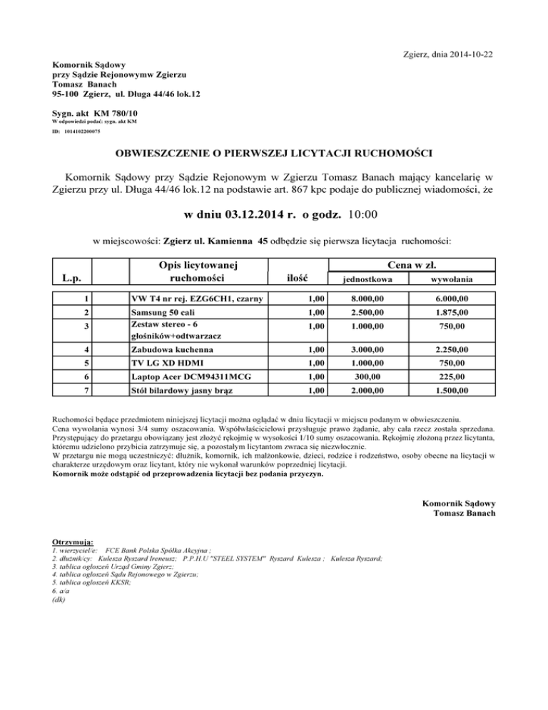 Zgierz, dnia 2014-10-22 Komornik Sądowy przy Sądzie Rejonowymw Zgierzu Tomasz Banach 95-100 Zgierz, ul. Długa 44/46 lok.12 Sygn. akt KM 780/10 W odpowiedzi podać: sygn. akt KM ID: 1014102200075 OBWIESZCZENIE O PIERWSZEJ LICYTACJI RUCHOMOŚCI Komornik Sądowy przy Sądzie Rejonowym w Zgierzu Tomasz Banach mający kancelarię w Zgierzu przy ul. Długa 44/46 lok.12 na podstawie art. 867 kpc podaje do publicznej wiadomości, że w dniu 03.12.2014 r. o godz. 10:00 w miejscowości: Zgierz ul. Kamienna 45 odbędzie się pierwsza licytacja ruchomości: Opis licytowanej ruchomości L.p. Cena w zł. ilość jednostkowa wywołania 1 VW T4 nr rej. EZG6CH1, czarny 1,00 8.000,00 6.000,00 2 1,00 2.500,00 1.875,00 3 Samsung 50 cali Zestaw stereo - 6 głośników+odtwarzacz 1,00 1.000,00 750,00 4 Zabudowa kuchenna 1,00 3.000,00 2.250,00 5 TV LG XD HDMI 1,00 1.000,00 750,00 6 Laptop Acer DCM94311MCG 1,00 300,00 225,00 7 Stół bilardowy jasny brąz 1,00 2.000,00 1.500,00 Ruchomości będące przedmiotem niniejszej licytacji można oglądać w dniu licytacji w miejscu podanym w obwieszczeniu. Cena wywołania wynosi 3/4 sumy oszacowania. Współwłaścicielowi przysługuje prawo żądanie, aby cała rzecz została sprzedana. Przystępujący do przetargu obowiązany jest złożyć rękojmię w wysokości 1/10 sumy oszacowania. Rękojmię złożoną przez licytanta, któremu udzielono przybicia zatrzymuje się, a pozostałym licytantom zwraca się niezwłocznie. W przetargu nie mogą uczestniczyć: dłużnik, komornik, ich małżonkowie, dzieci, rodzice i rodzeństwo, osoby obecne na licytacji w charakterze urzędowym oraz licytant, który nie wykonał warunków poprzedniej licytacji. Komornik może odstąpić od przeprowadzenia licytacji bez podania przyczyn. Komornik Sądowy Tomasz Banach Otrzymują: 1. wierzyciel/e: FCE Bank Polska Spółka Akcyjna ; 2. dłużnik/cy: Kulesza Ryszard Ireneusz; P.P.H.U "STEEL SYSTEM" Ryszard Kulesza ; Kulesza Ryszard; 3. tablica ogłoszeń Urząd Gminy Zgierz; 4. tablica ogłoszeń Sądu Rejonowego w Zgierzu; 5. tablica ogloszeń KKSR; 6. a/a (dk)