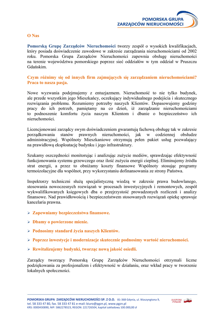 O Nas Pomorską Grupę Zarządców Nieruchomości tworzy zespół o wysokich kwalifikacjach, który posiada doświadczenie zawodowe w zakresie zarządzania nieruchomościami od 2002 roku. Pomorska Grupa Zarządców Nieruchomości zapewnia obsługę nieruchomości na terenie województwa pomorskiego poprzez sieć oddziałów w tym oddział w Pruszczu Gdańskim. Czym różnimy się od innych firm zajmujących się zarządzaniem nieruchomościami? Praca to nasza pasja. Nowe wyzwania podejmujemy z entuzjazmem. Nieruchomość to nie tylko budynek, ale przede wszystkim jego Mieszkańcy, oczekujący indywidualnego podejścia i skutecznego rozwiązania problemu. Rozumiemy potrzeby naszych Klientów. Dopasowujemy godziny pracy do ich potrzeb, pamiętamy na co dzień, iż zarządzanie nieruchomościami to podnoszenie komfortu życia naszym Klientom i dbanie o bezpieczeństwo ich nieruchomości. Licencjonowani zarządcy swym doświadczeniem gwarantują fachową obsługę tak w zakresie porządkowania stanów prawnych nieruchomości, jak w codziennej obsłudze administracyjnej. Wspólnoty Mieszkaniowe otrzymują pełen pakiet usług pozwalający na prawidłową eksploatację budynku i jego infrastruktury. Szukamy oszczędności monitorując i analizując zużycie mediów, sprawdzając efektywność funkcjonowania systemu grzewczego oraz ilość zużycia energii cieplnej. Eliminujemy źródła strat energii, a przez to obniżamy koszty finansowe Wspólnoty stosując programy termoizolacyjne dla wspólnot, przy wykorzystaniu dofinansowania ze strony Państwa. Inspektorzy techniczni służą specjalistyczną wiedzą w zakresie prawa budowlanego, stosowania nowoczesnych rozwiązań w procesach inwestycyjnych i remontowych, zespół wykwalifikowanych księgowych dba o przejrzystość prowadzonych rozliczeń i analizy finansowe. Nad prawidłowością i bezpieczeństwem stosowanych rozwiązań opiekę sprawuje kancelaria prawna. Zapewniamy bezpieczeństwa finansowe. Dbamy o powierzone mienie. Podnosimy standard życia naszych Klientów. Poprzez inwestycje i modernizacje skutecznie podnosimy wartość nieruchomości. Rewitalizujemy budynki, tworząc nową jakość osiedli. Zarządcy tworzący Pomorską Grupę Zarządców Nieruchomości otrzymali liczne podziękowania za profesjonalizm i efektywność w działaniu, oraz wkład pracy w tworzenie lokalnych społeczności. POMORSKA GRUPA ZARZĄDCÓW NIERUCHOMOŚCI SP. Z O.O. 81-368 Gdynia, ul. Waszyngtona 9, tel. 58 333 47 80, fax. 58 333 47 81 e-mail: [email protected], www.pgzn.pl KRS: 0000430890, NIP: 5862278523, REGON: 221726504, kapitał zakładowy 100.000,00 zł Oferta świadczenia usługi zarządzania nieruchomością. Szanowni Państwo, Pomorska Grupa Zarządców Nieruchomości Sp. z o.o. poniżej przestawia Państwu szczegółowy zakres świadczenia usługi. obsługę administracyjną; obsługę bankowo – księgową; obsługę prawną; obsługę techniczną; nadzór nad eksploatacją nieruchomości; Szczegółowy zakres naszej oferty: Sprawnie zarządzamy nieruchomością, utrzymujemy czystość w budynkach i dbamy o ich bieżącą konserwację. W ramach obsługi administracyjnej: Przejmujemy protokolarnie nieruchomości Wspólnot Mieszkaniowych, współwłasności, nieruchomości komercyjne wraz z dokumentacją techniczną i prawną. Przygotowujemy procedury wyodrębnienia Wspólnot z zasobów spółdzielni mieszkaniowych. Obsługujemy zebrania Wspólnot wraz z przygotowaniem pełnej dokumentacji. Negocjujemy i nadzorujemy realizację umów z dostawcami mediów i usług. Ubezpieczamy nieruchomości na zasadzie „minimalna kwota za maksymalne zabezpieczenie”. Pozyskujemy środki finansowe dla Wspólnot np. reklama na budynku, wynajem nieużywanych części wspólnych budynku (np. strych) i inne. Prowadzimy ewidencję i dokonujemy odczytów urządzeń pomiarowych w budynku. Weryfikujemy i obniżamy w racjonalny sposób moc zamówioną energii cieplnej w budynkach. Archiwizujemy dokumenty zarządzanej nieruchomości. Zapewniamy utrzymanie czystość w budynku i w jego otoczeniu wykonując usługę sprzątania, utrzymania terenów zielonych, placów zabaw. Wykonujemy nasadzenia roślin i krzewów oraz rekultywacji trawników. Zapewniamy dostęp do rozliczeń indywidualnych Właścicieli poprzez internetową kartotekę. POMORSKA GRUPA ZARZĄDCÓW NIERUCHOMOŚCI SP. Z O.O. 81-368 Gdynia, ul. Waszyngtona 9, tel. 58 333 47 80, fax. 58 333 47 81 e-mail: [email protected], www.pgzn.pl KRS: 0000430890, NIP: 5862278523, REGON: 221726504, kapitał zakładowy 100.000,00 zł W ramach obsługi finansowo - księgowej: Przygotowujemy rozliczenia eksploatacyjne nieruchomości wspólnej oraz funduszu remontowego. Przygotowujemy rozliczenia współwłasności rzeczy wspólnej; Przygotowujemy plany rzeczowo – finansowe. Zapewniamy dostęp do rozliczeń indywidualnych Właścicieli przez internetową kartotekę w ramach usługi zarządzania. Przygotowujemy roczne sprawozdanie finansowe nieruchomości. Indywidualnie rozliczamy Właścicieli nieruchomości. Dokonujemy na bieżąco analizy przychodów i kosztów utrzymania budynku. Dokonujemy bieżących płatności objętych stałymi umowami. Monitorujemy terminowość wpłat od Właścicieli. Prowadzimy windykację należności dłużników. Prowadzone przez nas remonty podnoszą wartość nieruchomości i wpływają na obniżenie kosztów eksploatacji budynków. W ramach obsługi technicznej: Zapewniamy całodobowe usunięcie awarii i jej skutków w ramach pogotowia technicznego. Na bieżąco usuwamy usterki i wykonujemy prace remontowe w budynkach. Nadzorujemy obsługę serwisową instalacji i urządzeń znajdujących się w budynkach. Sporządzamy plany remontowo – konserwacyjne wynikające z corocznych przeglądów technicznych, w tym kosztorysy inwestorskie na planowane roboty w ramach umowy o zarządzanie. Wykonujemy coroczną kontrolę techniczną ogólnobudowlaną budynku w ramach umowy o zarządzanie. Organ