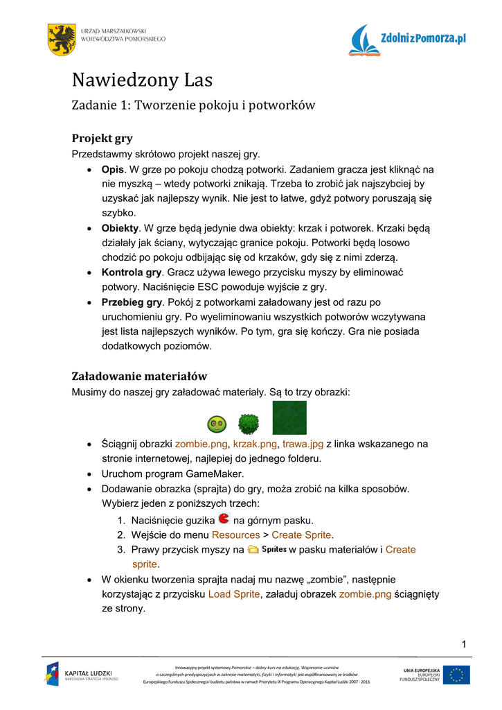 Nawiedzony Las Zadanie 1: Tworzenie pokoju i potworków Projekt gry Przedstawmy skrótowo projekt naszej gry. Opis. W grze po pokoju chodzą potworki. Zadaniem gracza jest kliknąć na nie myszką – wtedy potworki znikają. Trzeba to zrobić jak najszybciej by uzyskać jak najlepszy wynik. Nie jest to łatwe, gdyż potwory poruszają się szybko. Obiekty. W grze będą jedynie dwa obiekty: krzak i potworek. Krzaki będą działały jak ściany, wytyczając granice pokoju. Potworki będą losowo chodzić po pokoju odbijając się od krzaków, gdy się z nimi zderzą. Kontrola gry. Gracz używa lewego przycisku myszy by eliminować potwory. Naciśnięcie ESC powoduje wyjście z gry. Przebieg gry. Pokój z potworkami załadowany jest od razu po uruchomieniu gry. Po wyeliminowaniu wszystkich potworów wczytywana jest lista najlepszych wyników. Po tym, gra się kończy. Gra nie posiada dodatkowych poziomów. Załadowanie materiałów Musimy do naszej gry załadować materiały. Są to trzy obrazki: Ściągnij obrazki zombie.png, krzak.png, trawa.jpg z linka wskazanego na stronie internetowej, najlepiej do jednego folderu. Uruchom program GameMaker. Dodawanie obrazka (sprajta) do gry, moża zrobić na kilka sposobów. Wybierz jeden z poniższych trzech: 1. Naciśnięcie guzika na górnym pasku. 2. Wejście do menu Resources > Create Sprite. 3. Prawy przycisk myszy na w pasku materiałów i Create sprite. W okienku tworzenia sprajta nadaj mu nazwę „zombie”, następnie korzystając z przycisku Load Sprite, załaduj obrazek zombie.png ściągnięty ze strony. 1 Innowacyjny projekt systemowy Pomorskie – dobry kurs na edukację. Wspieranie uczniów o szczególnych predyspozycjach w zakresie matematyki, fizyki i informatyki jest współfinansowany ze środków Europejskiego Funduszu Społecznego i budżetu państwa w ramach Priorytetu IX Programu Operacyjnego Kapitał Ludzki 2007 - 2013. Powinno to wyglądać tak: Naciśnij OK, by zakończyć tworzenie. Zauważ, że obrazek pojawił się w spisie materiałów: W podobny sposób dodaj krzak.jpg jako sprajt „krzak”. Teraz na liście będą dwa obrazki: Został nam jeszcze jeden obrazek, trawa.jpg, który jednak nie jest sprajtem a tłem. Tworzenie tła również można przeprowadzić trojako, wybierz jeden ze sposobów: 1. Naciśnięcie guzika na górnym pasku. 2. Wejście do menu Resources > Create Background. 3. Prawy przycisk myszy na w pasku materiałów i Create Background Nadaj tłu nazwę „trawa”, załaduj obrazek za pomocą guzika Load Background. Trawa powinna pojawić się w spisie materiałów: Naciśnij OK. Wszystkie materiały zostały załadowane. Uwaga. Gdyby nazwy lub inne parametry się nie zgadzały, można je łatwo edytować. Wystarczy w polu ze materiałami (po lewej stronie) kliknąć dwa razy na wybrany materiał np. na . Niepotrzebne materiały można usuwać prawym przyciskiem myszy i wyborem opcji Delete. 2 Innowacyjny projekt systemowy Pomorskie – dobry kurs na edukację. Wspieranie uczniów o szczególnych predyspozycjach w zakresie matematyki, fizyki i informatyki jest współfinansowany ze środków Europejskiego Funduszu Społecznego i budżetu państwa w ramach Priorytetu IX Programu Operacyjnego Kapitał Ludzki 2007 - 2013. Tworzenie obiektów Możemy teraz przystąpić do tworzenia obiektów. Stworzymy obiekt o nazwie „zombie” na podstawie sprajta „zombie”. I znowu, są trzy sposoby na tworzenie obiektu. 1. Naciśnięcie guzika na górnym pasku. 2. Wejście do menu Resources > Create Object. 3. Prawy przycisk myszy na w pasku materiałów i Create Object Niezależnie od wyboru sposobu, dostajemy okno edycji obiektu. Nazywamy go „zombie”. Następnie musimy nadać obiektowi wygląd (załadować mu obrazek). Naciskamy na pole Sprite (lub guzik koło niego), w którym jest napis <no sprite>. Powinna wyskoczyć lista z dostępnymi obrazkami. Wybieramy naszego potworka: Przyciskamy OK. by zakończyć. Krzak tworzymy podobnie, przy czym musimy dodatkowo zaznaczyć opcję Solid (po polsku: trwały, stały), dzięki czemu nasze potworki przy zderzaniu z krzakami nie będą na nie nachodziły. Sprawdź czy w liście materiałów po lewej stronie, w spisie obiektów, znajdują się oba stworzone obiekty: Ponieważ dużo pracy za nami, zapiszmy grę klawiszem: np. pod nazwą: w naszym folderze, 3 Innowacyjny projekt systemowy Pomorskie – dobry kurs na edukację. Wspieranie uczniów o szczególnych predyspozycjach w zakresie matematyki, fizyki i informatyki jest współfinansowany ze środków Europejskiego Funduszu Społecznego i budżetu państwa w ramach Priorytetu IX Programu Operacyjnego Kapitał Ludzki 2007 - 2013. Tworzenie pokoju Mając obiekty możemy stworzyć pokój, czyli naszą planszę na której będzie rozgrywała się gra. Pokój również można stworzyć na trzy sposoby: 1. Naciśnięcie guzika na górnym pasku. 2. Wejście do menu Resources > Create Room. 3. Prawy przycisk myszy na w pasku materiałów i Create Room Niezależnie od sposobu, otworzy nam się okno edycji pokoju. Okno ma pięć zakładek. Jedną z nich jest Settings. Kliknij na nią i zmień nazwę pokoju z „room0” na „las”. Chcemy, aby nasz pokój był wyłożony trawą, którą wcześniej zaimportowaliśmy jako tło. Kliknij zakładkę backgrounds i w okienku wyboru obrazka tła: wybierz trawę naciskając na nią: Nasz pokój powinien stać się zielony. Przechodzimy do zakładki objects. Wybieramy krzak: Następnie klikamy w pokoju w kratki, w które chcemy wstawić krzaki (w przypadku pomyłki klikamy prawym przyciskiem myszy na krzak i wybieramy Delete). Krzaki trzeba wstawić na brzegach pokoju, by utworzyły ścianę. Można też dodać parę w środku pokoju. W celu ułatwienia można przytrzymać klawisz Shift , następnie dzięki wciśniętemu klawiszowy myszy można „malować” krzakami po pokoju. Rolki na myszce można użyć do powiększania i pomniejszania widoku pokoju. 4 Innowacyjny pro