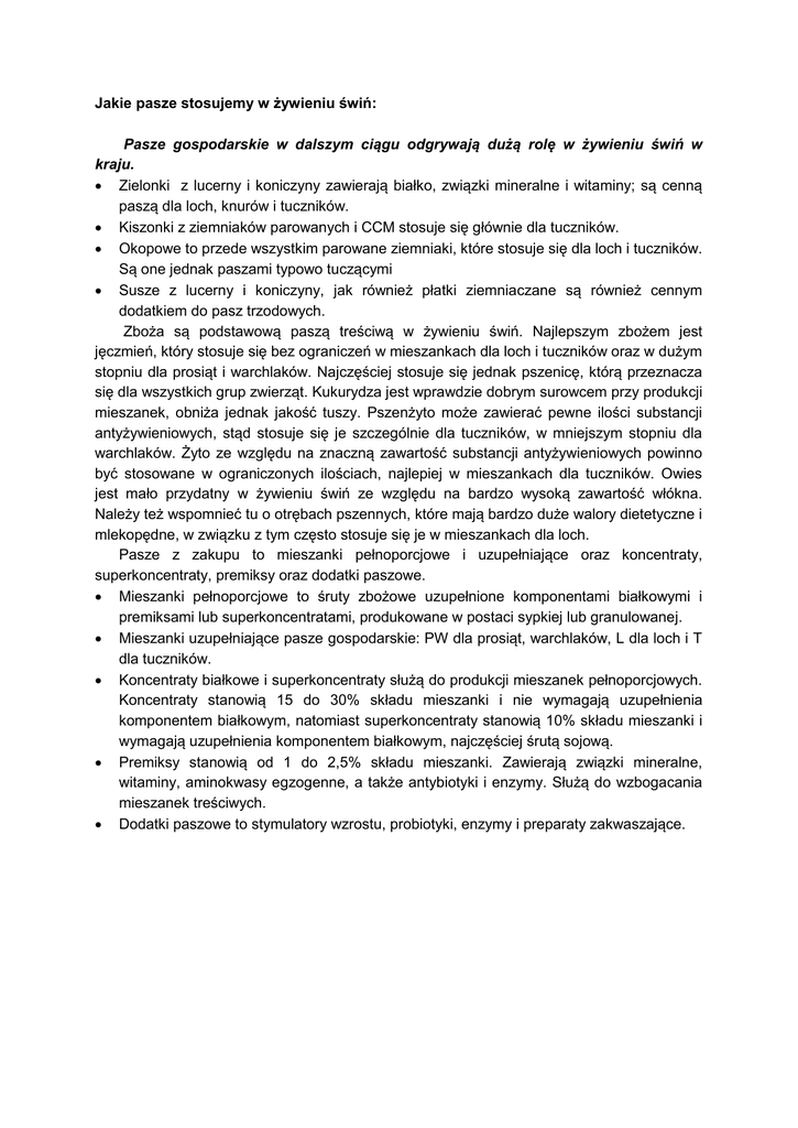 Jakie pasze stosujemy w żywieniu świń: Pasze gospodarskie w dalszym ciągu odgrywają dużą rolę w żywieniu świń w kraju. Zielonki z lucerny i koniczyny zawierają białko, związki mineralne i witaminy; są cenną paszą dla loch, knurów i tuczników. Kiszonki z ziemniaków parowanych i CCM stosuje się głównie dla tuczników. Okopowe to przede wszystkim parowane ziemniaki, które stosuje się dla loch i tuczników. Są one jednak paszami typowo tuczącymi Susze z lucerny i koniczyny, jak również płatki ziemniaczane są również cennym dodatkiem do pasz trzodowych. Zboża są podstawową paszą treściwą w żywieniu świń. Najlepszym zbożem jest jęczmień, który stosuje się bez ograniczeń w mieszankach dla loch i tuczników oraz w dużym stopniu dla prosiąt i warchlaków. Najczęściej stosuje się jednak pszenicę, którą przeznacza się dla wszystkich grup zwierząt. Kukurydza jest wprawdzie dobrym surowcem przy produkcji mieszanek, obniża jednak jakość tuszy. Pszenżyto może zawierać pewne ilości substancji antyżywieniowych, stąd stosuje się je szczególnie dla tuczników, w mniejszym stopniu dla warchlaków. Żyto ze względu na znaczną zawartość substancji antyżywieniowych powinno być stosowane w ograniczonych ilościach, najlepiej w mieszankach dla tuczników. Owies jest mało przydatny w żywieniu świń ze względu na bardzo wysoką zawartość włókna. Należy też wspomnieć tu o otrębach pszennych, które mają bardzo duże walory dietetyczne i mlekopędne, w związku z tym często stosuje się je w mieszankach dla loch. Pasze z zakupu to mieszanki pełnoporcjowe i uzupełniające oraz koncentraty, superkoncentraty, premiksy oraz dodatki paszowe. Mieszanki pełnoporcjowe to śruty zbożowe uzupełnione komponentami białkowymi i premiksami lub superkoncentratami, produkowane w postaci sypkiej lub granulowanej. Mieszanki uzupełniające pasze gospodarskie: PW dla prosiąt, warchlaków, L dla loch i T dla tuczników. Koncentraty białkowe i superkoncentraty służą do produkcji mieszanek pełnoporcjowych. Koncentraty stanowią 15 do 30% składu mieszanki i nie wymagają uzupełnienia komponentem białkowym, natomiast superkoncentraty stanowią 10% składu mieszanki i wymagają uzupełnienia komponentem białkowym, najczęściej śrutą sojową. Premiksy stanowią od 1 do 2,5% składu mieszanki. Zawierają związki mineralne, witaminy, aminokwasy egzogenne, a także antybiotyki i enzymy. Służą do wzbogacania mieszanek treściwych. Dodatki paszowe to stymulatory wzrostu, probiotyki, enzymy i preparaty zakwaszające. Najczęściej spotykane czynniki antyodżywcze w paszach. Lp. Nazwa Miejsce występowania Oddziaływanie Hamuje działanie trypsyny, obniżając 1. Inhibitory trypsyny strączkowe strawność białka Wytrącanie białek, obniżanie 2. Taniny (garbniki) peluszka, bobik, sorgo strawności paszy Nie są hydrolizowane w przewodzie 3. Oligosacharydy strączkowe, zboża pokarmowym, powodują wzdęcia i biegunki W czasie rozkładu powstają związki 4. Glukozynolany rzepak toksyczne, hypertrofia tarczycy, uszkodzenie trzustki, wątroby Oddziałują na tkankę nerwową, 5. Alkaloidy łubiny uszkadzają wątrobę Opracowała: mgr inż. Barbara Skowronek