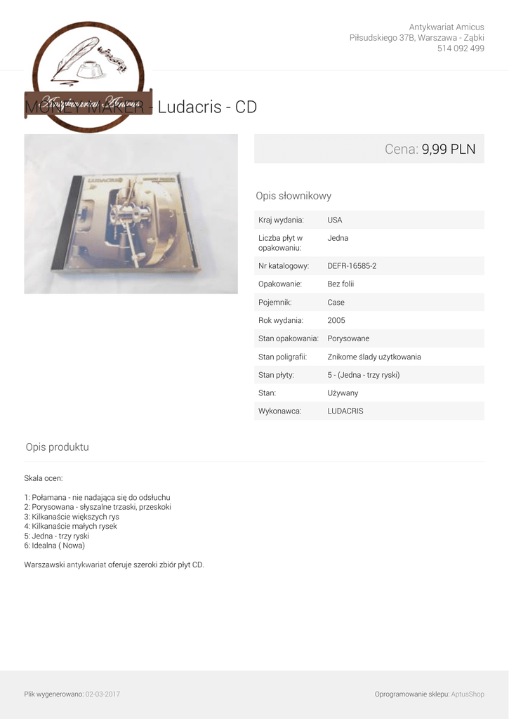 Antykwariat Amicus Piłsudskiego 37B, Warszawa - Ząbki 514 092 499 MONEY MAKER - Ludacris - CD Cena: 9,99 PLN Opis słownikowy Kraj wydania: USA Liczba płyt w opakowaniu: Jedna Nr katalogowy: DEFR-16585-2 Opakowanie: Bez folii Pojemnik: Case Rok wydania: 2005 Stan opakowania: Porysowane Stan poligrafii: Znikome ślady użytkowania Stan płyty: 5 - (Jedna - trzy ryski) Stan: Używany Wykonawca: LUDACRIS Opis produktu Skala ocen: 1: Połamana - nie nadająca się do odsłuchu 2: Porysowana - słyszalne trzaski, przeskoki 3: Kilkanaście większych rys 4: Kilkanaście małych rysek 5: Jedna - trzy ryski 6: Idealna ( Nowa) Warszawski antykwariat oferuje szeroki zbiór płyt CD. Plik wygenerowano: 02-03-2017 Oprogramowanie sklepu: AptusShop Antykwariat Amicus Piłsudskiego 37B, Warszawa - Ząbki 514 092 499 Galeria Plik wygenerowano: 02-03-2017 Powered by TCPDF (www.tcpdf.org) Oprogramowanie sklepu: AptusShop
