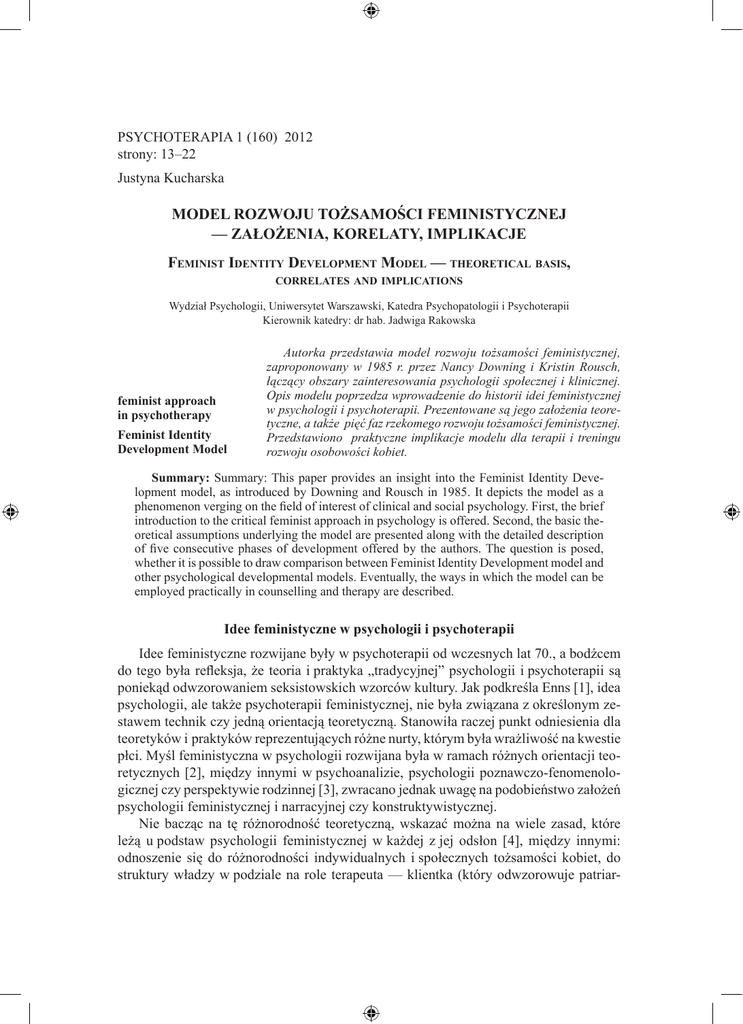 Psychoterapia 1 (160) 2012 strony: 13–22 Justyna Kucharska Model rozwoju tożsamości feministycznej — założenia, korelaty, implikacje Feminist Identity Development Model — theoretical basis, correlates and implications Wydział Psychologii, Uniwersytet Warszawski, Katedra Psychopatologii i Psychoterapii Kierownik katedry: dr hab. Jadwiga Rakowska feminist approach in psychotherapy Feminist Identity Development Model Autorka przedstawia model rozwoju tożsamości feministycznej, zaproponowany w 1985 r. przez Nancy Downing i Kristin Rousch, łączący obszary zainteresowania psychologii społecznej i klinicznej. Opis modelu poprzedza wprowadzenie do historii idei feministycznej w psychologii i psychoterapii. Prezentowane są jego założenia teoretyczne, a także pięć faz rzekomego rozwoju tożsamości feministycznej. Przedstawiono praktyczne implikacje modelu dla terapii i treningu rozwoju osobowości kobiet. Summary: Summary: This paper provides an insight into the Feminist Identity Development model, as introduced by Downing and Rousch in 1985. It depicts the model as a phenomenon verging on the field of interest of clinical and social psychology. First, the brief introduction to the critical feminist approach in psychology is offered. Second, the basic theoretical assumptions underlying the model are presented along with the detailed description of five consecutive phases of development offered by the authors. The question is posed, whether it is possible to draw comparison between Feminist Identity Development model and other psychological developmental models. Eventually, the ways in which the model can be employed practically in counselling and therapy are described. Idee feministyczne w psychologii i psychoterapii Idee feministyczne rozwijane były w psychoterapii od wczesnych lat 70., a bodźcem do tego była refleksja, że teoria i praktyka „tradycyjnej” psychologii i psychoterapii są poniekąd odwzorowaniem seksistowskich wzorców kultury. Jak podkreśla Enns [1], idea psychologii, ale także psychoterapii feministycznej, nie była związana z określonym zestawem technik czy jedną orientacją teoretyczną. Stanowiła raczej punkt odniesienia dla teoretyków i praktyków reprezentujących różne nurty, którym była wrażliwość na kwestie płci. Myśl feministyczna w psychologii rozwijana była w ramach różnych orientacji teoretycznych [2], między innymi w psychoanalizie, psychologii poznawczo-fenomenologicznej czy perspektywie rodzinnej [3], zwracano jednak uwagę na podobieństwo założeń psychologii feministycznej i narracyjnej czy konstruktywistycznej. Nie bacząc na tę różnorodność teoretyczną, wskazać można na wiele zasad, które leżą u podstaw psychologii feministycznej w każdej z jej odsłon [4], między innymi: odnoszenie się do różnorodności indywidualnych i społecznych tożsamości kobiet, do struktury władzy w podziale na role terapeuta — klientka (który odwzorowuje patriar- 14 Justyna Kucharska chalną hierarchię władzy). Jedno z głównych haseł psychologii feministycznej brzmi „to, co osobiste, jest też polityczne” [1] — procesy psychiczne jednostki i jej funkcjonowanie pozostają pod wpływem zjawisk społecznych i politycznych, tym samym nie można ich analizować w oderwaniu od kontekstu. Charakterystyczne dla psychologii feministycznej jest również postrzeganie symptomów jako sposobów na przystosowanie się i radzenie sobie z krzywdzącą sytuacją społeczną [1]. Model rozwoju tożsamości feministycznej Model rozwoju tożsamości feministycznej zaproponowany przez Nancy Downing (w późniejszych publikacjach Downing-Hansen) i Kristin Rousch [5] wpisuje się w charakterystyczny dla trzeciej fali psychologii feministycznej nurt badań nad tożsamością kobiecą [6] — kształtowaną zarówno przez patriarchalne społeczne wyobrażenia o kobiecości, jak i budowaną wokół doświadczenia zetknięcia się z treściami feministycznymi. Nie bacząc na to, co mogłaby sugerować nazwa tego modelu, odnotować należy, że ten konstrukt teoretyczny nie odnosi się do budowania wizerunku siebie jako feministki. Dotyczy raczej procesu kształtowania się postaw wobec siebie i relacji z innymi w odniesieniu do wartości uważanych za feministyczne [7]. Jego zamysł oparto na założeniu, że we współczesnym zachodnim społeczeństwie kobiety doświadczają dyskryminacji i nieustannie muszą ustosunkowywać się do tych doświadczeń [5]. Ów proces ustosunkowywania się do faktu przynależności do grupy dyskryminowanej został, obok indywidualnego wizerunku siebie jako kobiety, uznany za istotny w kształtowaniu się unikatowej, osobistej tożsamości [8]. Rickard [9] proces ten odniosła do zmian w zakresie integracji poznawczej i pojęciowej. Inspiracją dla powstania modelu rozwoju tożsamości feministycznej były prace nad konceptualizacją doświadczeń innych grup mniejszościowych — Downing i Rousch inspirowały się bezpośrednio teorią rozwoju pozytywnej tożsamości afroamerykańskiej (black identity development) [10]. Teoria Crossa [10] oparta została na założeniu, że mniejszość rasowa w Stanach Zjednoczonych nie tylko doświadcza dyskryminacji, ale także nieustannie musi mierzyć się z negatywnym wizerunkiem własnej grupy (przedstawianie Afroamerykanów jako przestępców, osoby mniej inteligentne itp.). Zdaniem Crossa, aby poradzić sobie z tego wynikającym napięciem psychicznym, Afroamerykanie muszą wytworzyć pozytywną tożsamość uwzględniającą doświadczanie dyskryminacji. Proces ewolucji owej tożsamości uwzględniono w ramach pięciostopniowego modelu. Downing i Rousch przeniosły model teoretyczny Crossa na pole doświadczeń kobiet opisując odpowiednio pięć stadiów rozwoju tożsamości feministycznej. McNamara i Rickard [2] twierdzą, że model rozwoju tożsamości feministycznej opisuje proces, przez jaki przechodzi kobieta podczas każdej terapii feministyc