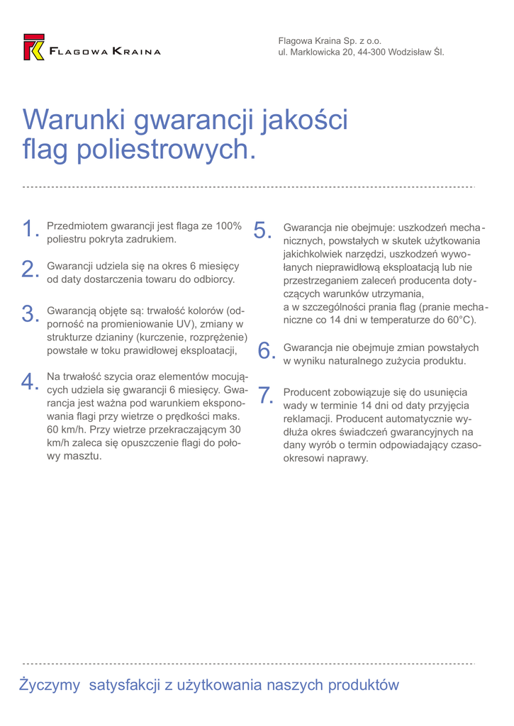 Flagowa Kraina Sp. z o.o. ul. Marklowicka 20, 44-300 Wodzisław Śl. Warunki gwarancji jakości flag poliestrowych. gwarancji jest flaga ze 100% 1. Przedmiotem 5. poliestru pokryta zadrukiem. udziela się na okres 6 miesięcy 2. Gwarancji od daty dostarczenia towaru do odbiorcy. objęte są: trwałość kolorów (od3. Gwarancją porność na promieniowanie UV), zmiany w strukturze dzianiny (kurczenie, rozprężenie) powstałe w toku prawidłowej eksploatacji, trwałość szycia oraz elementów mocują4. Na cych udziela się gwarancji 6 miesięcy. Gwarancja jest ważna pod warunkiem eksponowania flagi przy wietrze o prędkości maks. 60 km/h. Przy wietrze przekraczającym 30 km/h zaleca się opuszczenie flagi do poło- wy masztu. Gwarancja nie obejmuje: uszkodzeń mecha nicznych, powstałych w skutek użytkowania jakichkolwiek narzędzi, uszkodzeń wywołanych nieprawidłową eksploatacją lub nie przestrzeganiem zaleceń producenta dotyczących warunków utrzymania, a w szczególności prania flag (pranie mecha niczne co 14 dni w temperaturze do 60°C). nie obejmuje zmian powstałych 6. Gwarancja w wyniku naturalnego zużycia produktu. 7. Producent zobowiązuje się do usunięcia wady w terminie 14 dni od daty przyjęcia reklamacji. Producent automatycznie wydłuża okres świadczeń gwarancyjnych na dany wyrób o termin odpowiadający czasookresowi naprawy. Życzymy satysfakcji z użytkowania naszych produktów