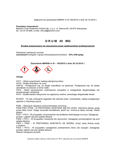 Załącznik do zezwolenia MRiRW nr R-193/2015 z dnia 30.10.2015 r. Posiadacz zezwolenia: Belchim Crop Protection Poland Sp. z o.o., ul. Sienna 82, 00-815 Warszawa, tel.: 22 24 32 885, e-mail: [email protected] D R U M 45 WG Środek przeznaczony do stosowania przez użytkowników profesjonalnych Zawartość substancji czynnej: cymoksanil (związek z grupy iminoacetylomoczników) - 45% (450 g/kg). Zezwolenie MRiRW nr R – 193/2015 z dnia 30.10.2015 r. Uwaga H317 – Może powodować reakcję alergiczną skóry. H319 - Działa drażniąco na oczy. H361fd - Podejrzewa się, że działa szkodliwie na płodność. Podejrzewa się, że działa szkodliwie na dziecko w łonie matki. H373 - Może spowodować uszkodzenie narządów w następstwie długotrwałego lub powtarzanego narażenia. H410 - Działa bardzo toksycznie na organizmy wodne, powodując długotrwałe skutki. EUH401 - W celu uniknięcia zagrożeń dla zdrowia ludzi i środowiska, należy postępować zgodnie z instrukcją użycia. P280 – Stosować rękawice ochronne/odzież ochronną. P305+P351+P338 - W PRZYPADKU DOSTANIA SIĘ DO OCZU: Ostrożnie płukać wodą przez kilka minut. Wyjąć soczewki kontaktowe, jeżeli są i można je łatwo usunąć. Nadal płukać. P337 + P313 - W przypadku utrzymywania się działania drażniącego na oczy: Zasięgnąć porady / zgłosić się pod opiekę lekarza. P308 + P313 – W przypadku narażenia lub styczności: Zasięgnąć porady/zgłosić się pod opiekę lekarza. P302 + P352 – W PRZYPADKU KONTAKTU ZE SKÓRĄ: Umyć dużą ilością wody z mydłem. P333 + P313 - W przypadku wystąpienia podrażnienia skóry lub wysypki: Zasięgnąć porady/ zgłosić się pod opiekę lekarza. Zebrać rozsypany produkt. Etykieta środka ochrony roślin Drum 45 WG, załącznik do zezwolenia MRiRW 2 OPIS DZIAŁANIA DRUM 45 WG jest środkiem grzybobójczym w formie granul do sporządzania zawiesiny wodnej o działaniu wgłębnym do stosowania interwencyjnego w ochronie ziemniaka przed zarazą ziemniaka. Środek przeznaczony do stosowania przy użyciu samobieżnych lub ciągnikowych opryskiwaczy polowych. STOSOWANIE ŚRODKA Ziemniak zaraza ziemniaka Maksymalna dawka dla jednorazowego zastosowania: 0,25 kg/ha Zalecana dawka dla jednorazowego zastosowania: 0,2 -0,25 kg/ha Środek stosować wyłącznie w mieszaninie ze środkiem grzybobójczym o działaniu powierzchniowym (kontaktowym) zawierającym jedną z następujących substancji czynnych: mankozeb (Dithane NeoTec 75 WG, Sancozeb 80 WP, Indofil 80 WP), cyjazofamid (Ranman 400 SC TwinPack, Ranman Top 160 SC), fluazynam (Altima 500 SC). Środek o działaniu powierzchniowym należy zastosować w dawce zalecanej. Termin stosowania: Środek stosować od fazy początku zakrywania międzyrzędzi do fazy początku żółknięcia liści (BBCH 31 - 91) Pierwszy zabieg wykonywać zgodnie z sygnalizacją lub: • na odmianach wczesnych - w okresie zwierania się roślin w międzyrzędziach, • na odmianach późnych - z chwilą wystąpienia pierwszych objawów choroby w danym rejonie na odmianach wczesnych. Po wykonaniu pierwszego zabiegu środkiem o działaniu układowym lub mieszaniną zawierającą środek Drum 45 WG, następne zabiegi wykonywać w miarę potrzeby co 7-14 dni. Krótszy odstęp między zabiegami co 7-10 dni zachowywać w warunkach większego zagrożenia patogenem oraz na odmianach podatnych na zarazę ziemniaka. Maksymalna liczba zabiegów w sezonie wegetacyjnym: 4 Odstęp między zabiegami: co najmniej 7-14 dni Zalecana ilość wody: 200-400 l/ha Zalecane opryskiwanie: drobnokropliste. Większą ilość wody stosować w uprawach zagęszczonych lub o silnie rozwiniętej naci ziemniaczanej. ŚRODKI OSTROŻNOŚCI I ZALECENIA STOSOWANIA ZWIĄZANE Z DOBRĄ PRAKTYKĄ ROLNICZĄ Wielokrotne stosowanie środków grzybobójczych zawierających substancje czynne o tym samym mechanizmie działania może przyczynić się do wyselekcjonowania w populacji sprawcy choroby form odpornych i w konsekwencji do obniżenia skuteczności zabiegów Z tego też względu w ramach strategii antyodpornościowej zaleca się: - włączenie do programu ochrony środków zawierających substancje czynne o różnych mechanizmach działania, - stosowanie środka wyłącznie w mieszaninie ze środkiem grzybobójczym o działaniu kontaktowym (powierzchniowym), Etykieta środka ochrony roślin Drum 45 WG, załącznik do zezwolenia MRiRW 3 - wybór środków zawierających substancję czynną cymoksanil do maksymalnie połowy przewidzianych w sezonie zabiegów. SPORZĄDZANIE CIECZY UŻYTKOWEJ Przed przystąpieniem do sporządzania cieczy użytkowej dokładnie ustalić potrzebną jej ilość. Odważoną ilość środka wymieszać w osobnym naczyniu z małą ilością wody, następnie wlać przez sito do zbiornika opryskiwacza napełnionego częściowo wodą (z włączonym mieszadłem) i uzupełnić wodą do potrzebnej ilości. Po wlaniu cieczy użytkowej do zbiornika opryskiwacza nie wyposażonego w mieszadło hydrauliczne, ciecz mechaniczne wymieszać. Opryskiwać z włączonym mieszadłem. Opróżnione opakowania po środku przepłukać trzykrotnie wodą, a popłuczyny wlać do zbiornika opryskiwacza z cieczą użytkową. POSTĘPOWANIE Z RESZTKAMI CIECZY UŻYTKOWEJ I MYCIE APARATURY Z resztkami cieczy użytkowej po zabiegu należy postępować w sposób ograniczający ryzyko skażenia wód powierzchniowych i podziemnych w rozumieniu przepisów Prawa wodnego oraz skażenia gruntu, tj.: – po uprzednim rozcieńczeniu zużyć na powierzchni, na której przeprowadzono zabieg, jeżeli jest to możliwe lub – unieszkodliwić z wykorzystaniem rozwiązań technicznych zapewniających biologiczną degradację substancji czynnych środków ochrony roślin lub – unieszkodliwić w inny sposób, zgodny z przepisami o odpadach. Po pracy aparaturę dokładnie wymyć. WARUNKI BEZPIECZNEGO STOSOWANIA ŚRODKA Przed zastosowaniem środka należy poinformować o tym fakcie wszystkie zainteresowane