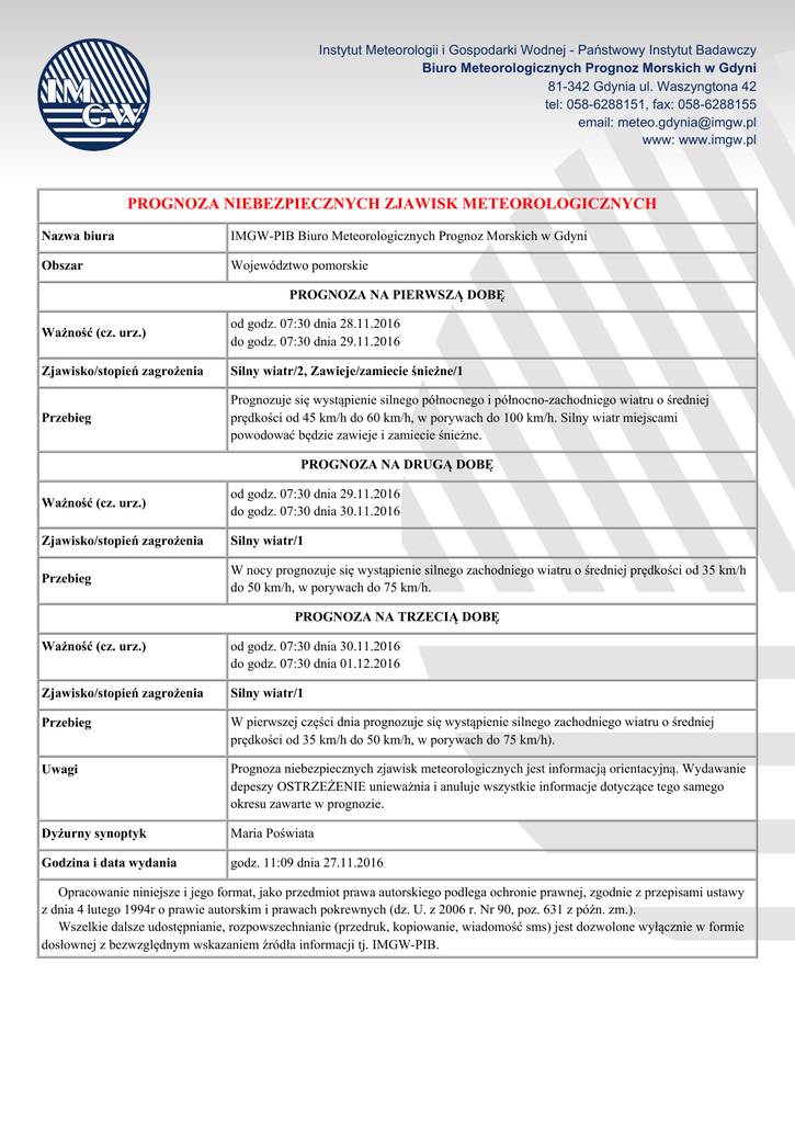 Instytut Meteorologii i Gospodarki Wodnej - Państwowy Instytut Badawczy Biuro Meteorologicznych Prognoz Morskich w Gdyni 81-342 Gdynia ul. Waszyngtona 42 tel: 058-6288151, fax: 058-6288155 email: [email protected] www: www.imgw.pl PROGNOZA NIEBEZPIECZNYCH ZJAWISK METEOROLOGICZNYCH Nazwa biura IMGW-PIB Biuro Meteorologicznych Prognoz Morskich w Gdyni Obszar Województwo pomorskie PROGNOZA NA PIERWSZĄ DOBĘ Ważność (cz. urz.) od godz. 07:30 dnia 28.11.2016 do godz. 07:30 dnia 29.11.2016 Zjawisko/stopień zagrożenia Silny wiatr/2, Zawieje/zamiecie śnieżne/1 Przebieg Prognozuje się wystąpienie silnego północnego i północno-zachodniego wiatru o średniej prędkości od 45 km/h do 60 km/h, w porywach do 100 km/h. Silny wiatr miejscami powodować będzie zawieje i zamiecie śnieżne. PROGNOZA NA DRUGĄ DOBĘ Ważność (cz. urz.) od godz. 07:30 dnia 29.11.2016 do godz. 07:30 dnia 30.11.2016 Zjawisko/stopień zagrożenia Silny wiatr/1 Przebieg W nocy prognozuje się wystąpienie silnego zachodniego wiatru o średniej prędkości od 35 km/h do 50 km/h, w porywach do 75 km/h. PROGNOZA NA TRZECIĄ DOBĘ Ważność (cz. urz.) od godz. 07:30 dnia 30.11.2016 do godz. 07:30 dnia 01.12.2016 Zjawisko/stopień zagrożenia Silny wiatr/1 Przebieg W pierwszej części dnia prognozuje się wystąpienie silnego zachodniego wiatru o średniej prędkości od 35 km/h do 50 km/h, w porywach do 75 km/h). Uwagi Prognoza niebezpiecznych zjawisk meteorologicznych jest informacją orientacyjną. Wydawanie depeszy OSTRZEŻENIE unieważnia i anuluje wszystkie informacje dotyczące tego samego okresu zawarte w prognozie. Dyżurny synoptyk Maria Poświata Godzina i data wydania godz. 11:09 dnia 27.11.2016 Opracowanie niniejsze i jego format, jako przedmiot prawa autorskiego podlega ochronie prawnej, zgodnie z przepisami ustawy z dnia 4 lutego 1994r o prawie autorskim i prawach pokrewnych (dz. U. z 2006 r. Nr 90, poz. 631 z późn. zm.). Wszelkie dalsze udostępnianie, rozpowszechnianie (przedruk, kopiowanie, wiadomość sms) jest dozwolone wyłącznie w formie dosłownej z bezwzględnym wskazaniem źródła informacji tj. IMGW-PIB.