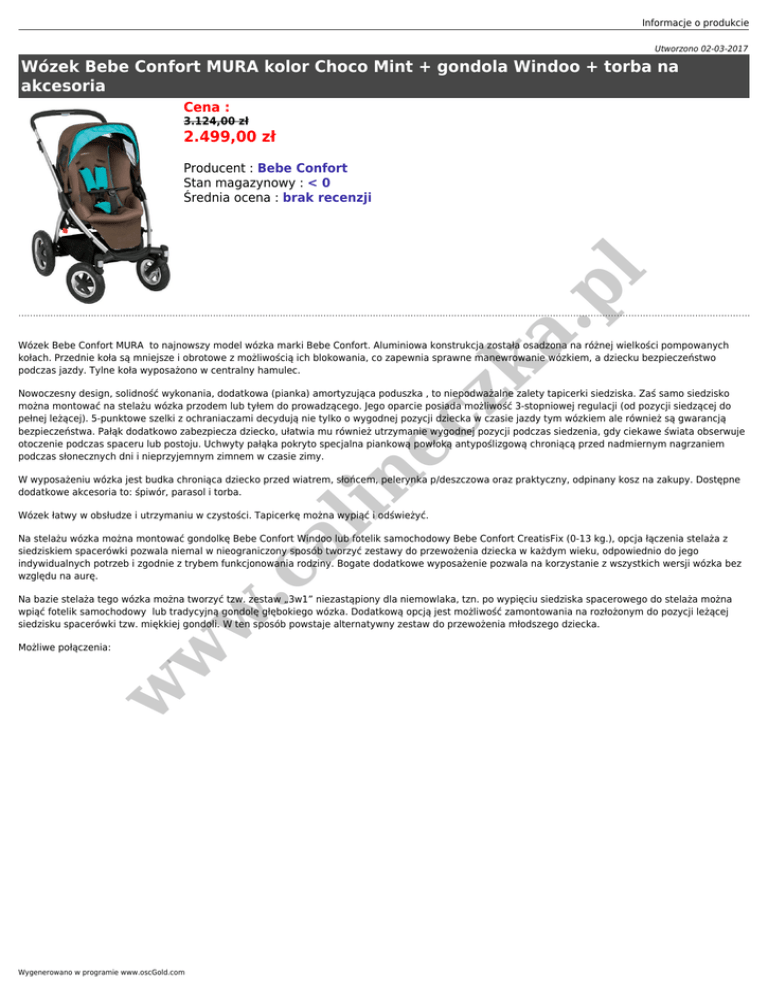 Informacje o produkcie Utworzono 02-03-2017 Wózek Bebe Confort MURA kolor Choco Mint + gondola Windoo + torba na akcesoria Cena : 3.124,00 zł 2.499,00 zł zk a. pl Producent : Bebe Confort Stan magazynowy : < 0 Średnia ocena : brak recenzji Wózek Bebe Confort MURA to najnowszy model wózka marki Bebe Confort. Aluminiowa konstrukcja została osadzona na różnej wielkości pompowanych kołach. Przednie koła są mniejsze i obrotowe z możliwością ich blokowania, co zapewnia sprawne manewrowanie wózkiem, a dziecku bezpieczeństwo podczas jazdy. Tylne koła wyposażono w centralny hamulec. in ec Nowoczesny design, solidność wykonania, dodatkowa (pianka) amortyzująca poduszka , to niepodważalne zalety tapicerki siedziska. Zaś samo siedzisko można montować na stelażu wózka przodem lub tyłem do prowadzącego. Jego oparcie posiada możliwość 3-stopniowej regulacji (od pozycji siedzącej do pełnej leżącej). 5-punktowe szelki z ochraniaczami decydują nie tylko o wygodnej pozycji dziecka w czasie jazdy tym wózkiem ale również są gwarancją bezpieczeństwa. Pałąk dodatkowo zabezpiecza dziecko, ułatwia mu również utrzymanie wygodnej pozycji podczas siedzenia, gdy ciekawe świata obserwuje otoczenie podczas spaceru lub postoju. Uchwyty pałąka pokryto specjalna piankową powłoką antypoślizgową chroniącą przed nadmiernym nagrzaniem podczas słonecznych dni i nieprzyjemnym zimnem w czasie zimy. W wyposażeniu wózka jest budka chroniąca dziecko przed wiatrem, słońcem, pelerynka p/deszczowa oraz praktyczny, odpinany kosz na zakupy. Dostępne dodatkowe akcesoria to: śpiwór, parasol i torba. .c al Wózek łatwy w obsłudze i utrzymaniu w czystości. Tapicerkę można wypiąć i odświeżyć. Na stelażu wózka można montować gondolkę Bebe Confort Windoo lub fotelik samochodowy Bebe Confort CreatisFix (0-13 kg.), opcja łączenia stelaża z siedziskiem spacerówki pozwala niemal w nieograniczony sposób tworzyć zestawy do przewożenia dziecka w każdym wieku, odpowiednio do jego indywidualnych potrzeb i zgodnie z trybem funkcjonowania rodziny. Bogate dodatkowe wyposażenie pozwala na korzystanie z wszystkich wersji wózka bez względu na aurę. w w Możliwe połączenia: w Na bazie stelaża tego wózka można tworzyć tzw. zestaw „3w1” niezastąpiony dla niemowlaka, tzn. po wypięciu siedziska spacerowego do stelaża można wpiąć fotelik samochodowy lub tradycyjną gondolę głębokiego wózka. Dodatkową opcją jest możliwość zamontowania na rozłożonym do pozycji leżącej siedzisku spacerówki tzw. miękkiej gondoli. W ten sposób powstaje alternatywny zestaw do przewożenia młodszego dziecka. Wygenerowano w programie www.oscGold.com pl zk a. ec in .c al w w Charakterystyka wózka: ● ● ● ● ● ● ● ● ● ● ● ● ● nowoczesny wózek spacerowy z dwoma kołami z przodu pompowane koła - łatwe do demontażu, co ułatwia czyszczenie i przewóz samochodem siedzisko można ustawiać przodem i tyłem do kierunku jazdy obrotowe koła przednie z możliwością blokady przyciskiem tylne zawieszenie na sprężynach, co zwiększa komfort jazdy ergonomicznie zaprojektowany pedał tylniego hamulca aluminiowy, anodyzowany stelaż wózka teleskopowo regulowana wysokość rączki pałąk bezpieczeństwa, zapobiegający wysuwaniu sie dziecka delikatne, miękkie siedzisko z 5 punktowymi szelkami i łatwym zapięciem regulowana (2 pozycje) wysokość systemu szelek, co zwiększa bezpieczeństwo przewożenia dziecka rozkładane aż do pozycji leżącej oparcie spacerówki - w sumie trzy poziomy regulacji, łatwe w utrzymaniu czystości pokrycie siedziska łatwy demontaż i montaż siedziska - system seat & click Wymiary: siedzisko (szer.x głębokość): 31 x 30cm oparcie (wys.x szer.): 45 x 34cm długość podnóżka: 10cm wysokość rączki: 98-106cm średnica kół (przód/tyl): 25/30cm wózek złożony: 48 x 65 x 73 cm. wózek rozłożony: 65 x 95 x 98-106 cm w ● ❍ ❍ ❍ ❍ ❍ ❍ ❍ Informacje o produkcie ❍ Waga stelaża z kołami: 11kg Waga siedziska spacerowego: 5kg w w w .c al in ec zk a. pl ❍ Wygenerowano w programie www.oscGold.com