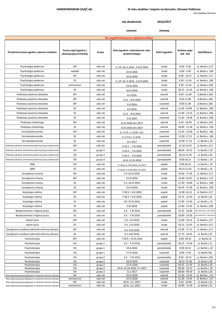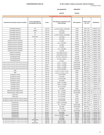 HARMONOGRAM ZAJĘĆ dla III roku studiów I stopnia na kierunku: Zdrowie Publiczne rok studiów, kierunek rok akademicki 2016/2017 semestr zimowy Do wypełnienia przez Opiekuna Roku Forma zajęć (zgodna z obowiązującą Uchwałą) Grupa Data (zgodnie z kalendarzem roku akademickiego) Dzień tygodnia Godziny zajęć (od - do) Psychologia społeczna WY cały rok 5, 19 i 26. X.2016 ; 2,9.XI.2016 środa 8.00 - 9.30 ul. Bartla s.117 Psychologia społeczna wykład cały rok 23.XI.2016 środa 8.00 - 9.30 ul. Bartla s. 106 Psychologia społeczna WY cały rok 16.XI.2016 środa 8.00 - 10.15 ul. Bartla s.117 Psychologia społeczna SE cały rok 5, 19 i 26. X.2016 ; 2,9.XI.2016 środa 9.30 - 11.45 ul. Bartla s. 206 Psychologia społeczna seminarium cały rok 23.XI.2016 środa 9.30 - 11.45 ul. Bartla s.106 Psychologia społeczna SE cały rok 16.XI.2016 środa 10.15 - 11.45 ul. Bartla s. 206 Podstawy żywienia człowieka WY cały rok 4.X.2016 wtorek 8.00 - 11.00 ul.Bartla s.106 Podstawy żywienia człowieka WY cały rok 11.X. - 8.XI.2016 wtorek 8.45-11.00 ul.Bartla s.106 Podstawy żywienia człowieka WY cały rok 3.XI.2016 czwartek 8.00-11.00 ul.Bartla s.106 Podstawy żywienia człowieka SE cały rok 4.X.2016 wtorek 11.00 - 14.00 ul. Bartla s. 206 Podstawy żywienia człowieka SE cały rok 11.X. - 8.XI.2016 wtorek 11.00 - 13.15 ul. Bartla s. 206 Podstawy żywienia człowieka SE cały rok 3.XI.2016 czwartek 11.00 - 14.00 ul. Bartla s. 206 Podstawy marketingu WY cały rok 15.XI.2016-24.I.2017 wtorek 8.30 - 10.00 ul. Bartla s.105 Podstawy marketingu SE cały rok 15.XI.2016-24.I.2017 wtorek 10.00 - 11.30 ul. Bartla s. 106 Farmakoekonomika WY cały rok 3 i 17.XI.; 1 i 8.XII. 12.I. czwartek 12.45 - 15.00 ul. Bartla s. 106 Farmakoekonomika SE cały rok 3 i 17.XI.; 1 i 8.XII. czwartek 15.00 -17.15 ul. Bartla s. 106 Przedmiot (nazwa zgodna z planem studiów) Sala/Miejsce Farmakoekonomika SE cały rok 12.I.2017 czwartek 15.00 -17.15 ul. Bartla s. 25 Podstawy edukacji zdrowotnej wybranych grup społecznych WY cały rok 3-24.X. ; 7.XI.2016 poniedziałek 12.30-14.45 ul. Bartla s.117 Podstawy edukacji zdrowotnej wybranych grup społecznych CN grupa 1 3-24.X. ; 7.XI.2016 poniedziałek 08.00 - 10.15 ul. Bartla s. 20 Podstawy edukacji zdrowotnej wybranych grup społecznych CN grupa 2 3-24.X. ; 7.XI.2016 poniedziałek 10.15-12.30 ul. Bartla s.20 Podstawy edukacji zdrowotnej wybranych grup społecznych CN grupa 3 14.XI-12.XII.2016 poniedziałek 8.00-10.15 ul. Bartla s. 20 EBM WY cały rok 4 i 18.XI; 2 i 9.XII.2016; 13.I.2017 piątek 8.00-10.15 ul. Bartla s. 25 EBM SE cały rok 4 i 18.XI; 2 i 9.XII.2016; 13.I.2017 piątek 10.15-11.45 ul. Bartla s. 25 Zarządzanie zmianą WY cały rok 5.X-16.XI.2016 środa 16.00 - 17.30 ul. Bartla s.117 Zarządzanie zmianą WY cały rok 23.XI.2016 środa 16.00 -16.45 ul. Bartla s. 117 Zarządzanie zmianą SE cały rok 5.X.-16.XI.2016 środa 17.30 - 19.00 ul. Bartla s. 106 Zarządzanie zmianą SE cały rok 23.XI.2016 środa 16.45 - 17.30 ul. Bartla s. 106 Socjologia rodziny WY cały rok 7-28.X. i 4.XI.2016 piątek 12.00 -14.15 ul. Bartla s.117 Socjologia rodziny SE cały rok 7-28.X. i 4.XI.2016 piątek 14.15 - 15.45 ul. Bartla s.25 Socjologia rodziny SE cały rok 18 i 25.XI.2016 piątek 12.00 - 13.30 ul. Bartla s. 25 Socjologia rodziny SE cały rok 2.XII.2016 piątek 12.00 - 12.45 ul. Bartla s.106 Bezpieczeństwo i higiena pracy WY cały rok 3.X. - 7.XI.2016 poniedziałek 15.45 - 18.00 Sala 348 USzK ul. Borowska Bezpieczeństwo i higiena pracy SE cały rok 3.X. - 7.XI.2016 poniedziałek 18.00 - 19.30 Sala 348 USzK ul. Borowska Jakość życia WY cały rok 5.X.-2.XI.2016 środa 12.00 - 14.15 ul. Bartla s.117 Jakość życia SE cały rok 5.X.-2.XI.2016 środa 14.15 - 15.45 ul. Bartla s.117 Zarządzanie zasobami jednostki ochrony zdrowia WY cały rok 4.X.-8.XI.2016 wtorek 15.00 - 17.15 ul. Bartla s.117 Zarządzanie zasobami jednostki ochrony zdrowia SE cały rok 4.X.-8.XI.2016 wtorek 17.15 - 18.45 ul. Bartla s.25 Psychoterapia WY cały rok 7-28.X. i 25.XI.2016 piątek 8.00 -10.15 ul. Bartla 25 Psychoterapia CN grupa 1 3.X. - 7.XI.2016 poniedziałek 10.15 - 12.30 ul. Bartla s.11 Psychoterapia CN grupa 1 10.X.2016 poniedziałek 8.00-10.15 ul. Bartla s. 10 Psychoterapia CN grupa 1 17.XI.2016 czwartek 8.00 - 9.30 ul. Bartla 202 Psychoterapia CN grupa 2 3.X. - 7.XI.2016 poniedziałek 8.00 - 10.15 ul. Bartla s.202 Psychoterapia Psychoterapia Psychoterapia Psychoterapia CN CN CN CN WY seminarium WY seminarium grupa 2 grupa 2 grupa 3 grupa 3 cały rok cały rok cały rok cały rok 10.XI.2016 17.XI.2016 24.XI.-22.XII.2016 i 5.I.2017 12.I.2017 15.XI.2016 22.XI.2016 30.XI.-11.I.2017 30.XI.-11.I.2017 czwartek czwartek czwartek czwartek wtorek wtorek środa środa 10.15 -12.30 10.15 - 11.45 08.00 - 10.15 08.00 - 09.30 11.30 - 13.45 11.30 - 13.45 8.30 - 10.00 10.00 - 11.30 ul. Bartla s.20 ul. Bartla s.20 ul. Bartla s. 20 ul. Bartla s.20 ul. Bartla s. 117 ul. Bartla s. 117 ul. Bartla s.25 ul. Bartla s.25 Rola organizacji pozarządowych w systemie ochrony zdrowia Rola organizacji pozarządowych w systemie ochrony zdrowia Rola organizacji pozarządowych w systemie ochrony zdrowia Rola organizacji pozarządowych w systemie ochrony zdrowia 1/1