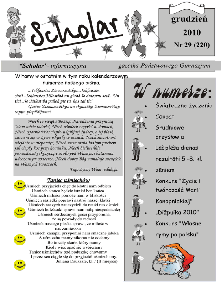 grudzień 2010 Nr 29 (220) gazetka Państwowego Gimnazjum “Scholar”“Scholar” - informacyjna informacyjna gazetka Polskiej Szkoły w Daugavpilsie Witamy w ostatnim w tym roku kalendarzowym numerze naszego pisma. ...Ieklausies Ziemassvētkos...Ieklausies sirdī...Ieklausies Mīlestībā un glabā šo dziesmu sevī...Un tici...Jo Mīlestība paliek pie tā, kas tai tic! Gaišus Ziemassvētkus un skaistāko Ziemassvētku sapņu piepildījumu! Niech te święta Bożego Narodzenia przyniosą Wam wiele radości, Niech uśmiech zagości w domach, Niech ogarnie Was ciepło wigilijnej świecy, a jej blask zamieni się w żywe iskierki w oczach, Niech samotność odejdzie w niepamięć, Niech zima otula białym puchem, jak ciepły koc przy kominku, Niech bieluteńkie gwiazdeczki skrzypią wesoło pod Waszymi butamina wieczornym spacerze. Niech dobry Bóg namaluje szczęście na Waszych twarzach. Tego życzy Wam redakcja Taniec uśmiechów Uśmiech przyjaciela chęć do kłótni nam odbiera Uśmiech słońca będzie istniał bez końca Uśmiech miłości pomoże nam w bliskości Uśmiech sąsiadki poprawi nastrój naszej klatki Uśmiech naszych nauczycieli do nauki nas ośmieli Uśmiech koleżanki sprawi nam miłą niespodziankę Uśmiech serdecznych gości przypomina, że są powody do radości Uśmiech naszego pieska sprawi, że miłość w nas zamieszka Uśmiech kanapki przypomni nam smaczne jabłka A uśmiechu mamy nikomu nie oddamy Bo to cały skarb, który mamy Kiedy więc spać się wybieramy Taniec uśmiechów pod poduszkę chowamy I przez sen ciągle się do przyjaciół uśmiechamy. Juliana Daukszte, kl.7 (II miejsce) Świąteczne życzenia Сократ Grudniowe przysłowia Lāčplēša dienas rezultāti 5.-8. kl. zēniem Konkurs "Życie i twórczość Marii Konopnickiej" „Dižpuika 2010” Konkurs "Własne rymy po polsku" Strona 2 Katru gadu pilsētas Jaunrades na ma rī ko ta is k o n k u r s s „Dižpuika” pulcē lielu dalībnieku skaitu, šogad tie bija pilsētas skolu 60 5.-6. klašu zēni. Mūsu ģimnāziju pārstāvēja P. Kozirevs, P. Šuksts (6.kl.) un A. Kazačonoks (5.kl.).Zēni rādīja savas prasmes kārtingā, automodelismā, mašīnas riepu maiņā, datorspēlēs, naglu dzīšanā, peldēšanā, orientēšanā, basketbola soda metienos, biatlonā, šķēršļu joslas pārvarēšanā u.c. aktivitātēs.Visi cīnījās godam trīs mēnešus. P.Šuksts un A. Kazačonoks tika apbalvoti ar pateicības goda rakstiem par piedalīšanos konkursā, bet P. Kozirevs iekļuva finālā ar izcīnīto 2. vietu un 8 punktiem. Fināls Pēteri sagaidīja ar jauniem uzdevumiem- vajadzēja rādīt savu erudīciju, prasmi servēt galdu, dejot valsi u.c.Bargā un taisnīgā ţūrija skaitīja punktus.Kopvērtējumā mūsu Pēteris savāca vislielāko punktu skaitu un izcīnīja 1. vietu kļūstot par „Diţpuiku 2010” Daugavpilī. Decembrī Pēteris dosies uz Rīgu uz lielo Latvijas finālu, kur cīnīsies par galveno balvu. Turēsim īķšķus par Pēteri, lai viņam izdodas! “My English teacher’s name is Nina Šukste “My English teacher’s name is Nina Šukste and she’s been teaching me English since upper school and doing it really good. I like her lessons very much because of all the nice activities she’s giving us. Our teacher tries to give an example to each theme we are studying, our class liked the weeks days theme, when we watched the Friday vs. Monday clip, it was really funny, all the children laughed a lot and we are always remembering it then Monday and Friday comes. Even the tests we do like, because they are quite interesting. First, our teacher shows us some clips and then we are writing what we see where or describing the picture. I think this is the best way to learn the language- it’s to see how it’s used in practise. That’s what our teacher always says to usthe picture is the best way to learn and we all agree. After these lessons its fun to watch other clips at home with the better understanding and knowlendge. I love English lessons and hope all the schools have the same attractive English teacher as we do J” n Vents Kristofers Lietavietis, Lāčplēša dienas rezultāti 5.-8. kl. zēniem. Trāpi mērķī 1. vieta T. Žonds 8. kl A. Zeiza 8. kl D. Macuks 7. kl J. Mihailovs 7. kl 2. vieta Ž.Lizbovskis 5. kl 3. vieta A. Jermakovs Zivju ķeršana 1. vieta P. Kozirevs 6.kl 2. vieta J. Mihailovs 7.kl 3. vieta R. Ancāns 6. kl A. Černomordijs 8. kl Lidojošie šķīvīši 1.vieta P. Čornijs 7.kl. 2. vietaE. Bovins 6. kl A. Černomordijs 8. kl P. Kozirevs 6. kl 3. vieta J. Lavrinovičs 6. kl Basketbola soda metieni 1. vieta T. Zonds 8. kl 2. vieta E. Bovins 8. kl 3. vieta A. Černomordijs 8. kl Šķēršļu josla 1. vieta A. Černomordijs 8. kl T. Ţonds 8. kl 2. vieta E. Bovins 8. kl Grudniowe przysłowia „Jak się grudzień zaczyna – taka będzie cała zima” „Kiedy w grudniu przyjdzie zima – mróz na długo wiosnę wstrzyma”. „Jeśli w grudniu często dmucha, to w marcu i kwietniu plucha”. Strona 3 W radiu cicha muzyka.. Zegar powoli tyka... Myszka wydaje kliki... Z ulicy dochodzą krzyki... Ciągle myśli o tobie... Jak o kochanej osobie... Прежде чем что-нибудь говорить, нужно трижды просеять это... Один человек пришел к Сократу и спросил: - А знаешь что мне сказал о тебе твой друг? - Подожди, - остановил его Сократ, - Просей сначала то, что собираешься сказать, через три сита. - Три сита? Litery na papierze... Tysiąc słów w codziennym eterze... - Прежде чем что-нибудь говорить, нужно трижды просеять Życie jak koło się toczy... Każdy dzień ku końcowi się mroczy... это. Во-первых, через сито правды: ты уверен, что то, что ты скажеш